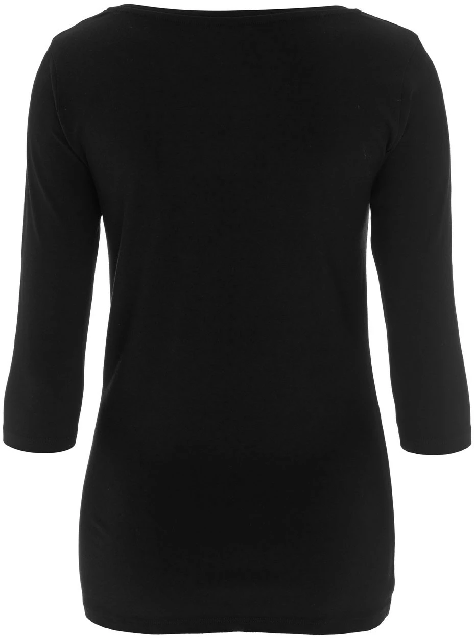 Leicht tailliert geschnittenes Shirt mit 3/4-Arm, weitem Halsausschnitt und schmaler aufgesetzter Rippbund am Halsausschnitt. Das Material ist angenehm weich und blickdicht.