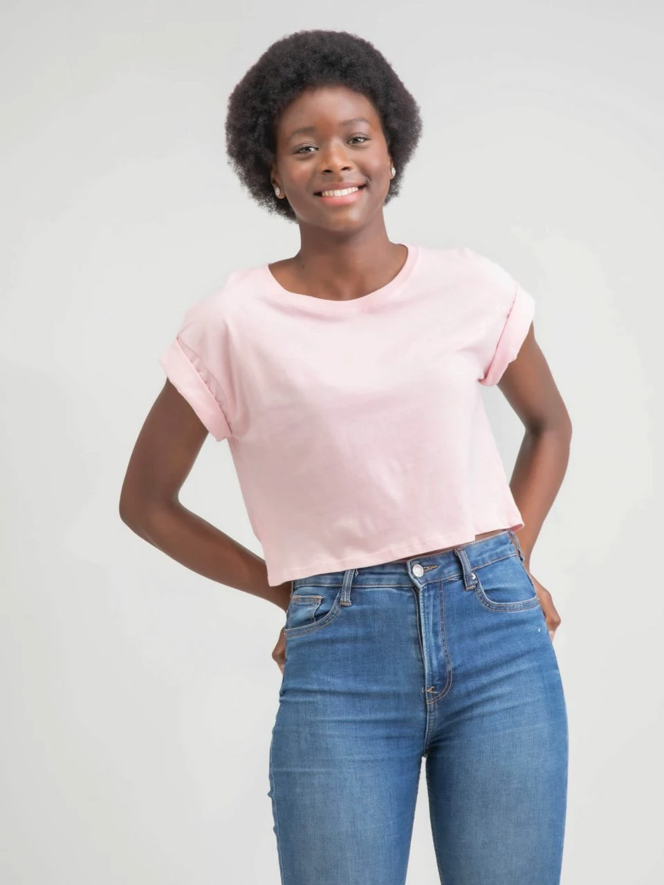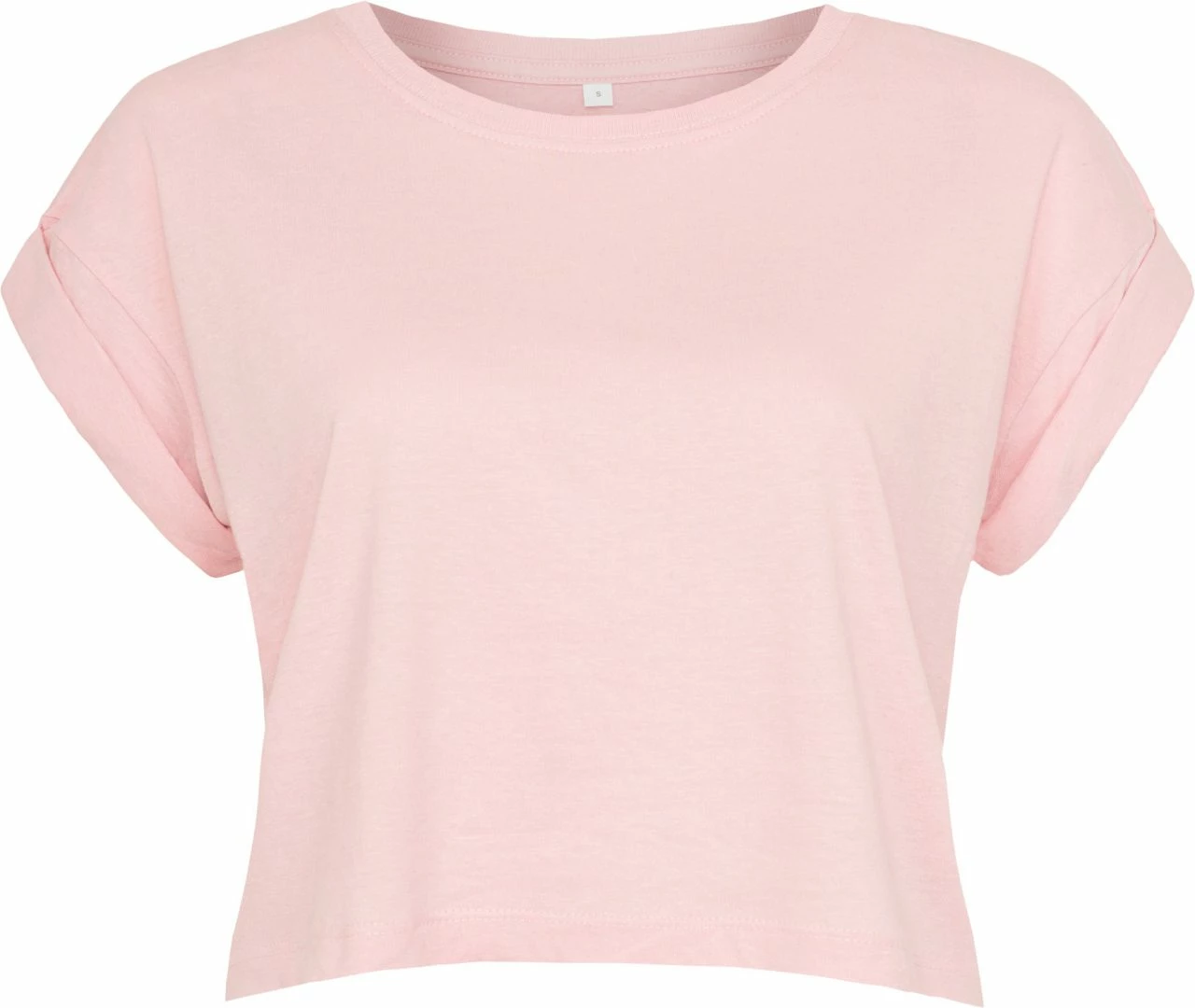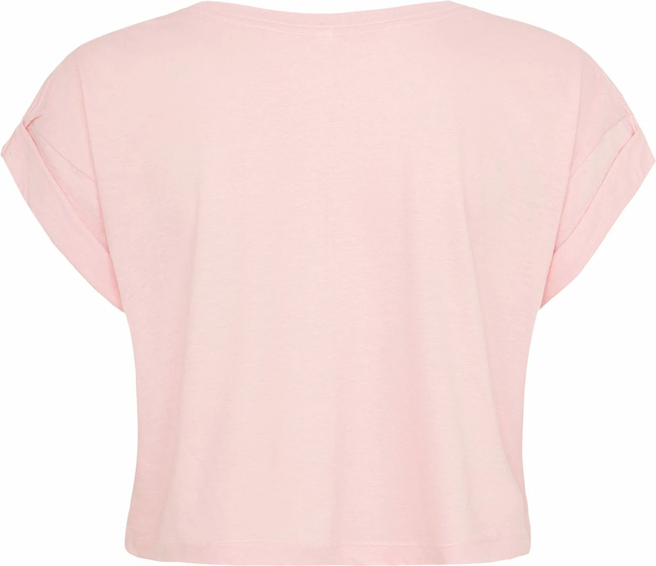 Weit und bauchfrei geschnittenes T-Shirt aus reiner Bio-Baumwolle. Das T-Shirt besteht aus sommerlich leichtem und sehr weichem Jersey-Stoff. Der Kragen ist mit einem schmalen Rippbund eingefasst, die Ärmelenden sind aufgerollt und abnäht.