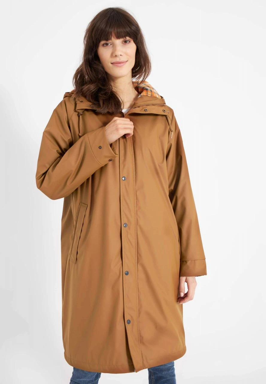 Nachhaltig produzierter Damen Regenmantel WITTHOLM von der Hamburger Marke Derbe. Konzipiert für das intensive, norddeutsche Wetter ist die lange Regenjacke mit weichem Fleece-Futter ganz sicher auch ein verlässlicher Begleiter in südlicheren Gefilden. Das äußere Material aus recyceltem Polyester ist mit einer Polyurethan-Beschichtung versehen und schützt vor Wind und Wasser. Die Nähte an den kritischen Stellen sind zudem versiegelt. Der Mantel ist gerade und etwas lockerer geschnitten, sodass er auch in Kombination mit dicken Pullis oder Sweatjacken getragen werden kann.