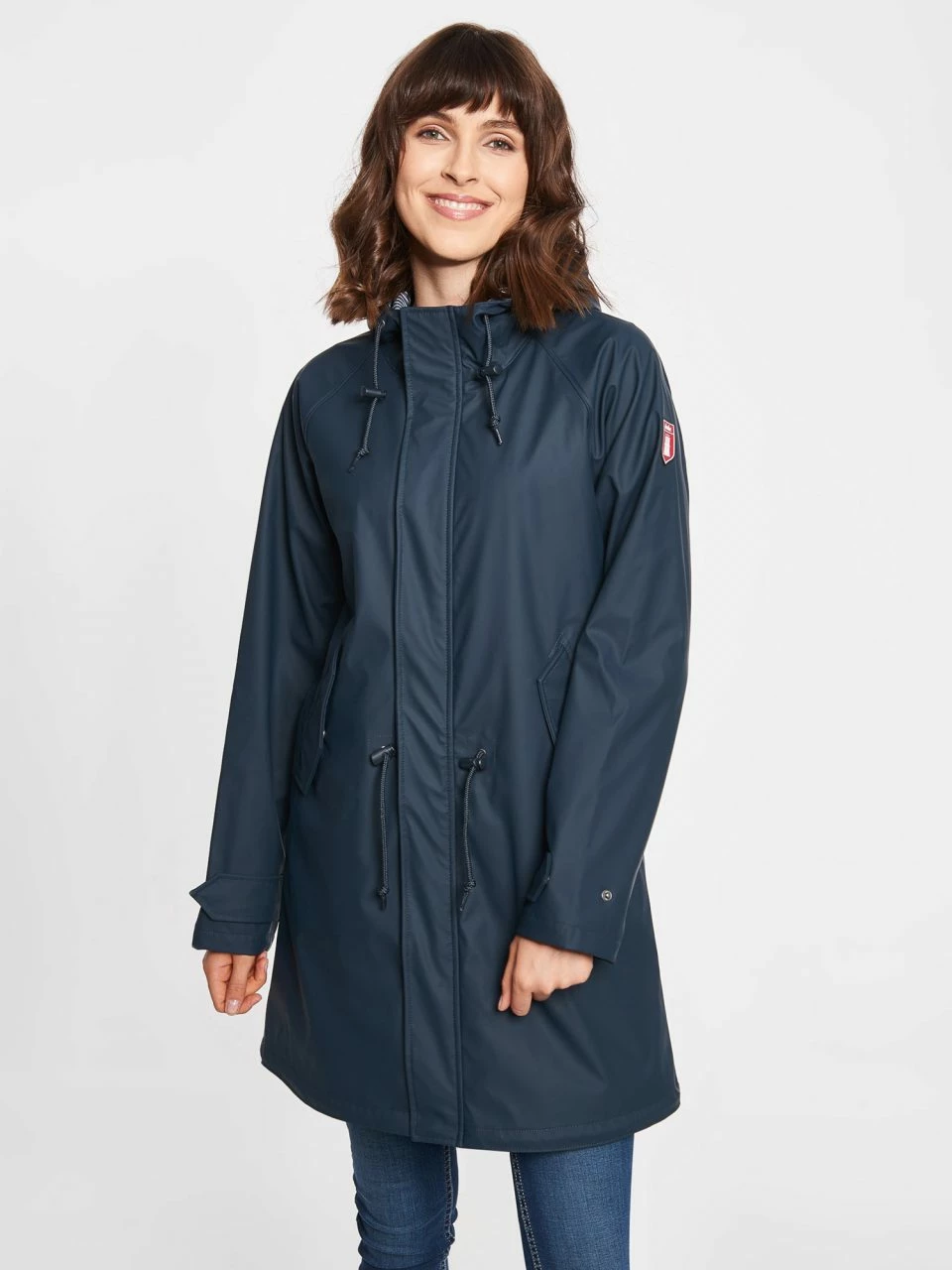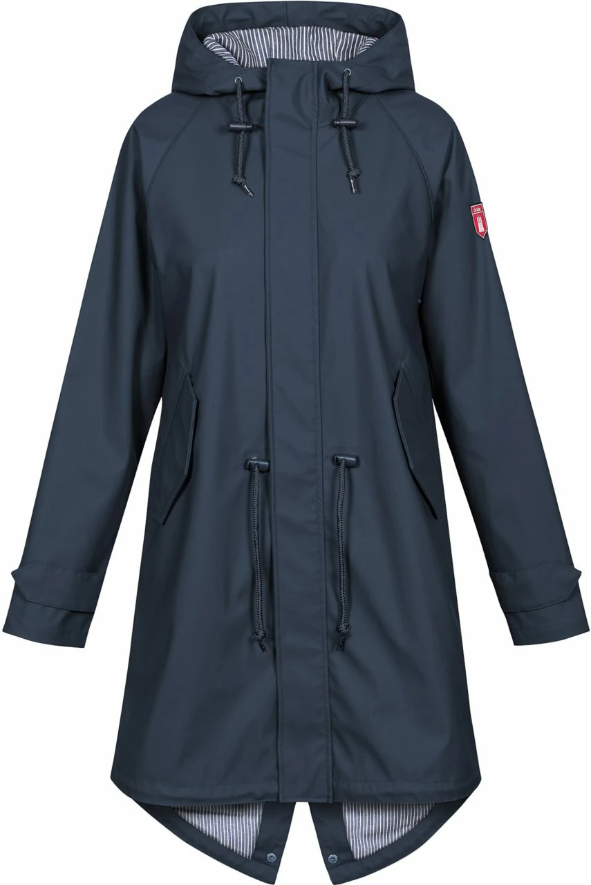 Nachhaltig produzierter Damen Parka TRAVEBY von der Hamburger Marke Derbe. Konzipiert für das intensive, norddeutsche Wetter ist der Regenmantel ganz sicher auch ein verlässlicher Begleiter in südlicheren Gefilden. Das äußere Material aus recyceltem Polyester ist mit einer Polyurethan-Beschichtung versehen und schützt vor Wind und Wasser. Die Nähte an den kritischen Stellen sind zudem versiegelt. Die unwattierte Jacke ist leicht ausgestellt und in normaler Passform geschnitten, sodass sie auch in Kombination mit dicken Pullis oder Sweatjacken als Übergangsjacke getragen werden kann. Die Taille kann durch einen Kordelzug betont werden.