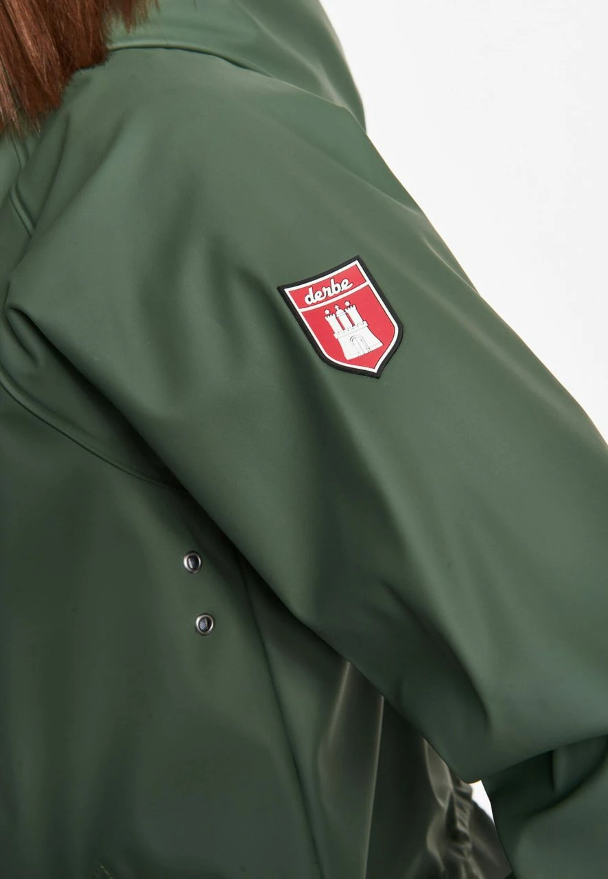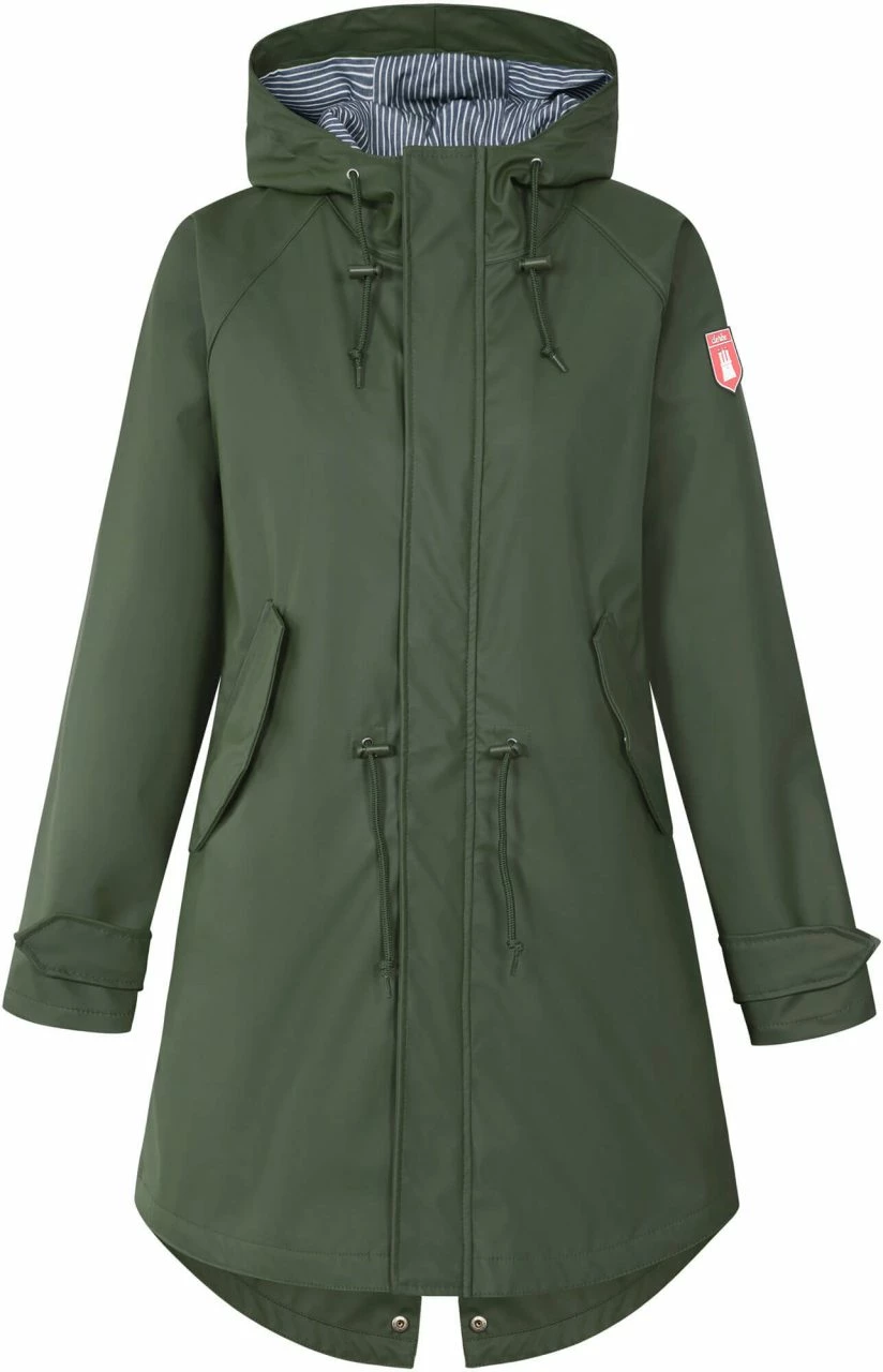 Nachhaltig produzierter Damen Parka TRAVEBY von der Hamburger Marke Derbe. Konzipiert für das intensive, norddeutsche Wetter ist der Regenmantel ganz sicher auch ein verlässlicher Begleiter in südlicheren Gefilden. Das äußere Material aus recyceltem Polyester ist mit einer Polyurethan-Beschichtung versehen und schützt vor Wind und Wasser. Die Nähte an den kritischen Stellen sind zudem versiegelt. Die unwattierte Jacke ist leicht ausgestellt und in normaler Passform geschnitten, sodass sie auch in Kombination mit dicken Pullis oder Sweatjacken als Übergangsjacke getragen werden kann. Die Taille kann durch einen Kordelzug betont werden.