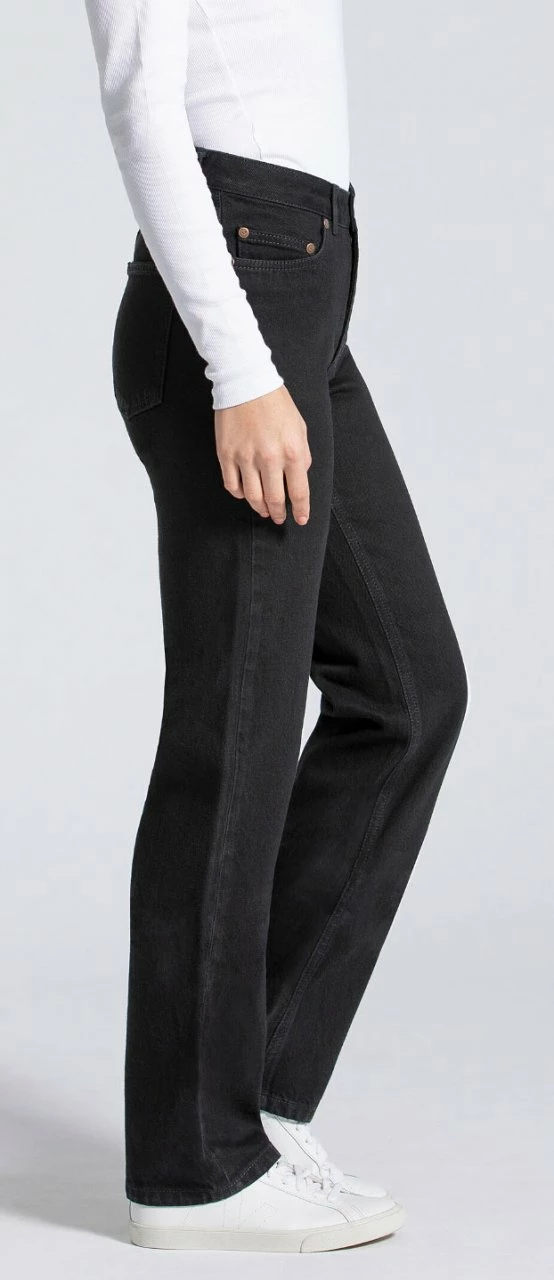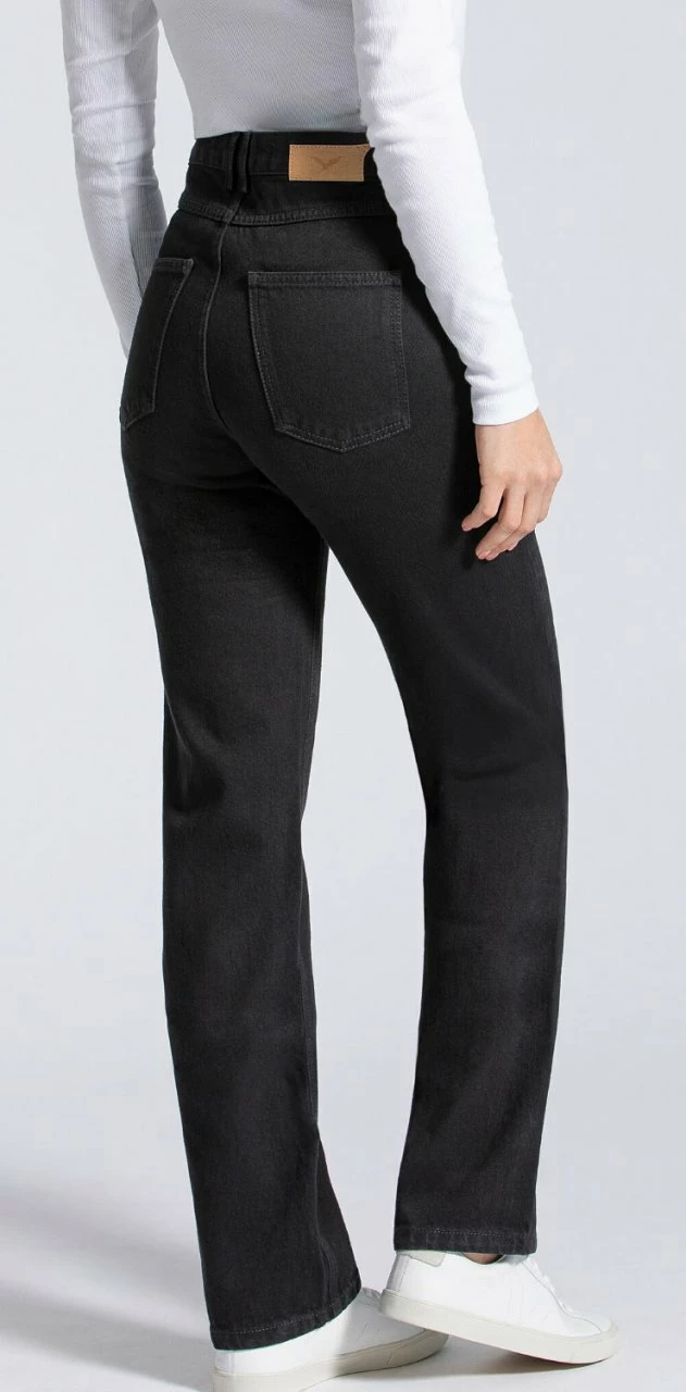 Klassische 5-Pocket Damen Jeans mit gerader Silhouette und taillenhohem Schnitt. Die Hose ist lässig geschnitten und bietet durch einen minimalen Elastananteil zusätzliche Bewegungsfreiheit. Das angebrachte Patch am Bund besteht aus Jacron. Die Jeans ist vegan.