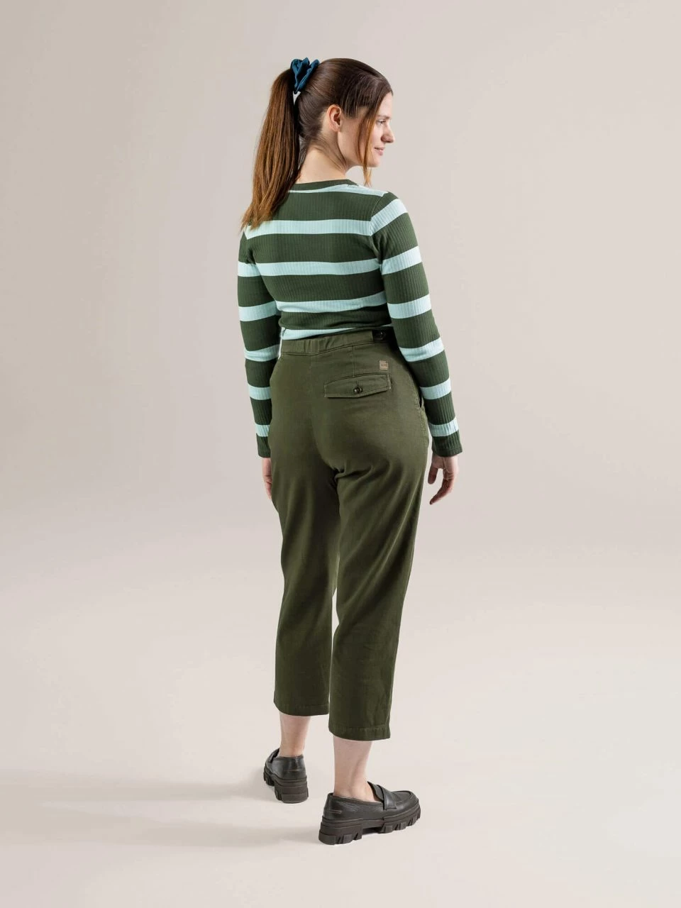 Neben den klassischen seitlichen Eingriffstaschen hat die Baumwollhose mit verkürztem Bein auch eine Gesäßtasche mit Knopf. Die Weite des Bunds lässt sich über ein rückseitig integriertes elastisches Band und seitliche Knöpfe anpassen – so sparst du dir einen Gürtel und der seitlich versetzte Verschlussknopf kommt besser zur Geltung.