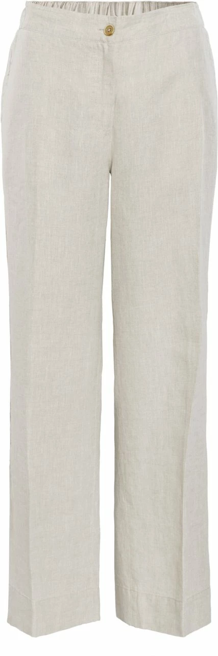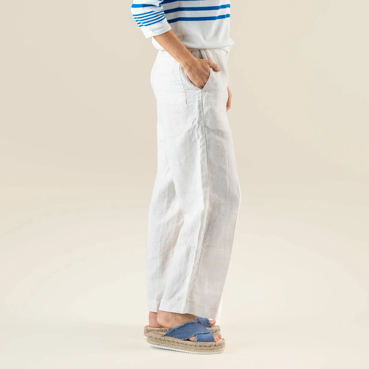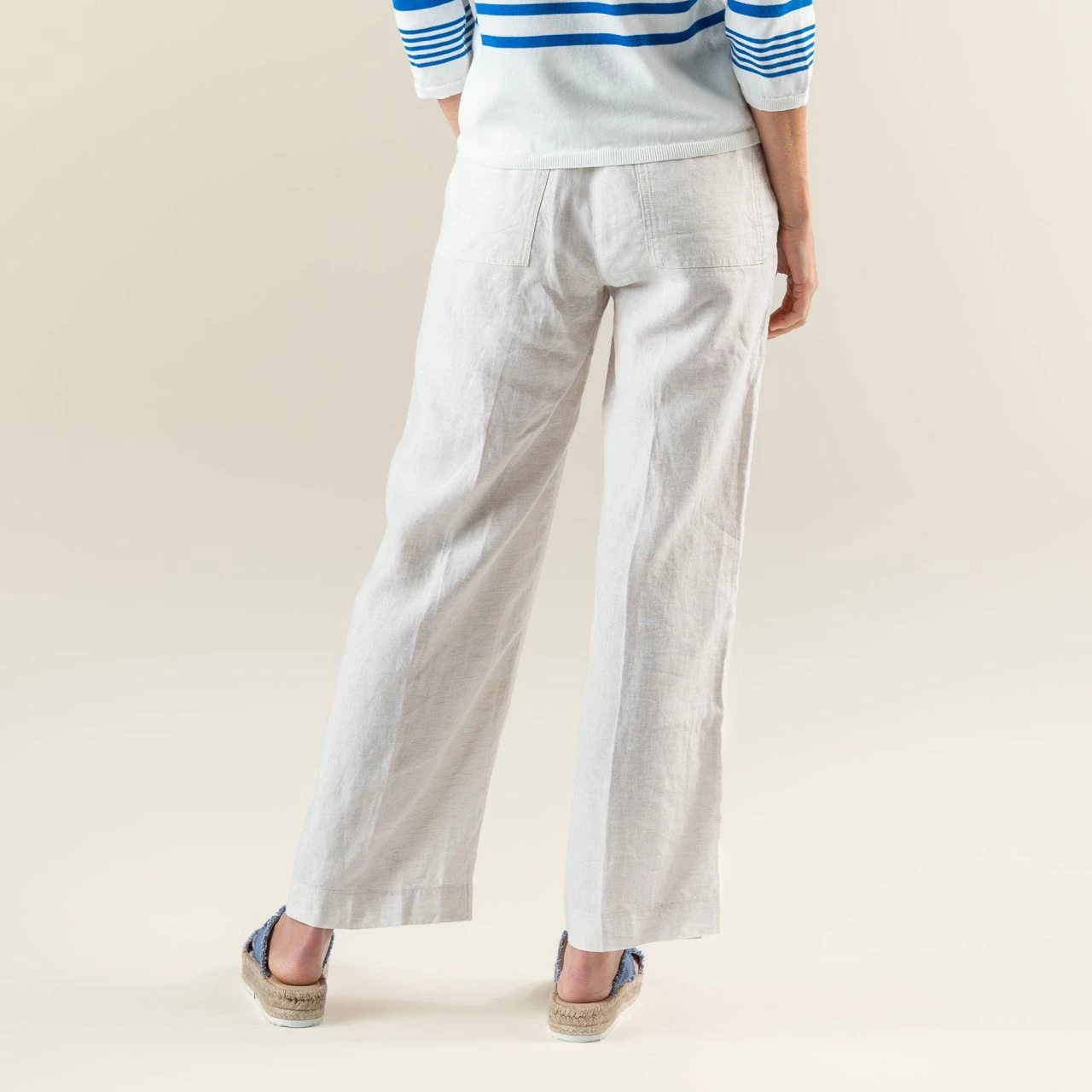 Damenhose aus reinem Leinen. Der Stoff ist leicht, atmungsaktiv und in Kombination mit dem weit geschnittenen Hosenbein optimal für warme Sommertage. Durch die Webart und die reine Naturfaser entsteht eine fein melierte Optik. Die Hose ist klassisch mit Knopf und Reißverschluss ausgestattet und hat hinten am Bund einen Elastikeinsatz für eine ideale Passform. Abgerundet wird die Sommerhose durch seitliche Eingrifftaschen und zwei aufgesetzte Gesäßtaschen.