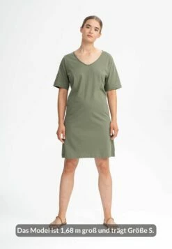 Sommerliches Kleid aus 52% Bio-Baumwolle und 48% Viskose (Bambus). Das Material ist als leichter Jersey-Stoff verarbeitet und fällt fließend. Das Sommerkleid hat einen Rundhalsausschnitt und kommt mit elastischem Gummibund auf Taillenhöhe. Das geraffte Rockteil in A-Linienform ist leicht ausgestellt und reicht bis zum Knie.