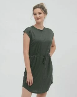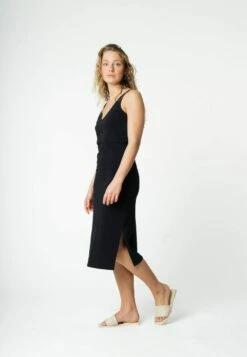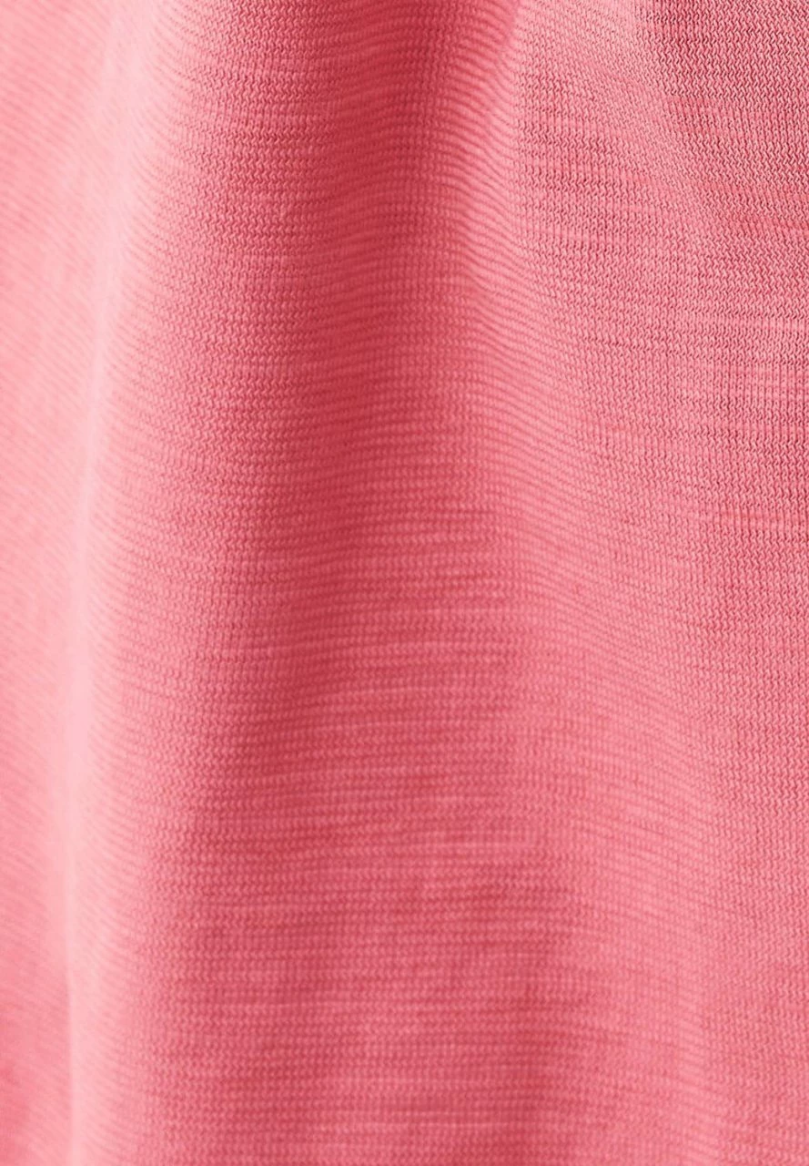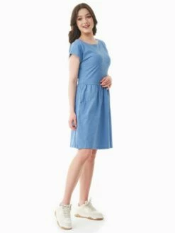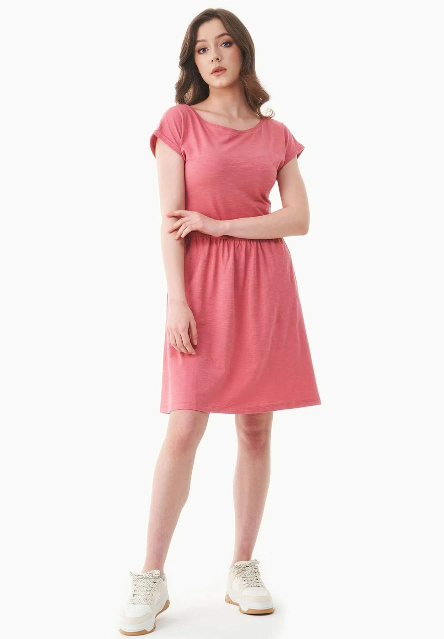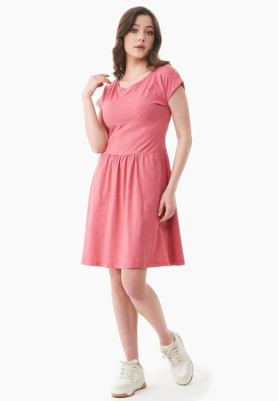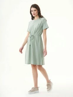 Knielanges Kurzarm-Kleid aus reiner Bio-Baumwolle. Der Halsausschnitt ist hoch und etwas weiter geschnitten. Die Ärmel sind umgeschlagen und fixiert. Ein eingenähtes, elastisches Band am Übergang von Ober- und Rockteil betont die Taille. Das geraffte Rockteil in A-Linienform hat zwei seitliche Eingrifftaschen und reicht bis zum Knie. Der Slub-Jersey-Stoff ist angenehm weich und nicht zu dünn.