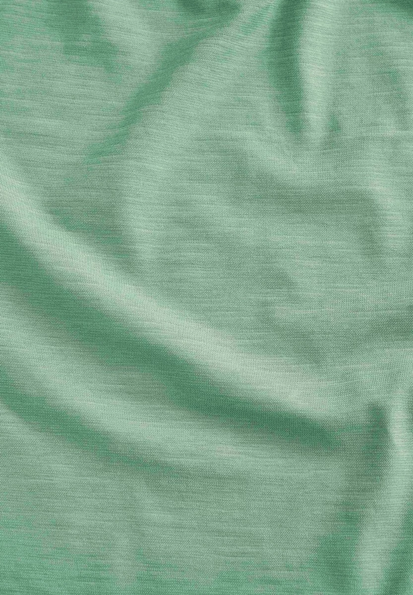 Knielanges Kurzarm-Kleid aus reiner Bio-Baumwolle. Der Halsausschnitt ist hoch und etwas weiter geschnitten. Die Ärmel sind umgeschlagen und fixiert. Ein eingenähtes, elastisches Band am Übergang von Ober- und Rockteil betont die Taille. Das geraffte Rockteil in A-Linienform hat zwei seitliche Eingrifftaschen und reicht bis zum Knie. Der Slub-Jersey-Stoff ist angenehm weich und nicht zu dünn.