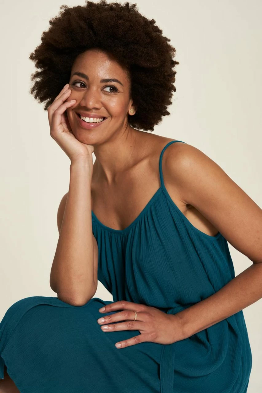 Das Kleid wird unter fairen Bedingungen hergestellt. ECOVERO™ ist eine nachhaltig hergestellte Viskosefaser und gilt als die umweltfreundlichste Viskose auf dem Weltmarkt. Die für die Herstellung benötigte Zellulose stammt von Holz aus nachhaltiger Forstwirtschaft und durch einen optimierten Produktionsprozess werden der Wasserverbrauch sowie der Ausstoß von CO² – im Vergleich zu herkömmlicher Viskose – um 50% reduziert. Die ECOVERO™ Faser trägt das strenge EU Ecolabel für besonders umweltschonende Herstellung.