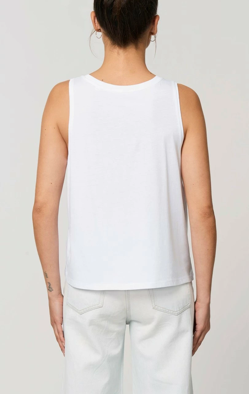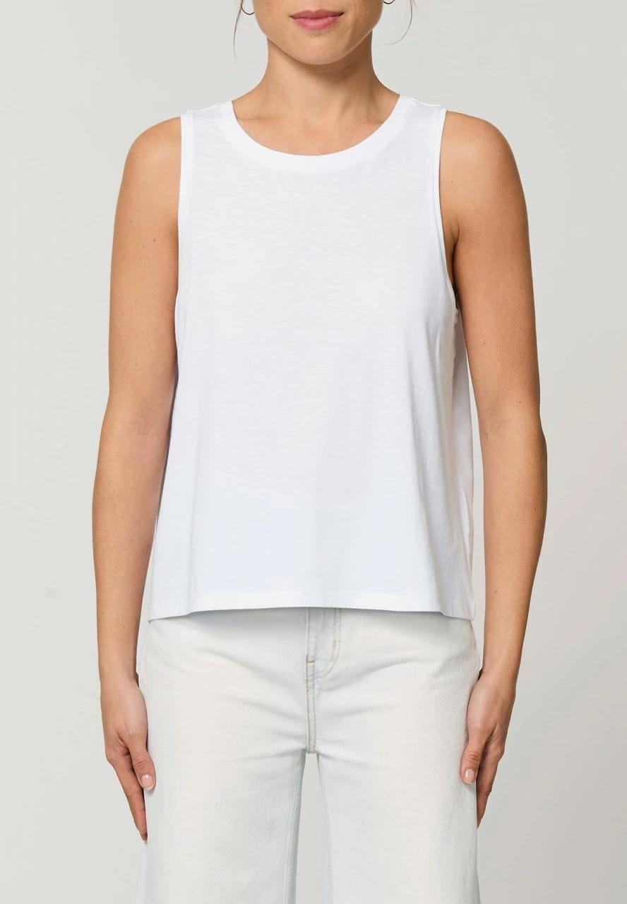 Kurzes, locker fallendes Tank-Top aus reiner Bio-Baumwolle. Der Hals- und die Armausschnitte sind mit einem feinen Rippbündchen eingefasst. Der leichte Single-Jersey Stoff liegt angenehm weich auf der Haut.
