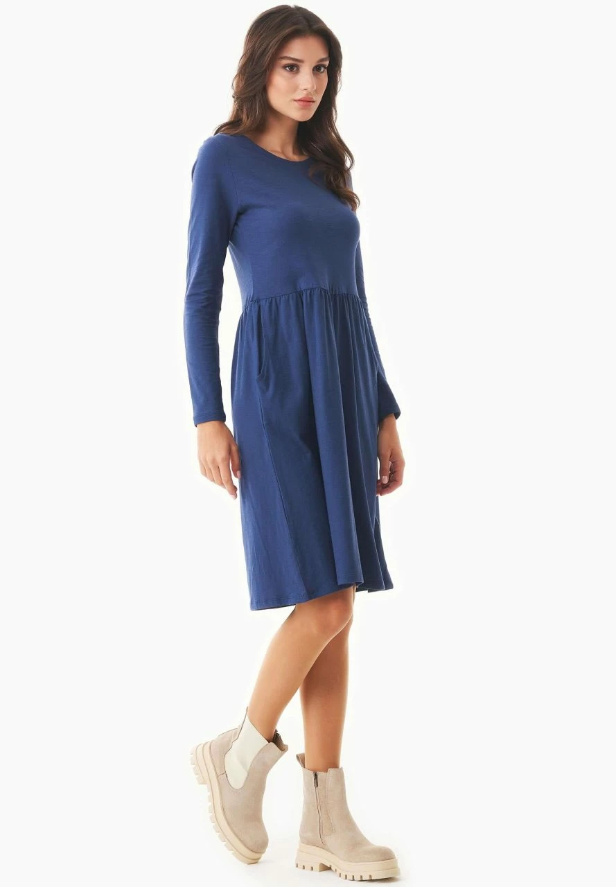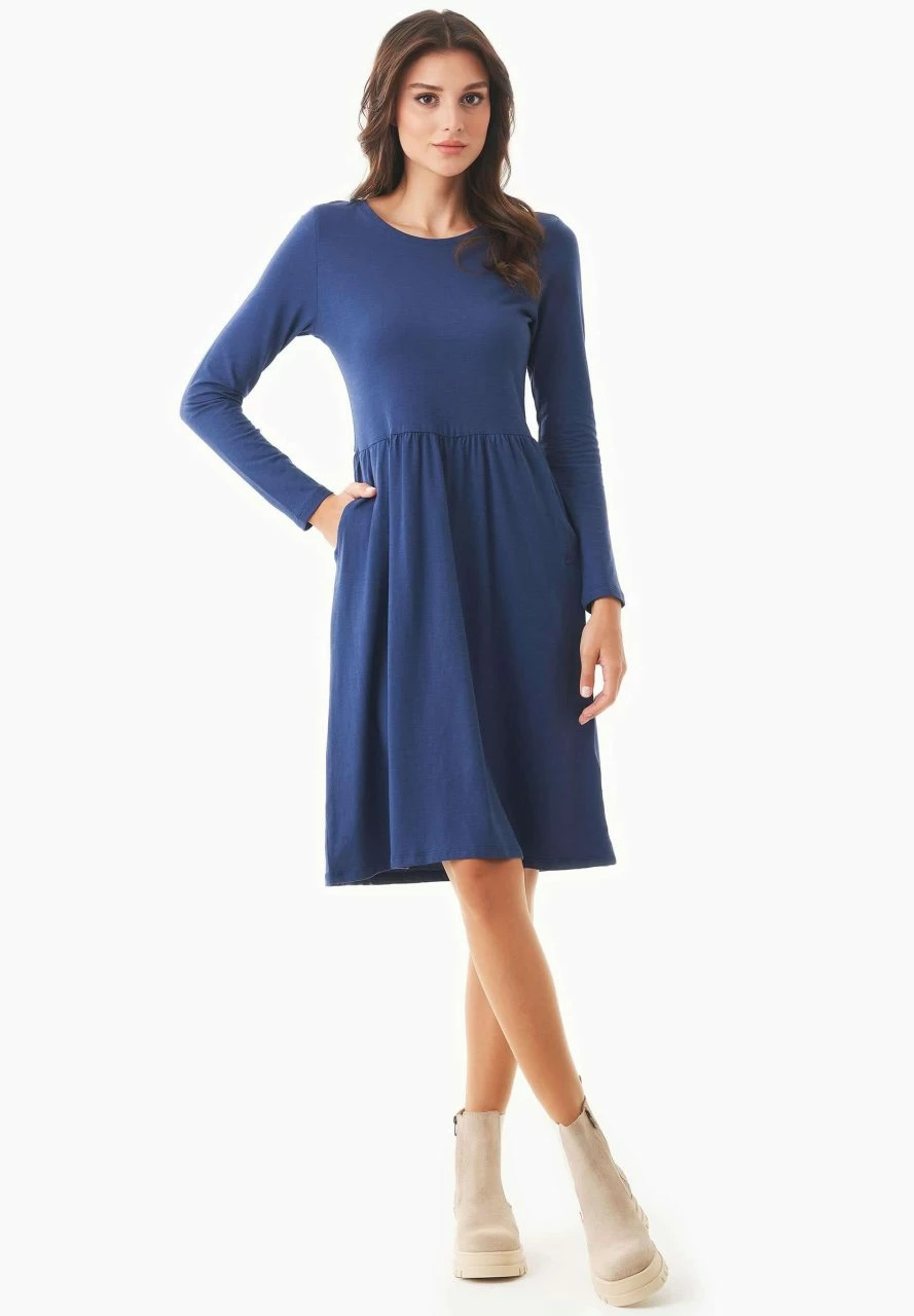 Knielanges Langarm-Kleid aus reiner Bio-Baumwolle. Ein eingenähtes, elastisches Band am Übergang von Ober- und Rockteil betont die Taille. Das geraffte Rockteil in A-Linienform hat zwei seitliche Eingrifftaschen und reicht bis zum Knie. Der Slub-Jersey-Stoff ist angenehm weich und nicht zu dünn.