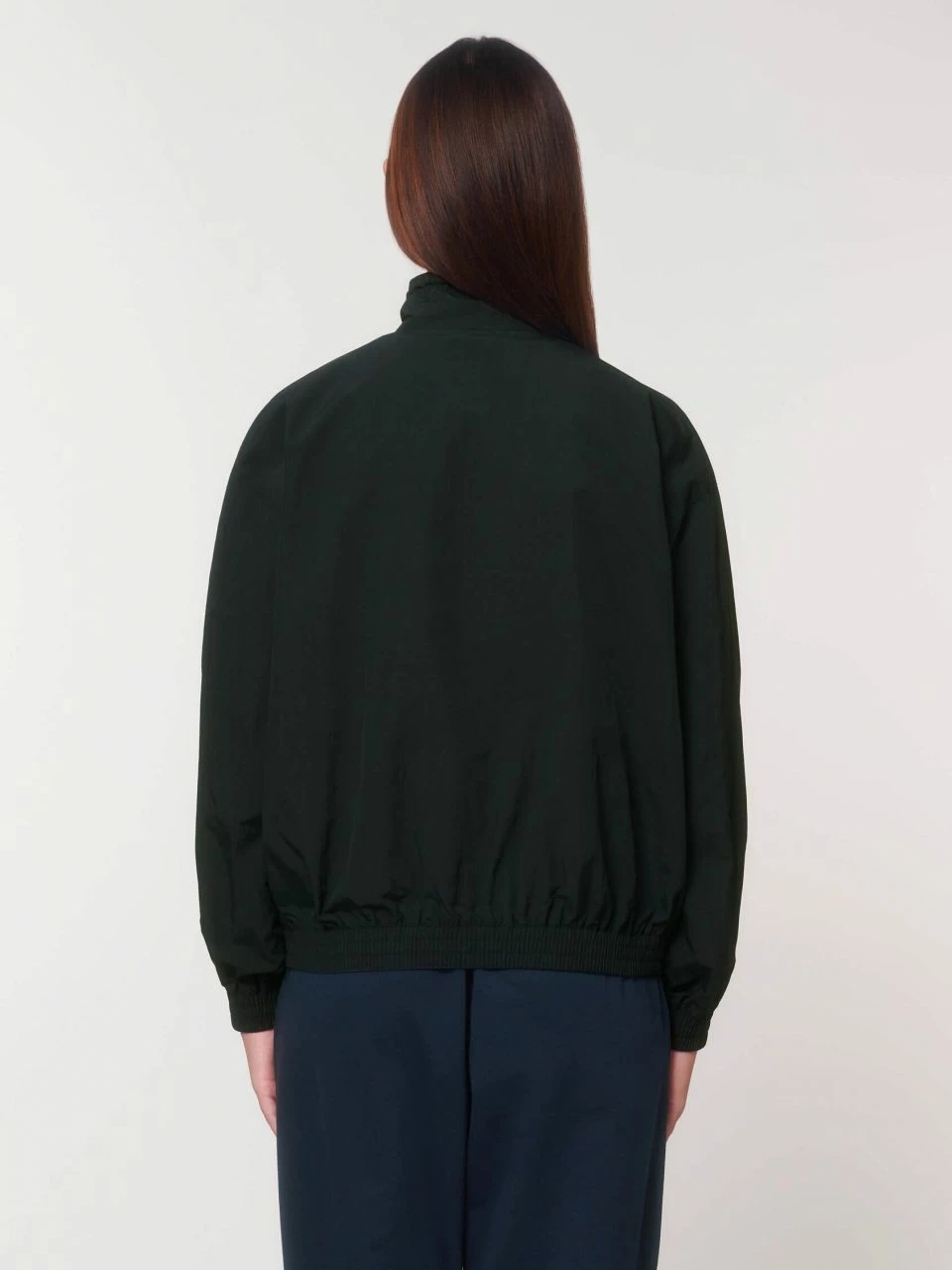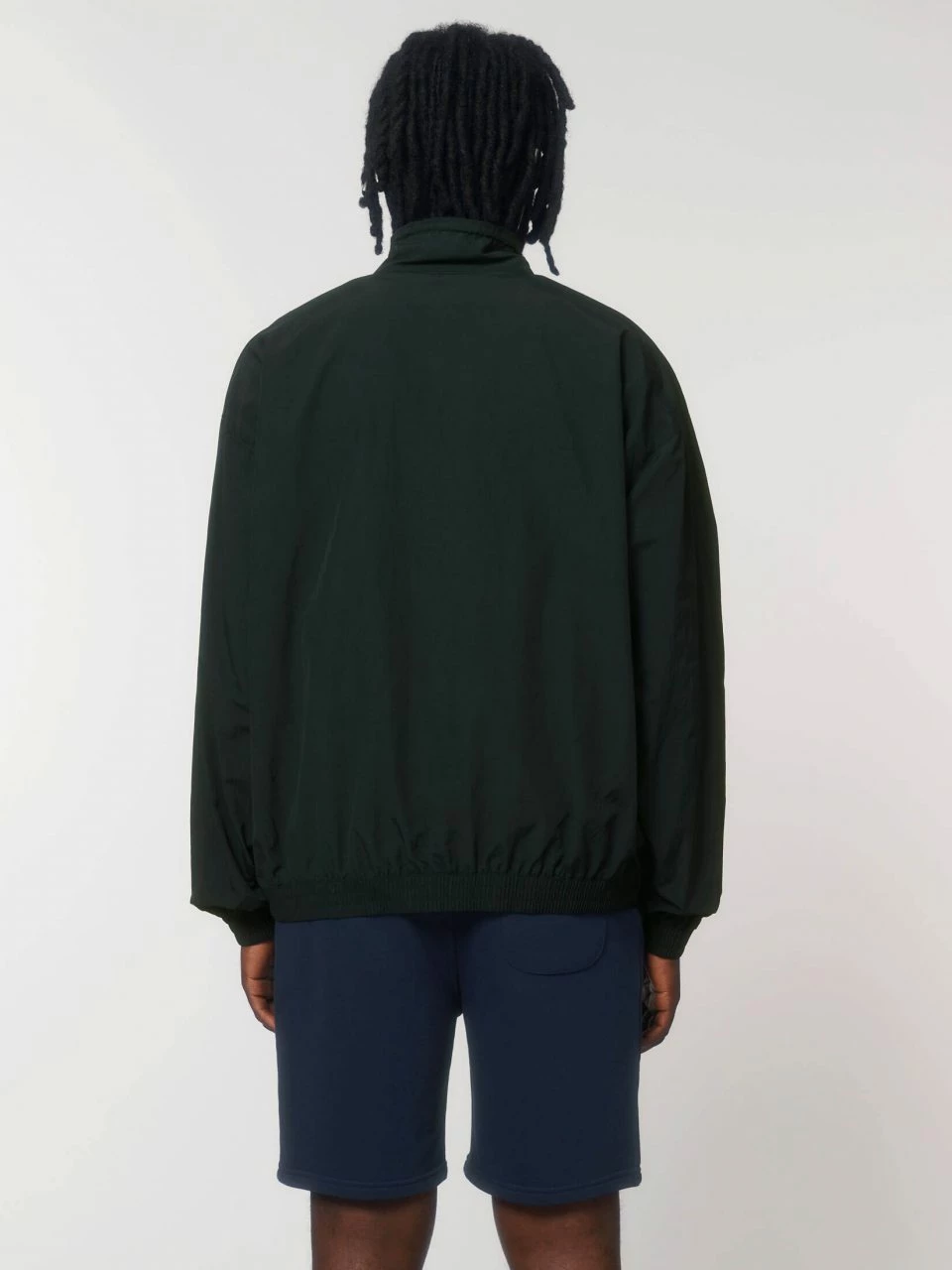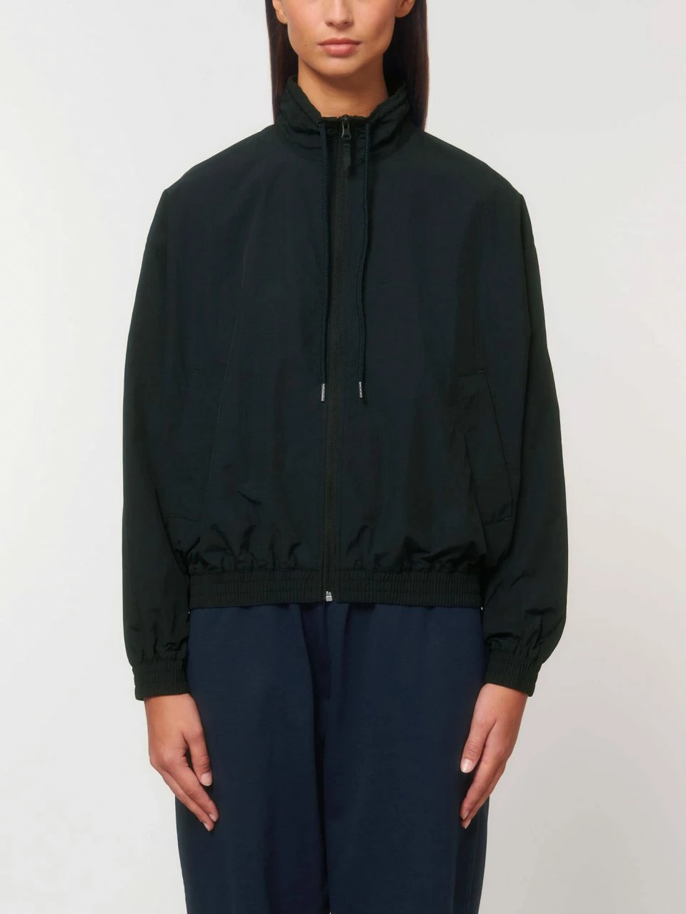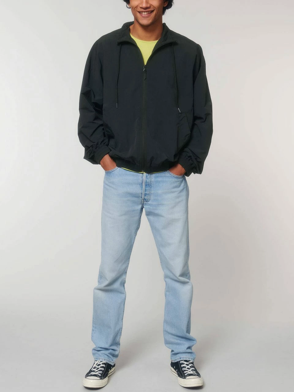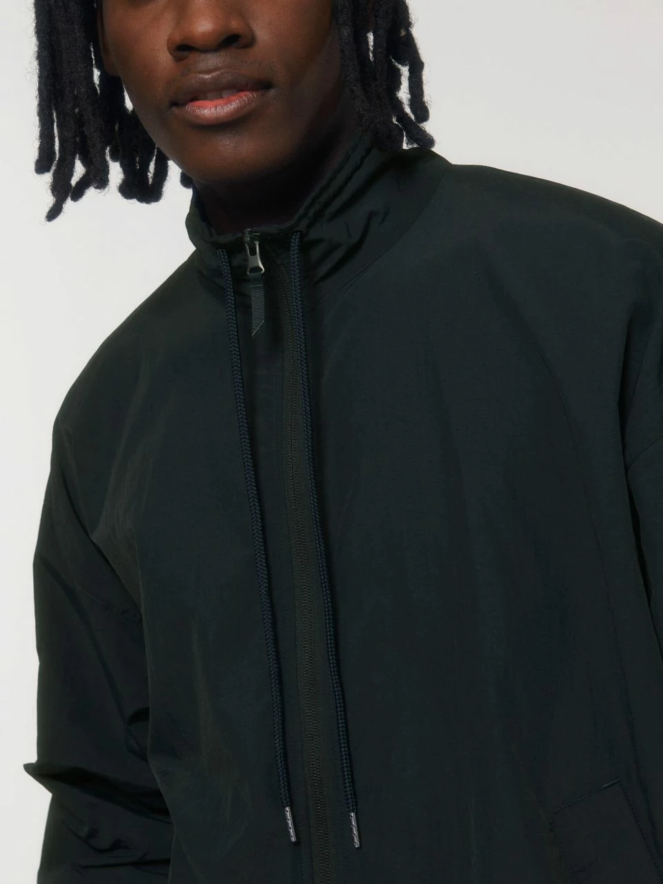 Sportliche Jacke aus recyceltem Nylon in normaler Passform. Die Unisex Jacke kommt mit Stehkragen, der durch eine lange Kordel in der Farbe des Hauptstoffs mit Metallenden angepasst werden kann, einem Nylon-Reißverschluss sowie breiten, elastischen Abschlüssen an den Ärmeln und der Hüfte. Die Jacke hat vorne zwei Leistentaschen, die mit einem Reißverschluss geschlossen werden können. Der Stoff ist aus leichtem Taslangewebe gefertigt und dank fluorfreier Beschichtung auch wasserabweisend.