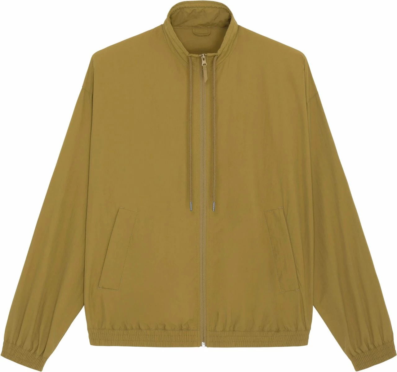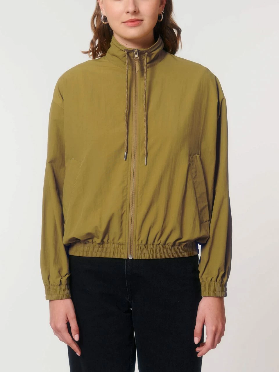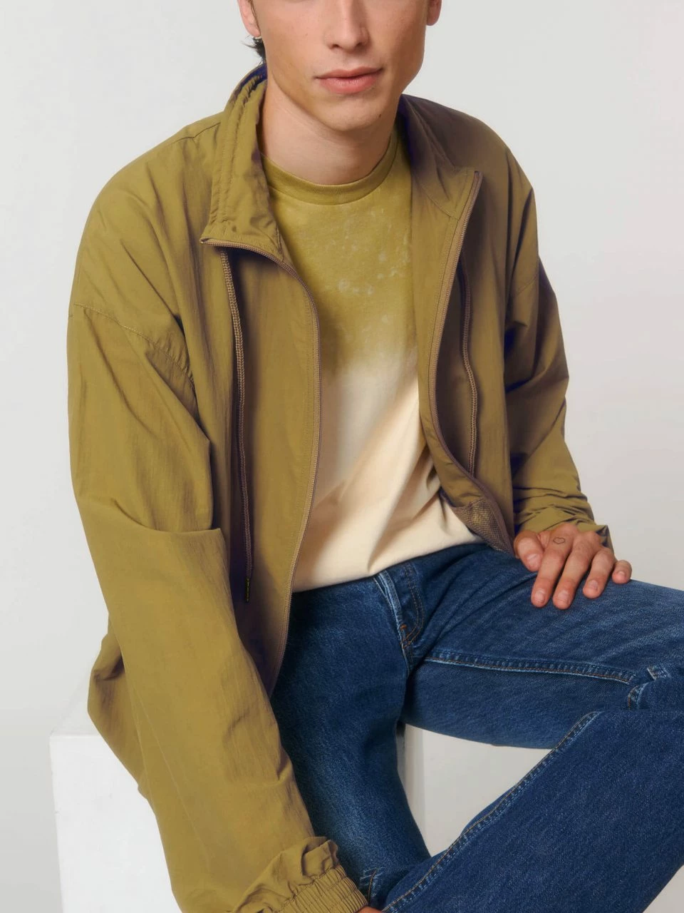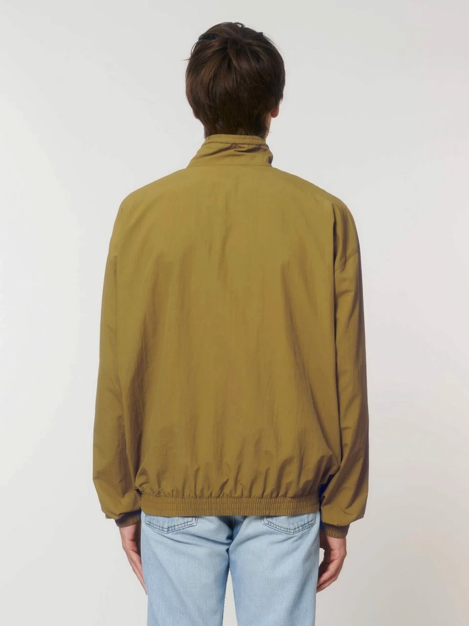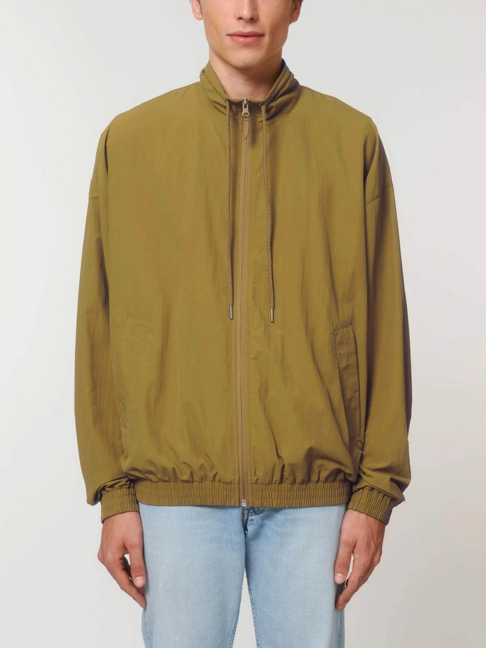 Sportliche Jacke aus recyceltem Nylon in normaler Passform. Die Unisex Jacke kommt mit Stehkragen, der durch eine lange Kordel in der Farbe des Hauptstoffs mit Metallenden angepasst werden kann, einem Nylon-Reißverschluss sowie breiten, elastischen Abschlüssen an den Ärmeln und der Hüfte. Die Jacke hat vorne zwei Leistentaschen, die mit einem Reißverschluss geschlossen werden können. Der Stoff ist aus leichtem Taslangewebe gefertigt und dank fluorfreier Beschichtung auch wasserabweisend.