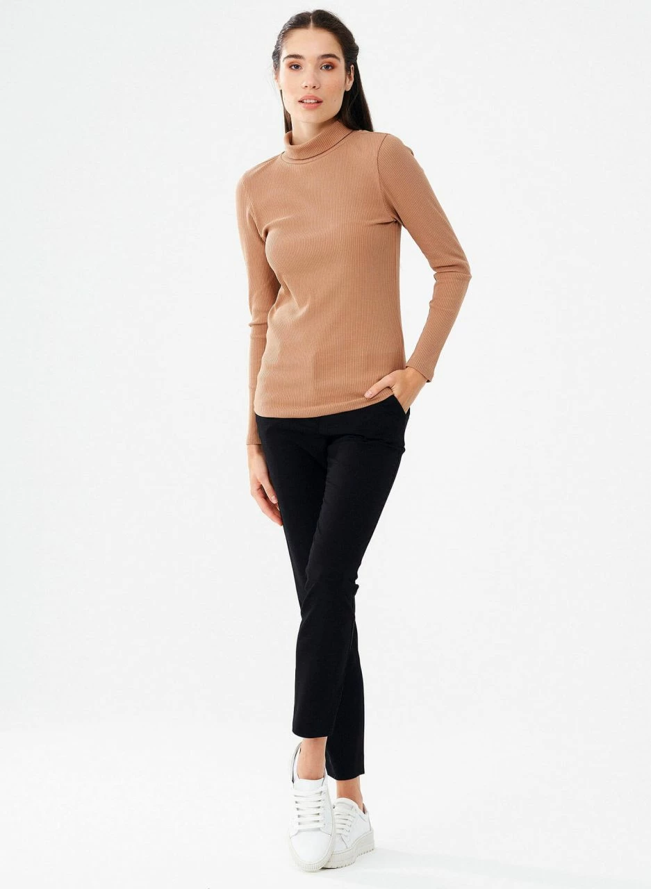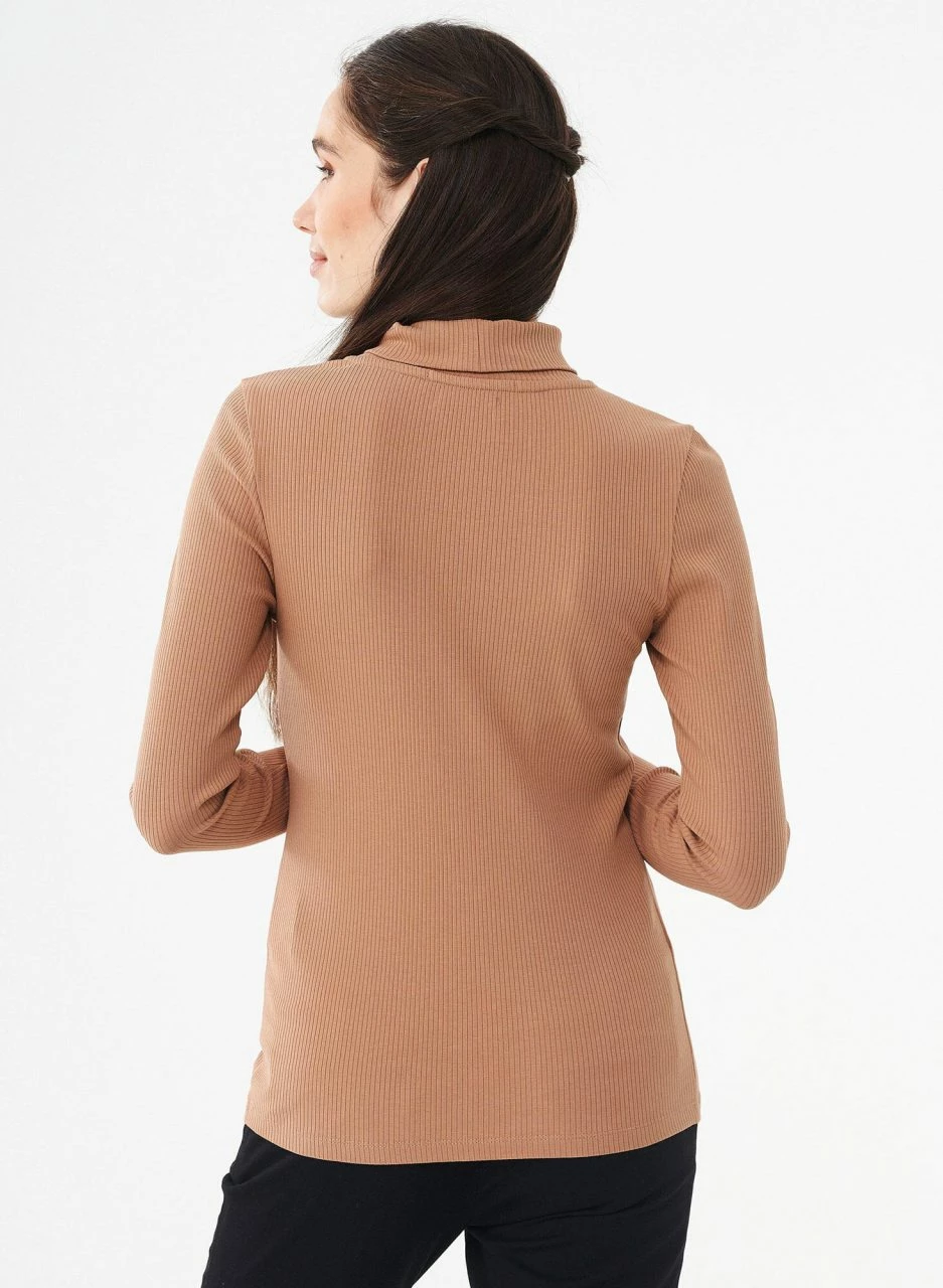 Geripptes Damen Longsleeve mit Stehkragen aus Bio-Baumwolle und 5% Elastan. Der weiche, dehnbare Stoff passt sich der Körperform an. Der doppellagige Kragen ist hoch genug, um umgeschlagen zu werden. Ein hochwertiges Basic für Deinen Casual Business Look.