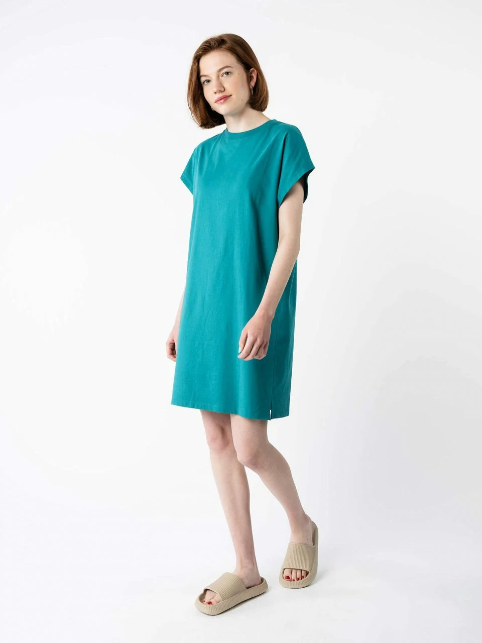 Gerade geschnittenes T-Shirt Kleid aus reiner Fairtrade Bio-Baumwolle. Das knielange Kleid wird durch Fledermausärmel und Seitenschlitzen aufgewertet. Der Jersey-Stoff ist vorgewaschen, somit bleibt die Passform erhalten.