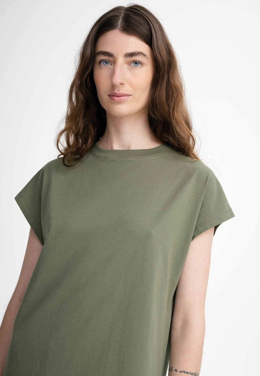 Gerade geschnittenes T-Shirt Kleid aus reiner Fairtrade Bio-Baumwolle. Das knielange Kleid wird durch Fledermausärmel und Seitenschlitzen aufgewertet. Der Jersey-Stoff ist vorgewaschen, somit bleibt die Passform erhalten.