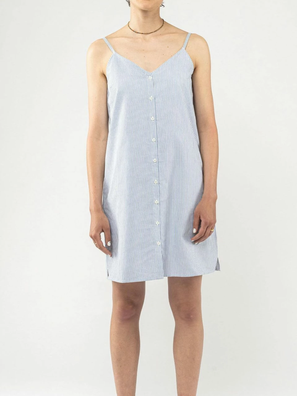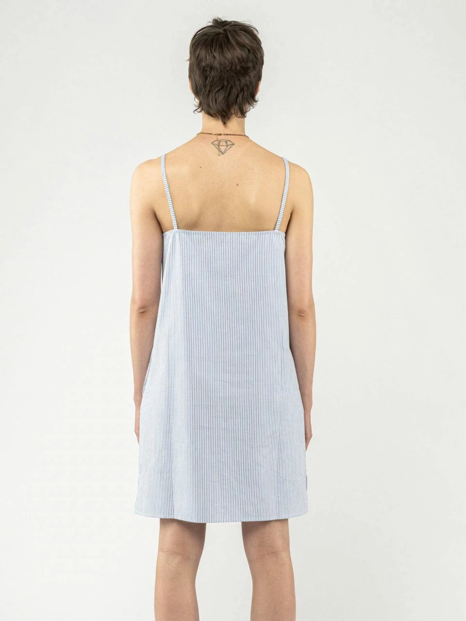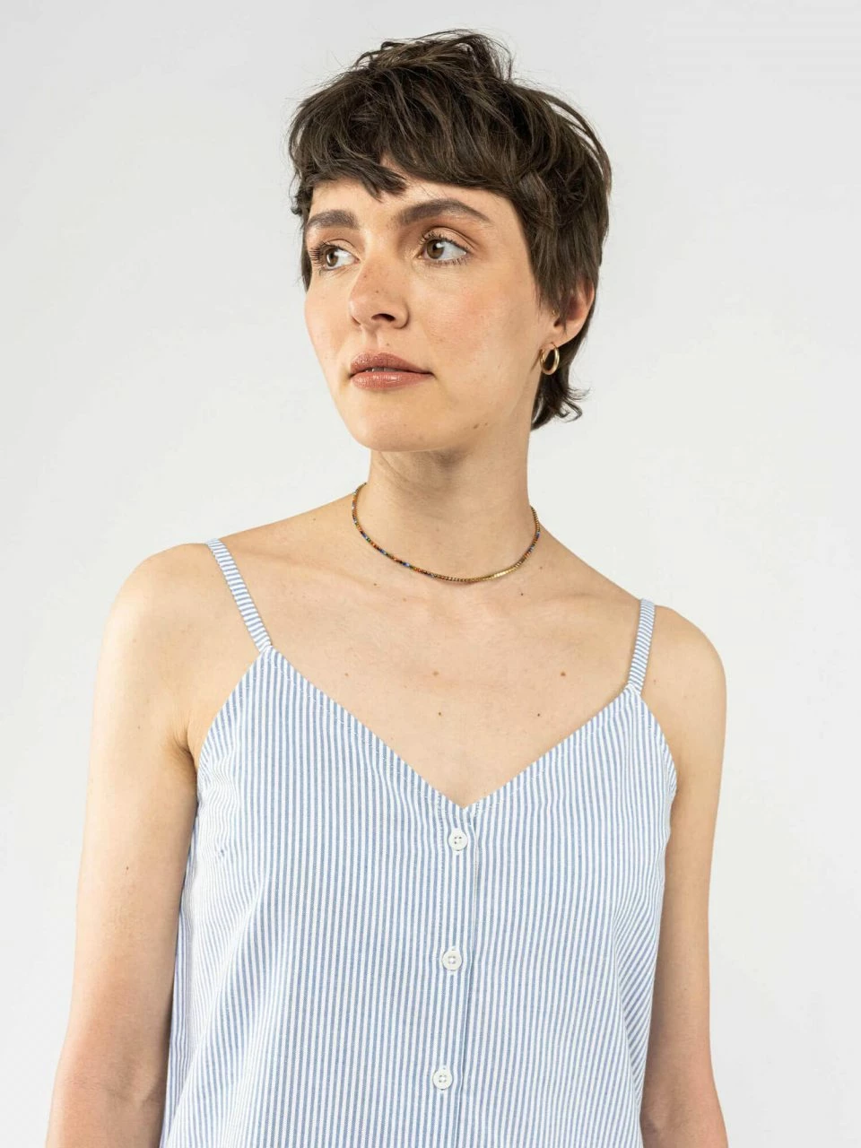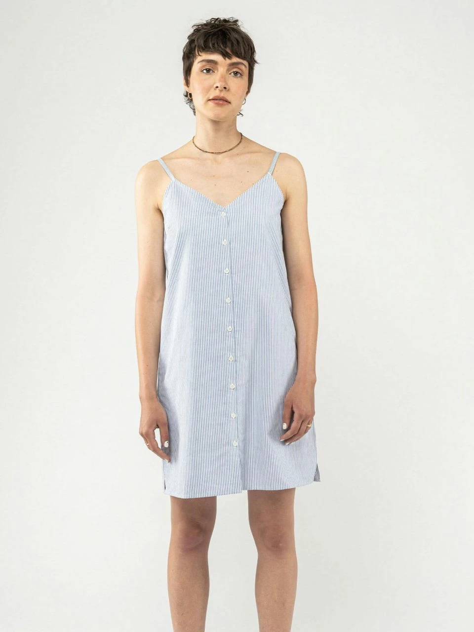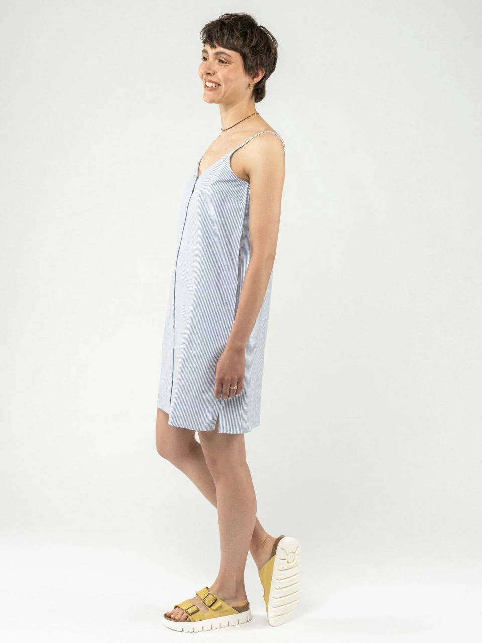 Leichtes Trägerkleid aus reiner Fairtrade Bio-Baumwolle. Das sommerliche Kleid in Midi-Länge kommt mit schmalen Spaghetti-Träger. Der V-Ausschnitt endet in einer durchgehenden Knopfleiste mit veganen Knöpfen aus Steinnuss. Am dezent ausgestellten Saum sorgen Seitenschlitze für zusätzliche Bewegungsfreiheit. Dank der zwei Seitentaschen sind Kleinigkeiten immer schnell griffbereit. Das Oxford-Gewebe ist vorgewaschen, somit bleibt die Passform erhalten.
