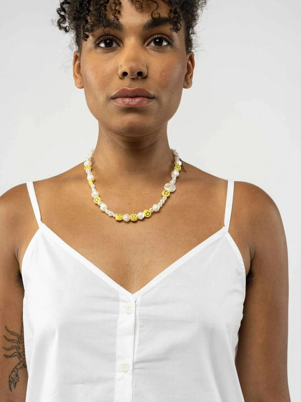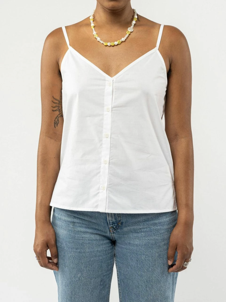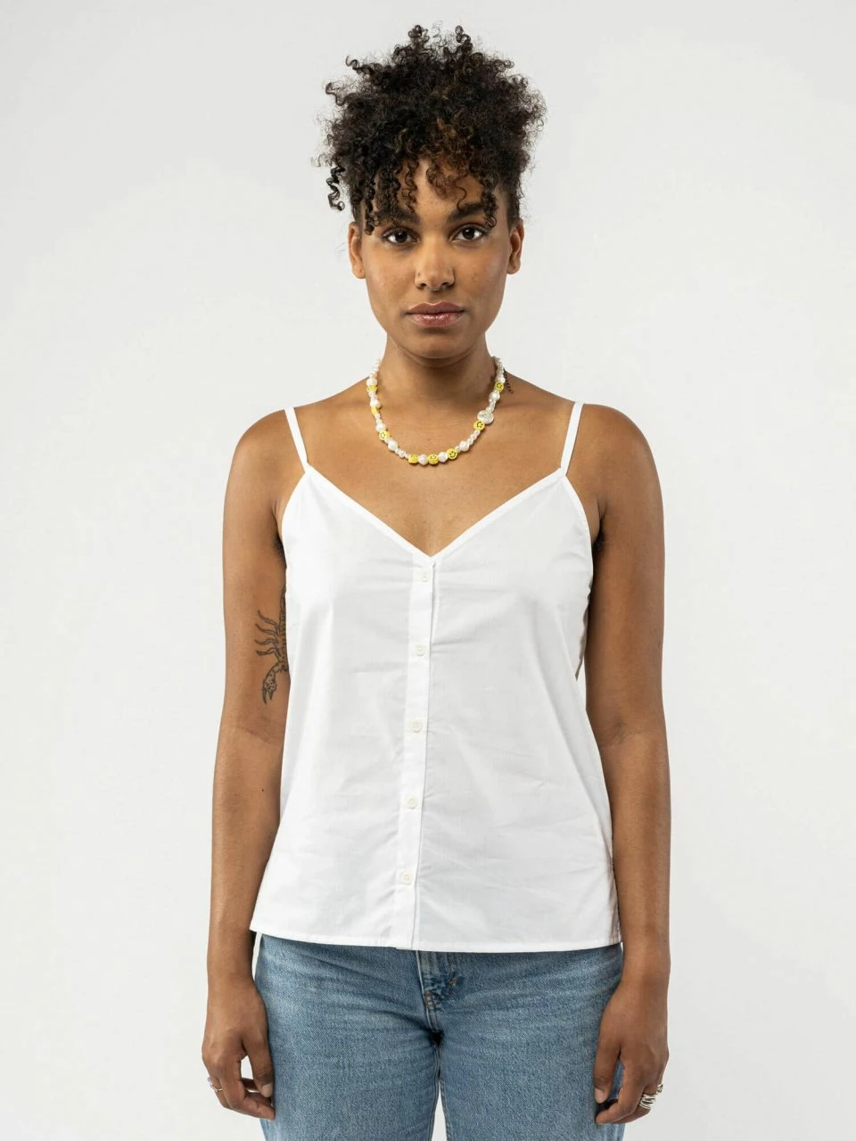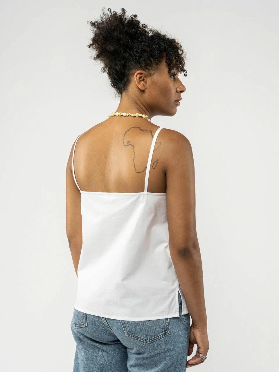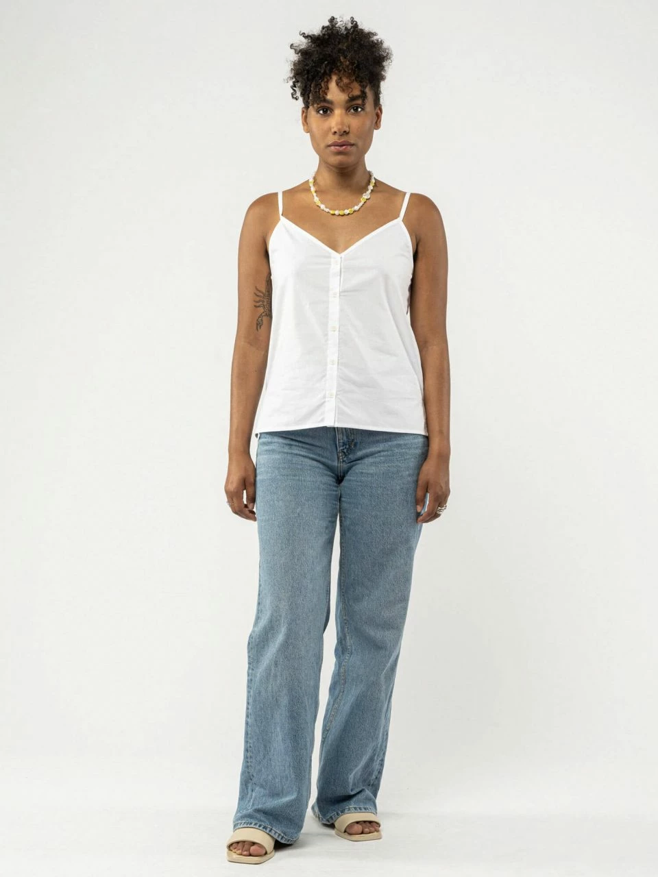 Sommerliches Spaghetti-Trägertop aus reiner Fairtrade Bio-Baumwolle. Das Top ist gerade geschnitten und hat seitliche Schlitze am Saum. Die dünnen Träger, der V-Neck-Ausschnitt und die durchgehende Knopfleiste sorgen für ein modernes Erscheinungsbild. Die verwendeten Knöpfe bestehen aus Steinnuss. Der Poplin Stoff ist vorgewaschen, somit bleibt die Passform erhalten.