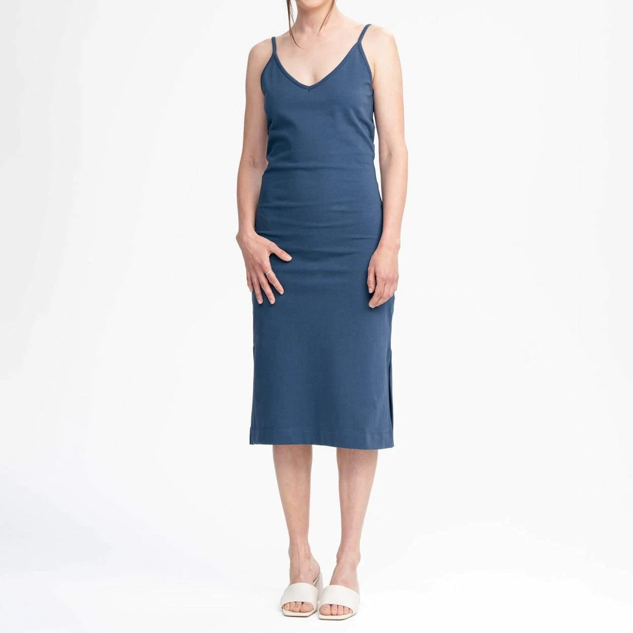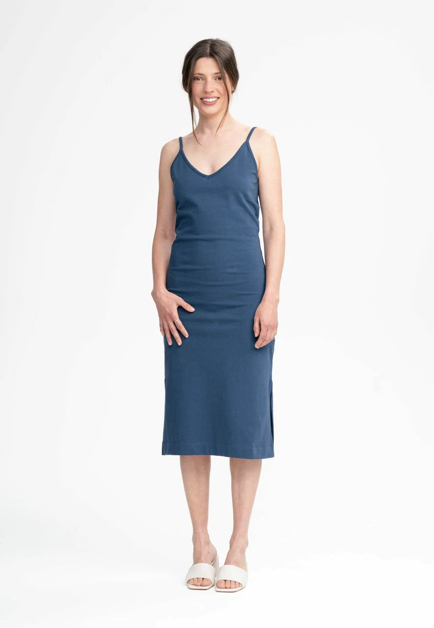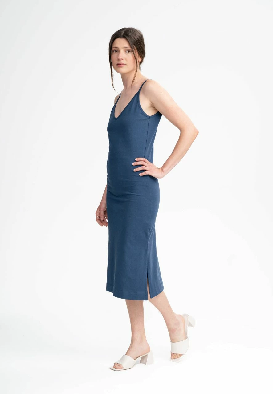 Spaghettiträger-Kleid aus reiner Fairtrade Bio-Baumwolle. Das schmal geschnittene Kleid kommt mit elegantem V-Ausschnitt vorne und hinten sowie zwei tiefen Seitenschlitzen am Saum. Der schwere Jersey-Stoff (260 g/m²) ist vorgewaschen, somit bleibt die Passform erhalten.