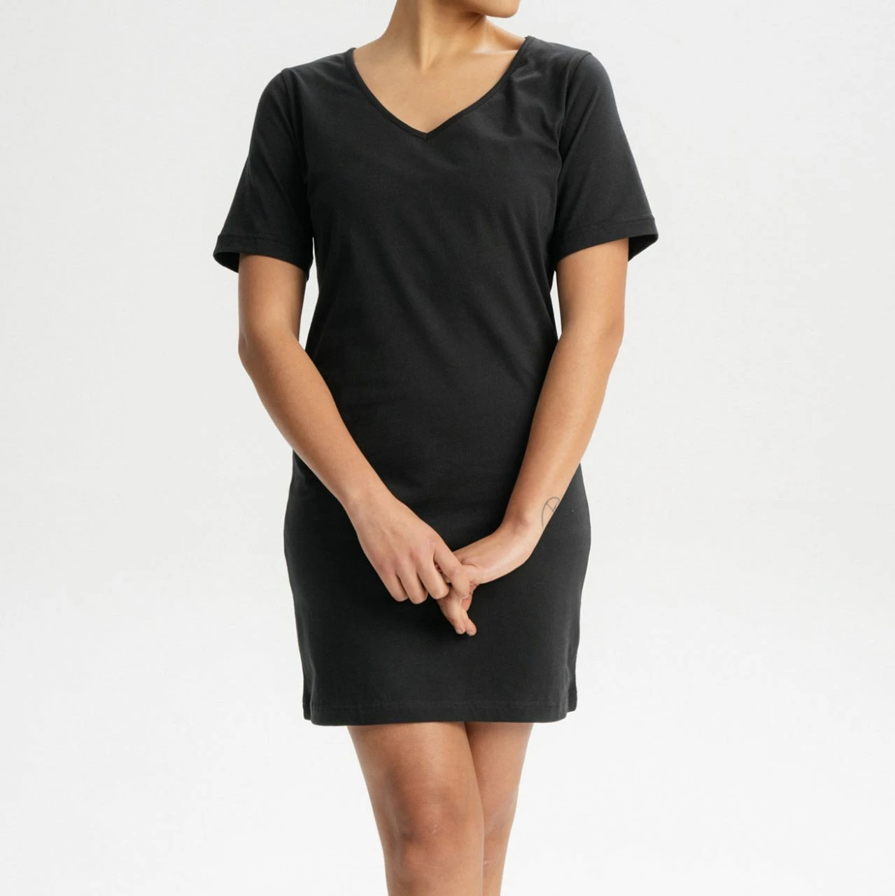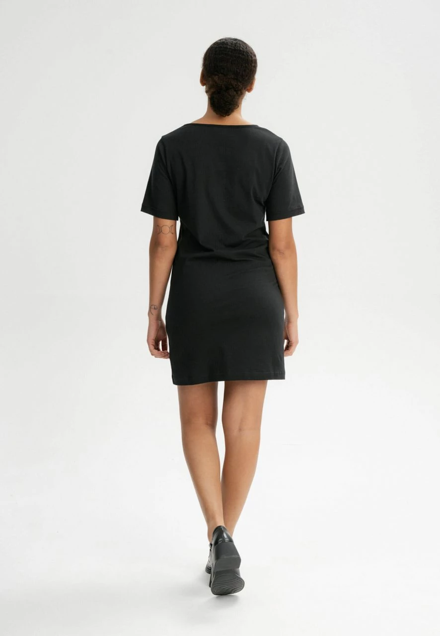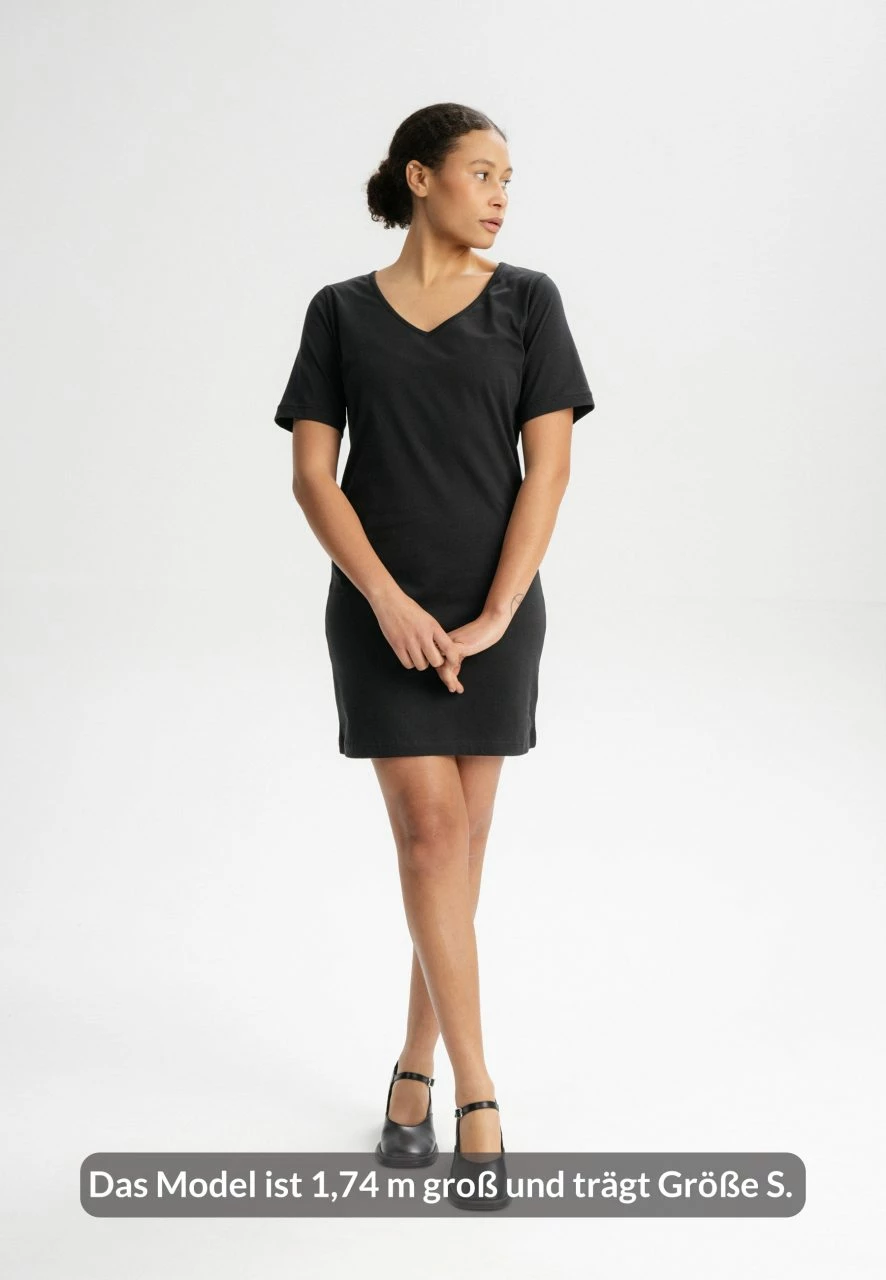 Das T-Shirt Kleid »Janitra« besteht aus reiner Fairtrade Bio-Baumwolle. Das knielange Kleid schmeichelt durch seinen V-Ausschnitt und den leicht taillierten Sitz. Der Jersey-Stoff ist vorgewaschen, somit bleibt die Passform erhalten.