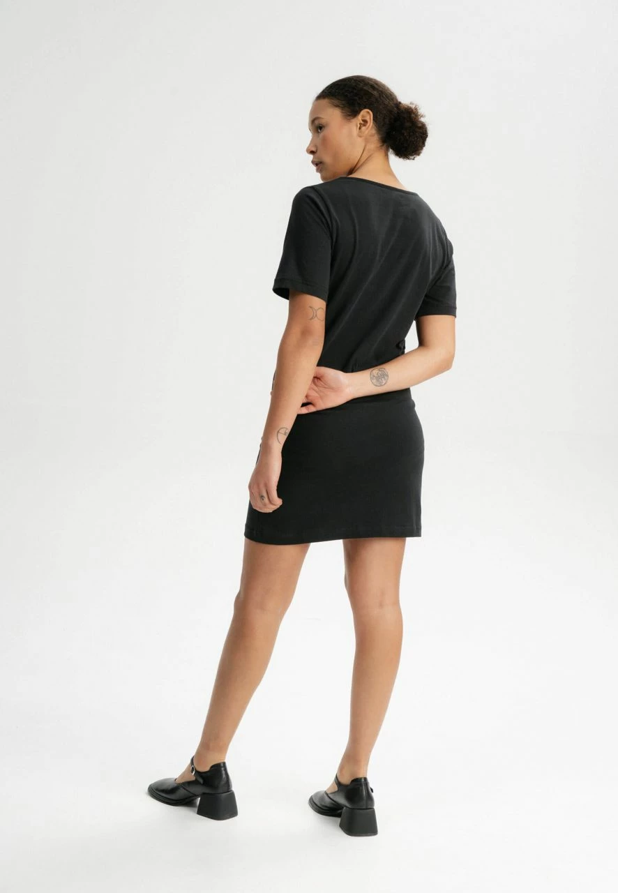 Dieses vegane Kleid ist nach Fairtrade Cotton Standard zertifiziert und trägt das staatliche Siegel »Grüner Knopf«. Es erfüllt somit strenge Auflagen in Bezug auf den biologischen Anbau der Baumwolle sowie die schadstoffarme und faire Herstellung entlang der gesamten textilen Produktionskette.