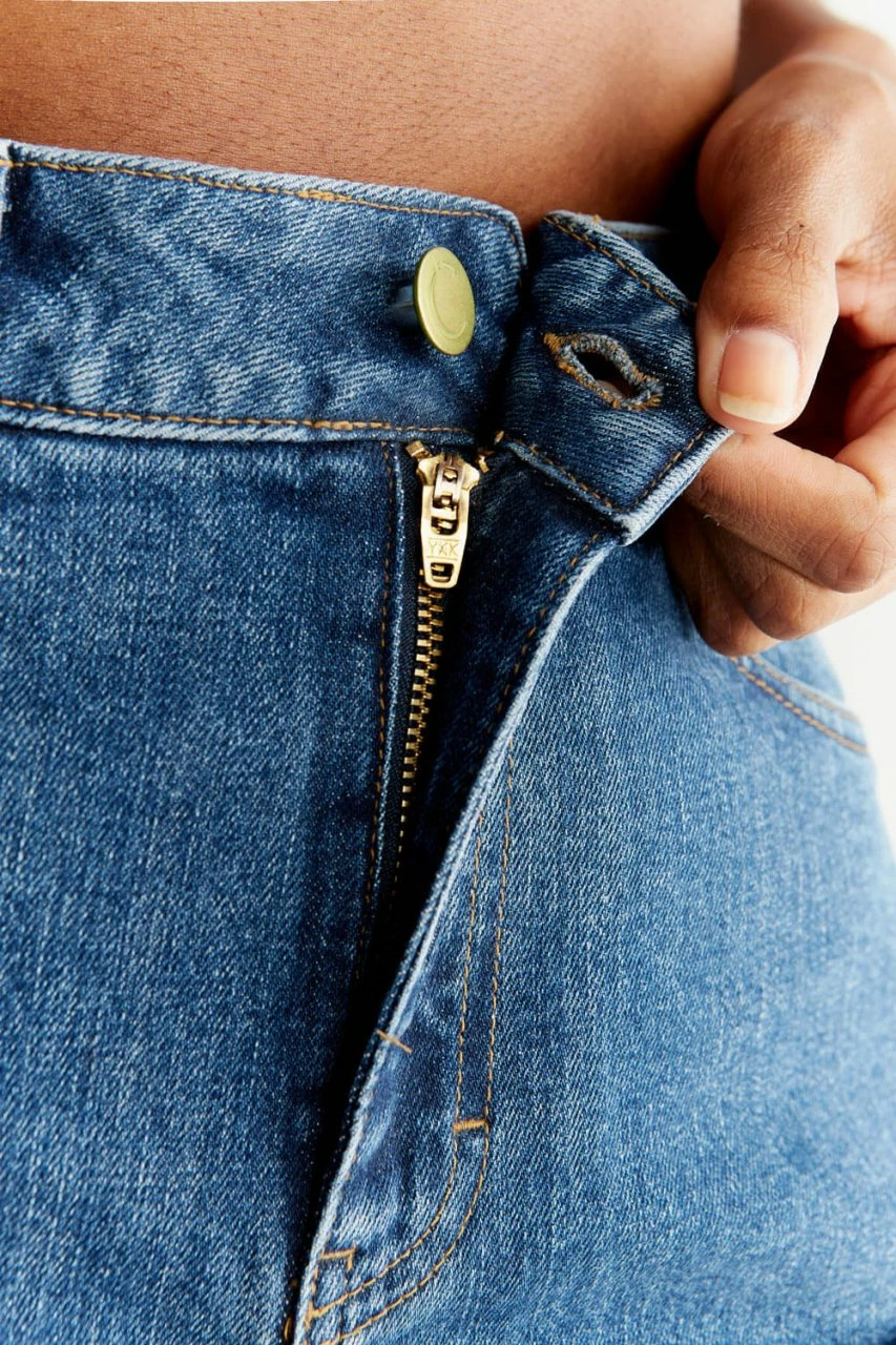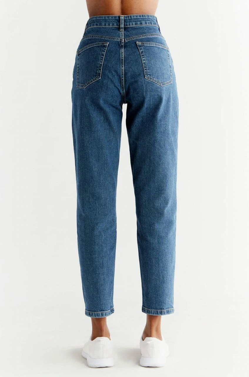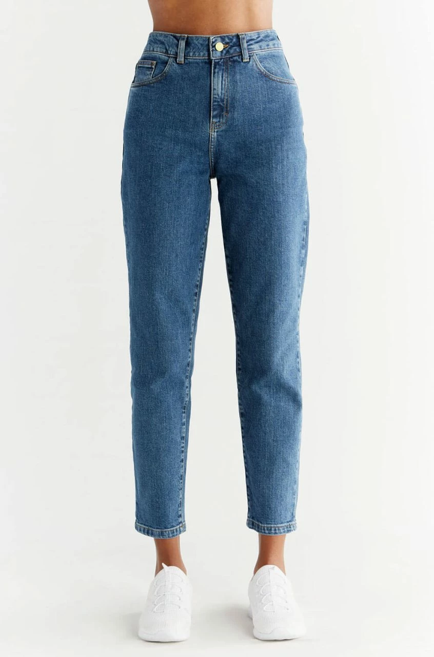 Bequem geschnittene 5-Pocket Damen Jeans aus nachhaltigen Materialien. Die Hose hat eine hohe Leibhöhe und sitzt an den Oberschenkeln etwas lockerer. Unterhalb des Knies läuft das Bein leicht zusammen, ohne zu eng anzuliegen. Die Mom Fit Jeans präsentiert sich in einem cleanen Look komplett ohne Nieten oder Patches. Geschlossen wird die Hose mit einem matt schimmernden, gelben Knopf und YKK NATULON® Zipper aus recyceltem Polyester. Das Nähgarn in Kontrastfarbe besteht ebenfalls aus wiederverwertetem Polyester (Coats Epic EcoVerde).