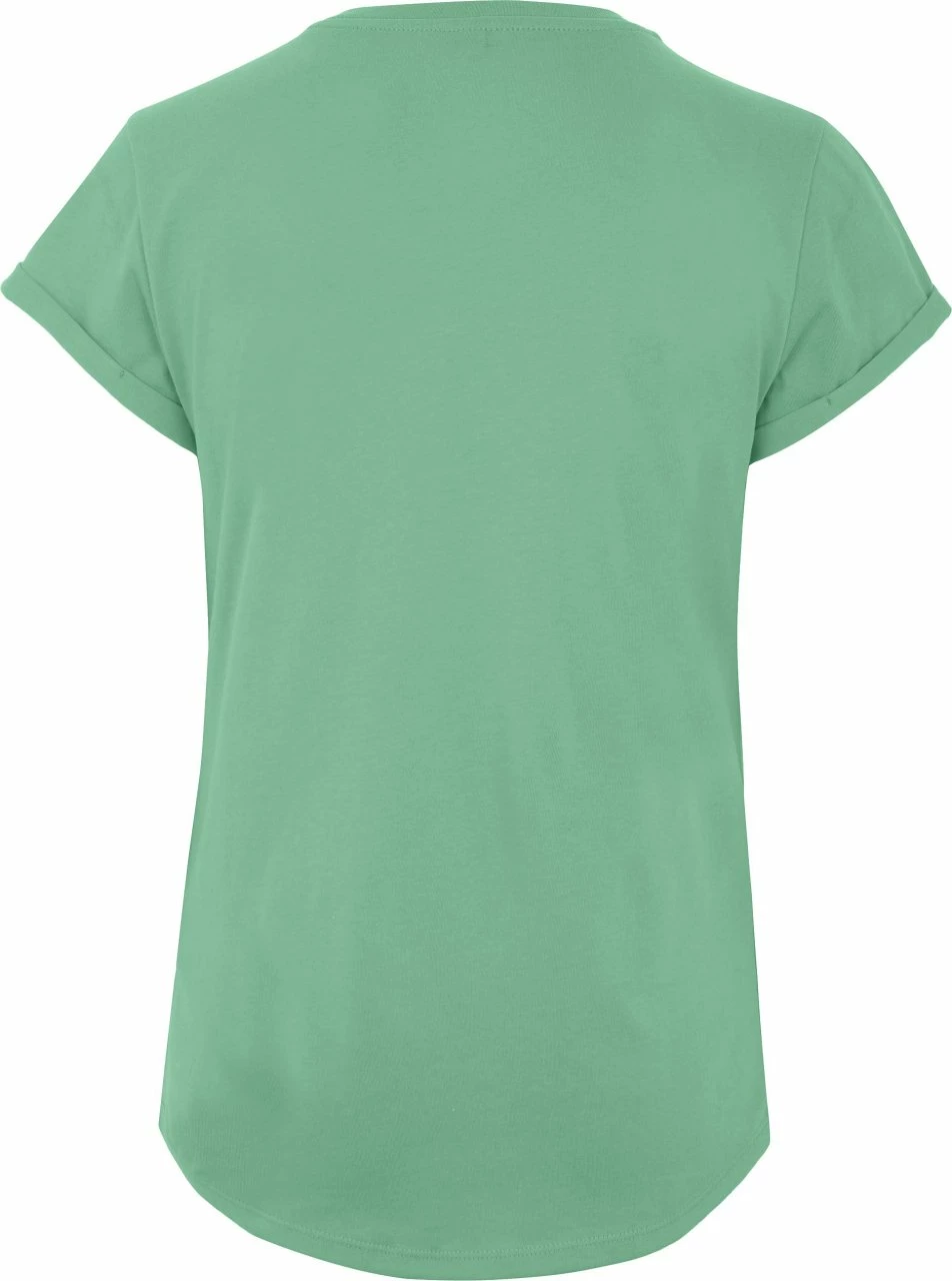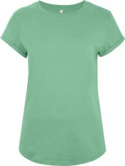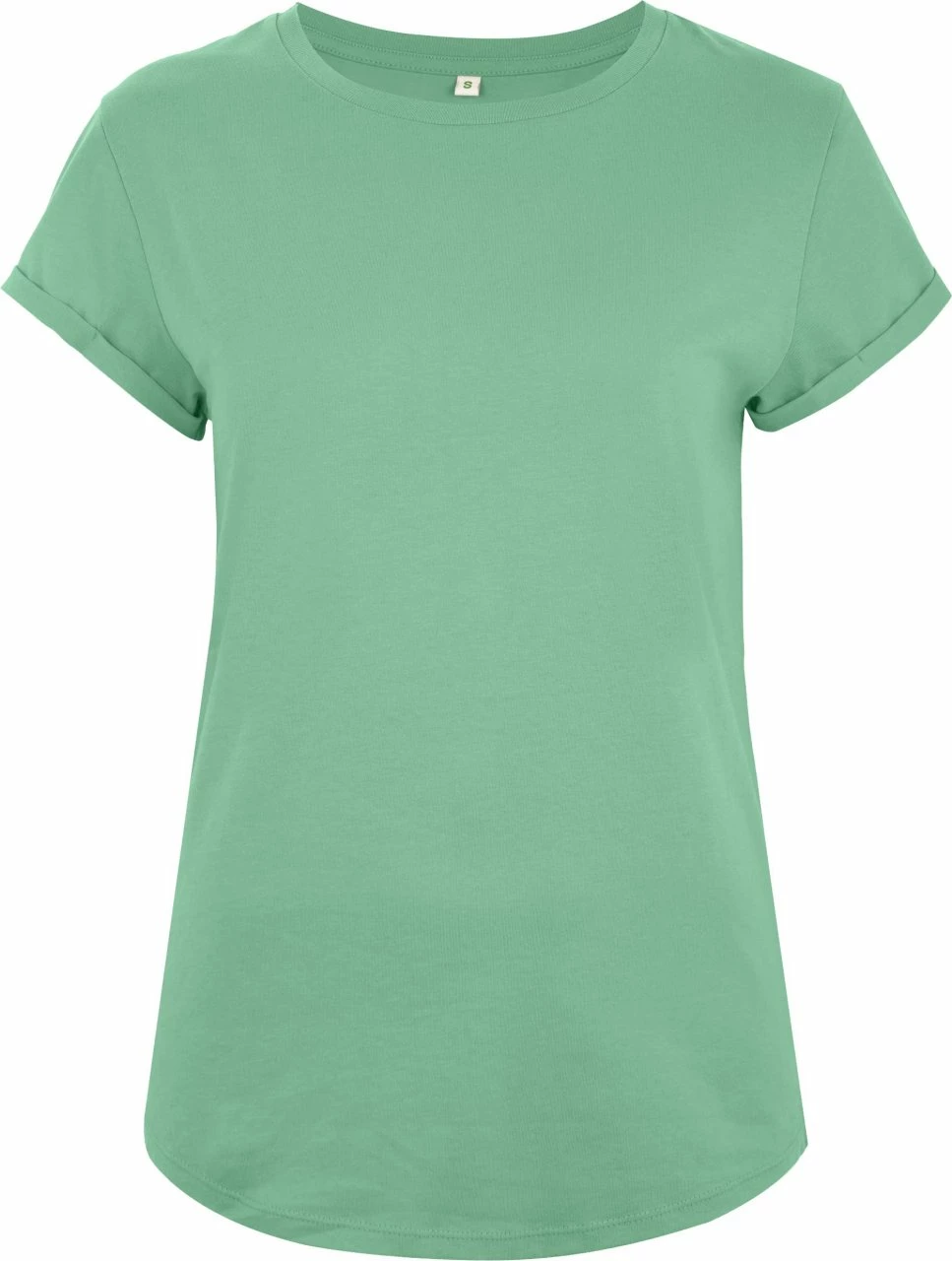 Relaxt geschnittenes Damen T-Shirt aus nachhaltiger Bio-Baumwolle. Das Shirt hat einen abgerundeten Saum und aufgerollte Ärmelenden, die an zwei Stellen abgenäht und somit fixiert sind.