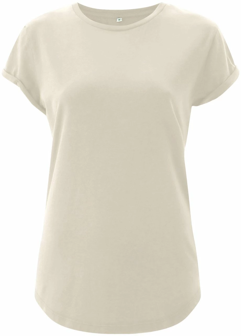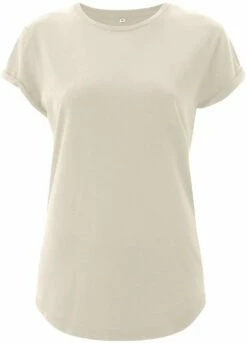 Relaxt geschnittenes Damen T-Shirt aus nachhaltiger Bio-Baumwolle. Das Shirt hat einen abgerundeten Saum und aufgerollte Ärmelenden, die an zwei Stellen abgenäht und somit fixiert sind.