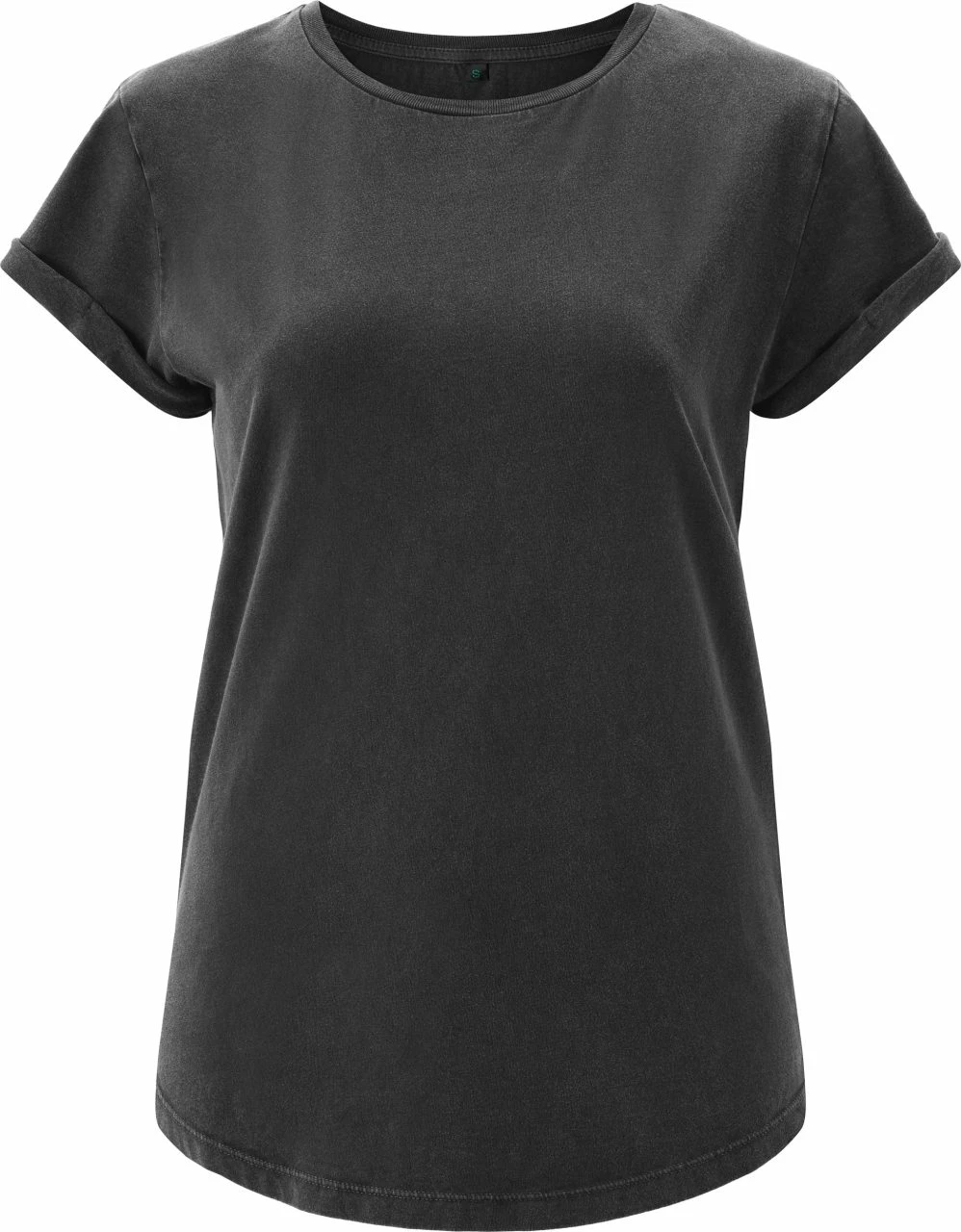 Relaxt geschnittenes Damen T-Shirt aus nachhaltiger Bio-Baumwolle. Das Shirt hat einen abgerundeten Saum und aufgerollte Ärmelenden, die an zwei Stellen abgenäht und somit fixiert sind. Die authentische Optik entsteht durch eine Stone-Wash-Verarbeitung, die nach dem exakt gleichen Verfahren wie bei Jeanshosen erfolgt.