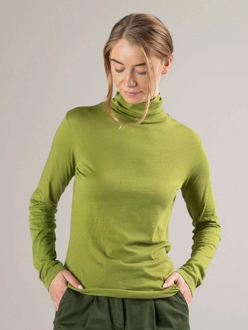 Körpernah geschnittenes Rollkragen-Langarmshirt aus reiner Bio-Baumwolle. Das Rollkragen-Longsleeve aus besonders feinem Jersey-Stoff kann im Sommer »solo« und im Winter als Grundlage für Winter-Outfits »drunter« getragen werden.