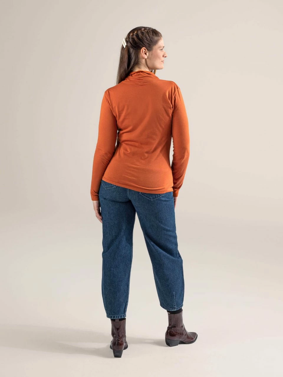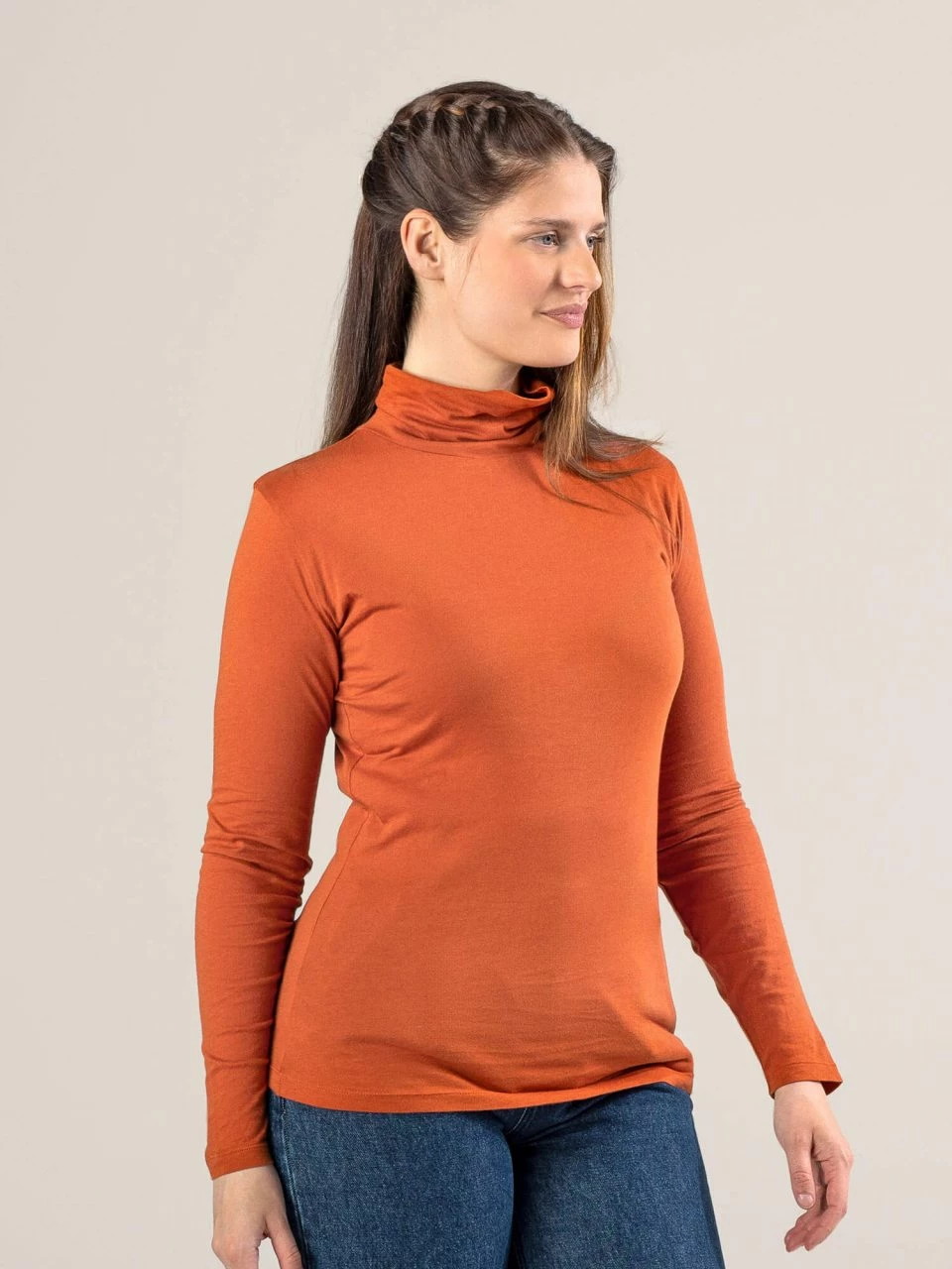 Körpernah geschnittenes Rollkragen-Langarmshirt aus reiner Bio-Baumwolle. Das Rollkragen-Longsleeve aus besonders feinem Jersey-Stoff kann im Sommer »solo« und im Winter als Grundlage für Winter-Outfits »drunter« getragen werden.