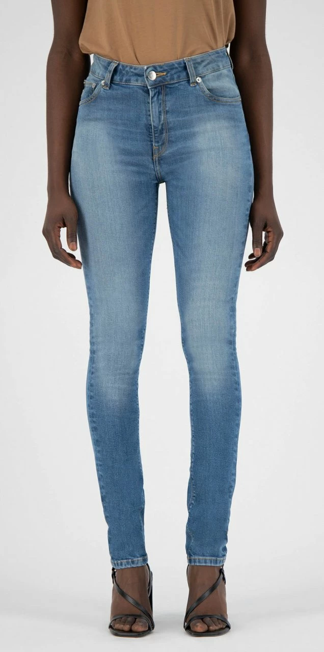 Eng geschnittene Jeans mit hoher Leibhöhe. Die High Waist Hose kommt mit einem aufgedruckten Logo auf der Rückseite sowie dezenten, silberfarbenen Nieten. Geschlossen wird diese Jeans mit einem Knopf und Reißverschluss.