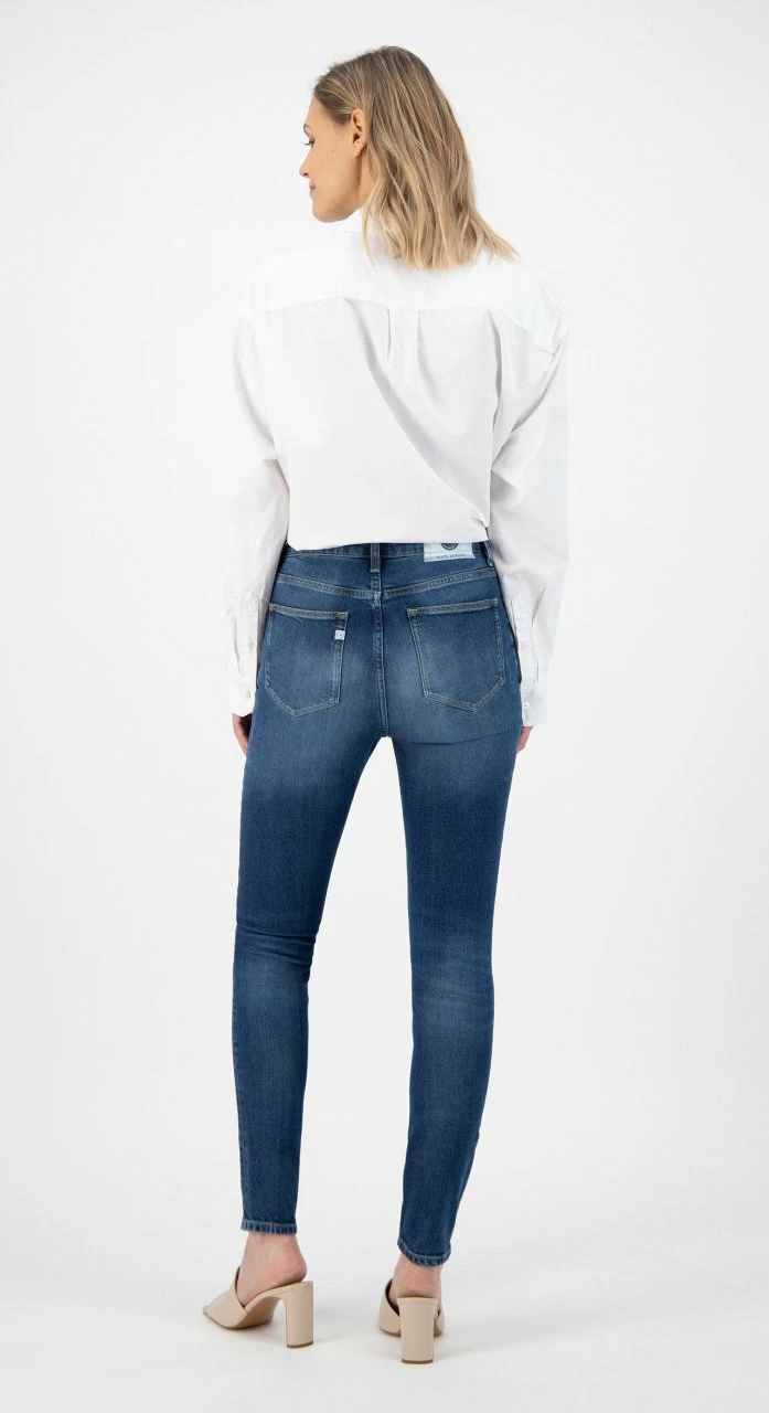 Eng geschnittene Jeans mit besonders hoher Leibhöhe aus nachhaltigem Stretch Denim. Die High Waist Hose kommt mit einem aufgedruckten Logo auf der Rückseite sowie dezenten, silberfarbenen Nieten. Geschlossen wird diese Jeans mit einem Knopf und Reißverschluss. Die Nähte sind in einer Kontrastfarbe zum Stoff gehalten und setzen sich ab.