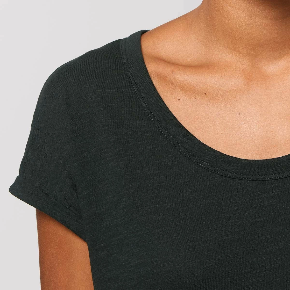 Etwas weiter geschnittenes T-Shirt aus reiner Bio-Baumwolle. Das Shirt hat kurze Seitenschlitze am Hüftabschluss und aufgerollte Ärmelenden, die an zwei Stellen abgenäht und somit fixiert sind. Der Single-Jersey Stoff ist leicht, angenehm weich und aus »Slub-Garn« hergestellt. Dieses Garn ist unregelmässig dick, dadurch entsteht ein authentischer Look mit leichter Struktur.