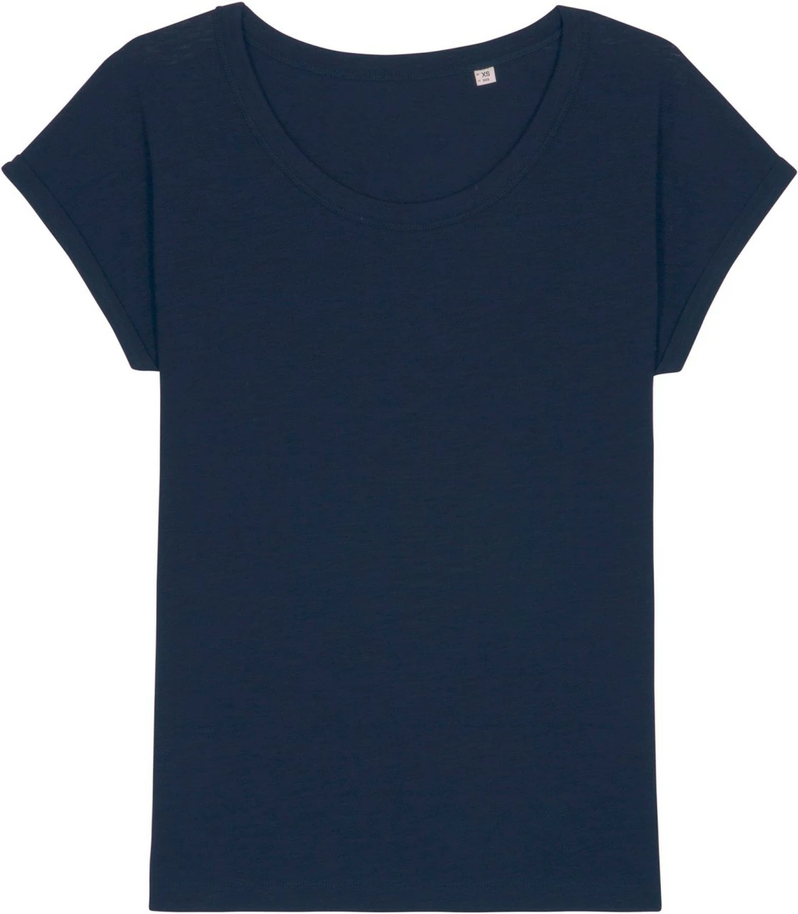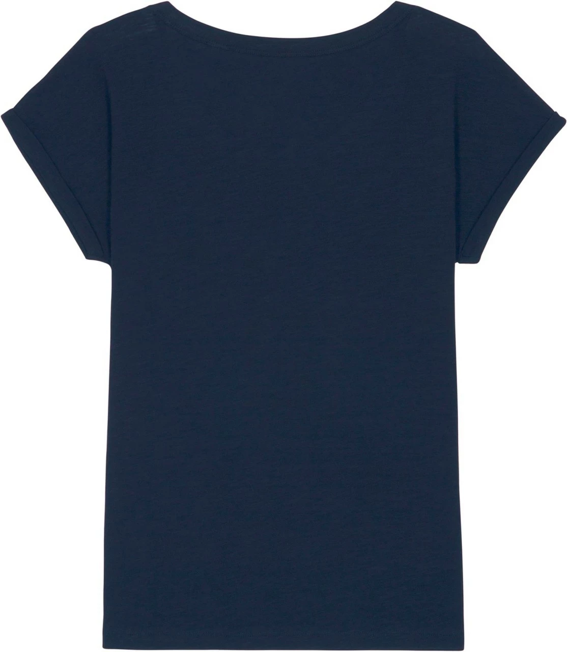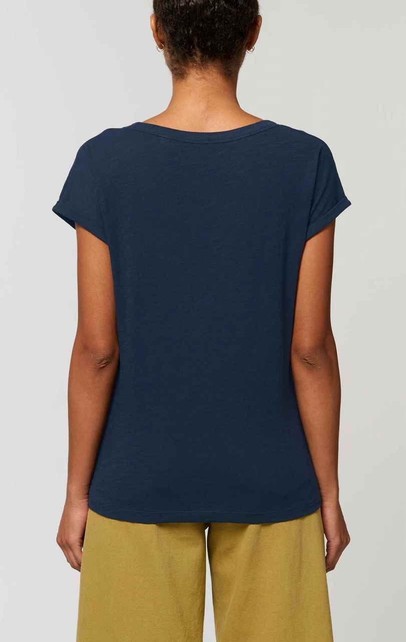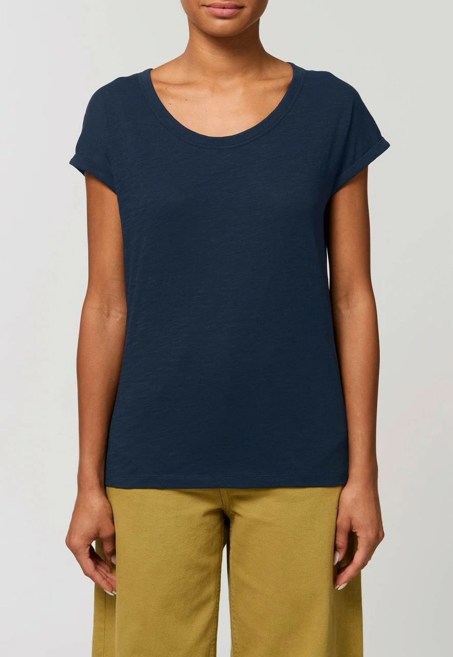 Etwas weiter geschnittenes T-Shirt aus reiner Bio-Baumwolle. Das Shirt hat kurze Seitenschlitze am Hüftabschluss und aufgerollte Ärmelenden, die an zwei Stellen abgenäht und somit fixiert sind. Der Single-Jersey Stoff ist leicht, angenehm weich und aus »Slub-Garn« hergestellt. Dieses Garn ist unregelmässig dick, dadurch entsteht ein authentischer Look mit leichter Struktur.