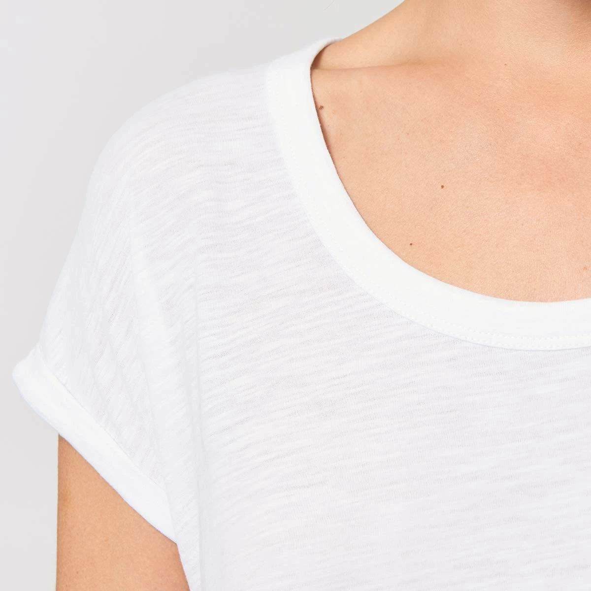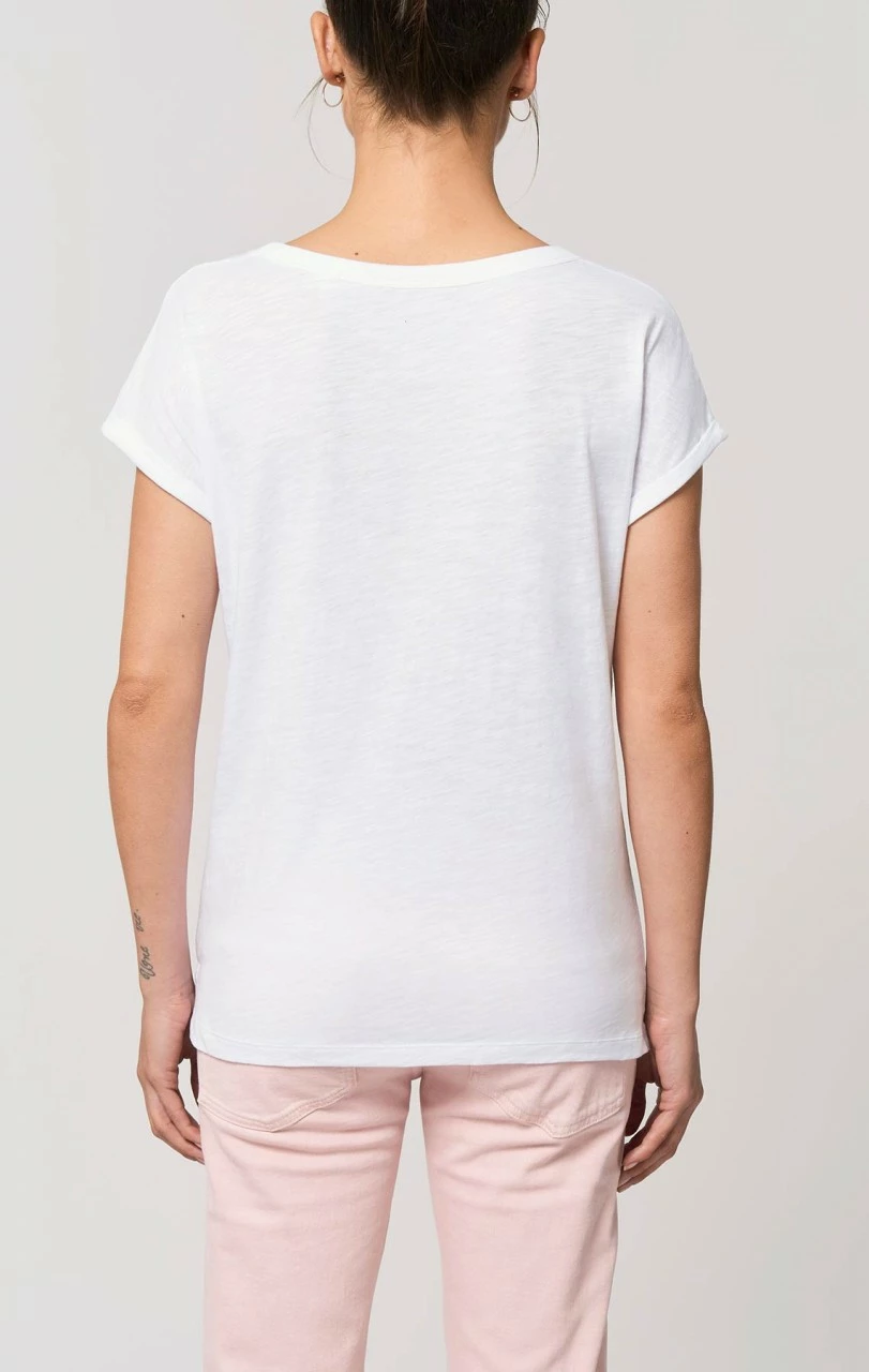 Etwas weiter geschnittenes T-Shirt aus reiner Bio-Baumwolle. Das Shirt hat kurze Seitenschlitze am Hüftabschluss und aufgerollte Ärmelenden, die an zwei Stellen abgenäht und somit fixiert sind. Der Single-Jersey Stoff ist leicht, angenehm weich und aus »Slub-Garn« hergestellt. Dieses Garn ist unregelmässig dick, dadurch entsteht ein authentischer Look mit leichter Struktur.
