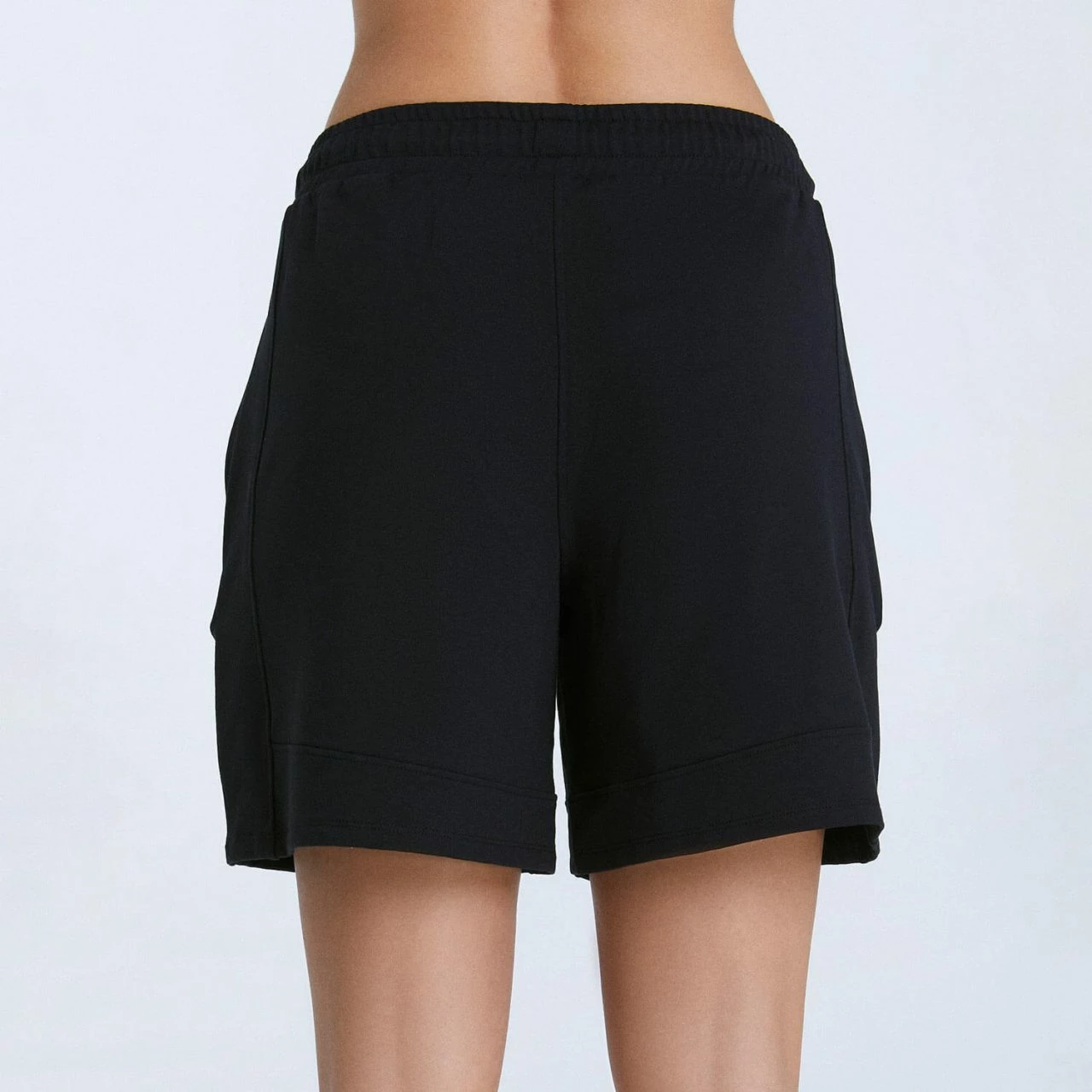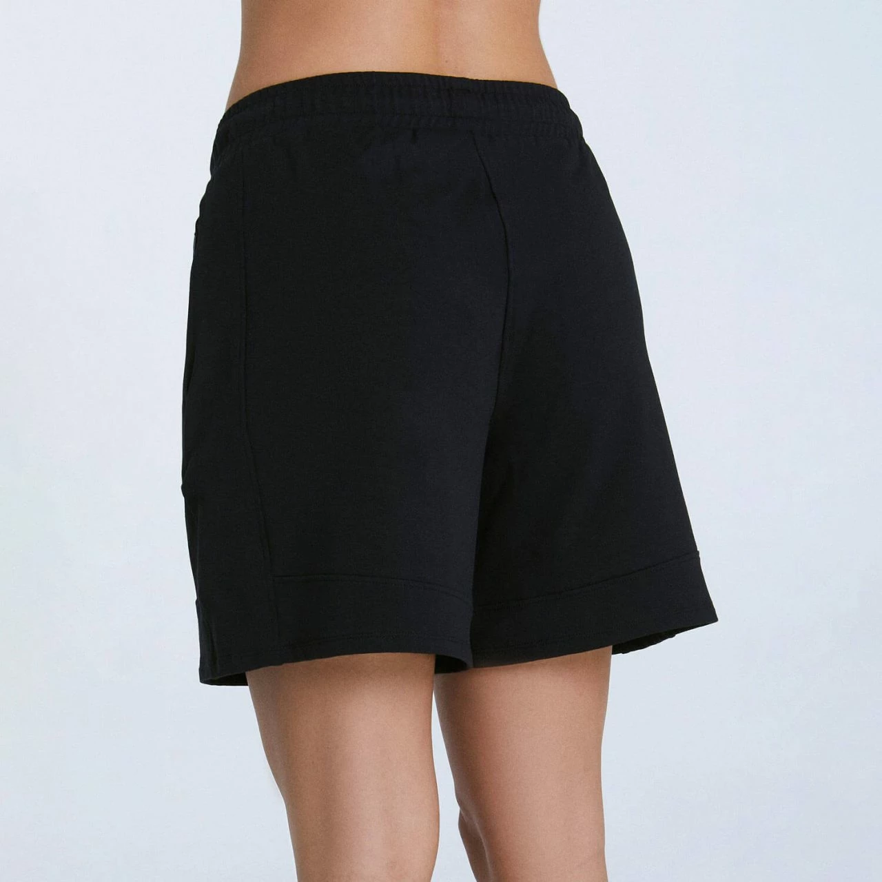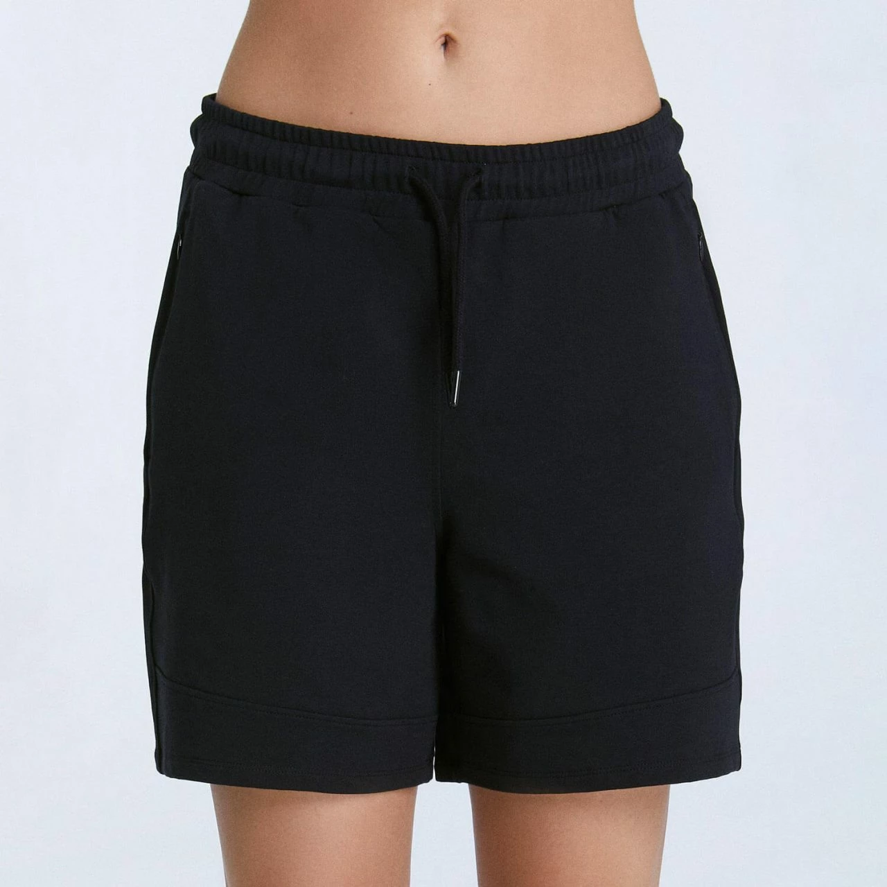 Damen Sport-Shorts aus 57% Bio-Baumwolle, 37% Modal und 6% Elastan. Die kurze Sporthose hat zwei praktische seitliche Eingrifftaschen mit Reißverschluss und bietet durch den elastischen Bund mit Kordelzug sicheren Halt. Der weiche und atmungsaktive Material-Mix eignet sich für sportliche Aktivitäten, lässt dich aber auch im Alltag gut aussehen.