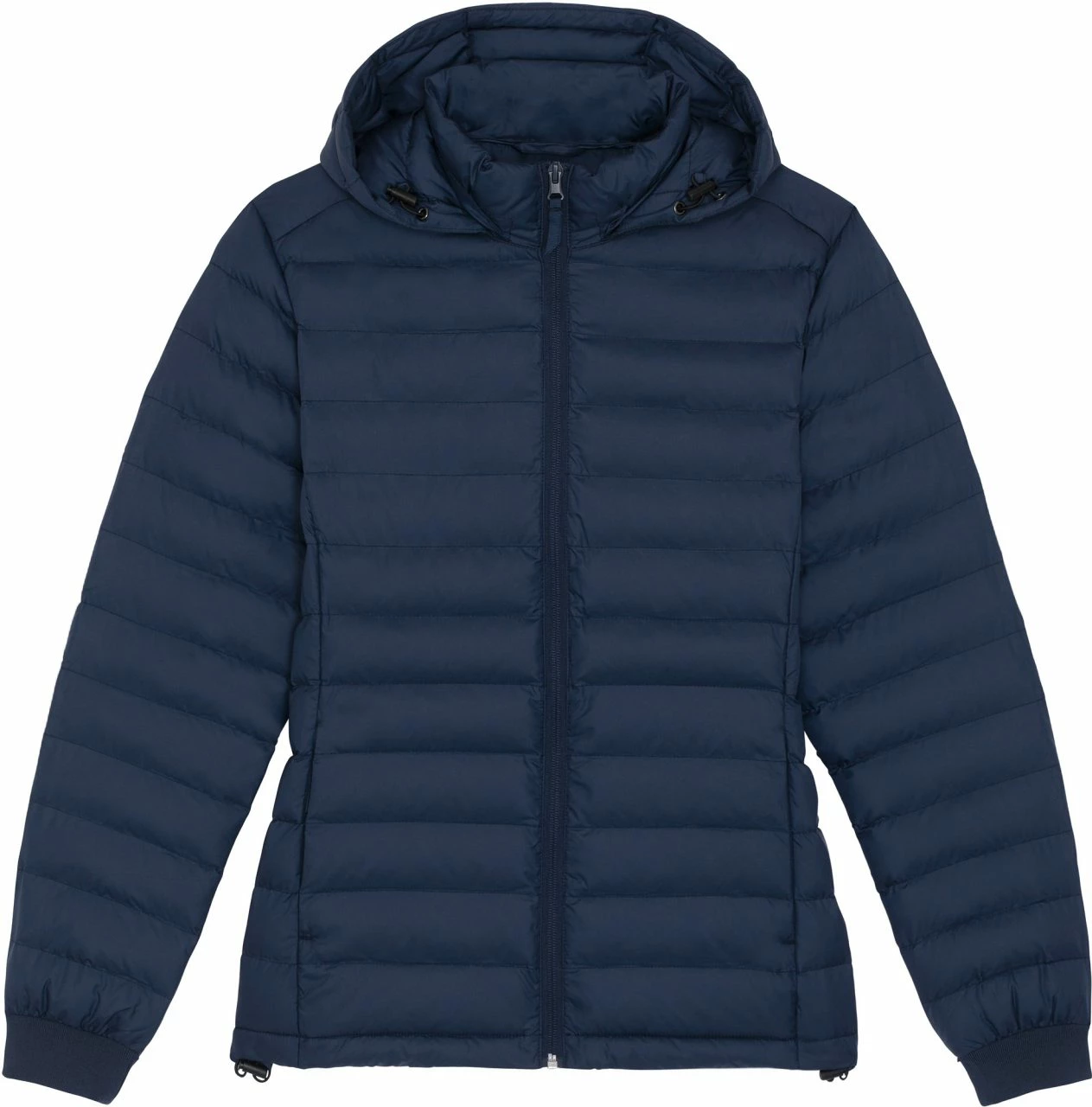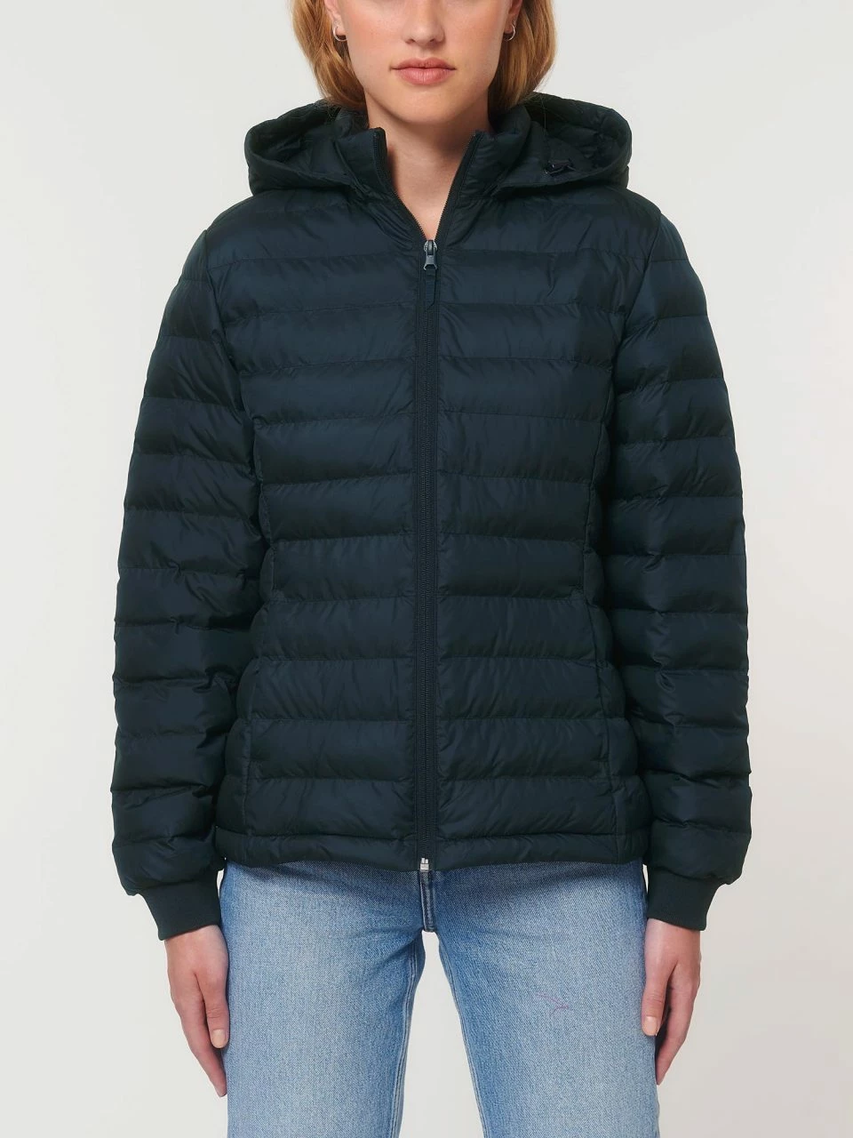 Hochwertige Damen Steppjacke aus recyceltem Polyester. Die vegane Jacke ist leicht tailliert geschnitten und hat seitliche Einsätze für eine verbesserte Passform. Der Nylon-Reißverschluss reicht bis zum hoch abschließenden Kragen, sodass der Hals vor Wind geschützt ist. Die Jacke bietet außen zwei Eingrifftaschen mit Reißverschluss. Auf der Innenseite befinden sich zwei Taschen auf Bauchhöhe. Die Ärmel schließen mit breiten Rippbündchen ab. Die abnehmbare Kapuze sowie der Saum können mit Gummizügen und Stoppern verstellt werden. Die leichte Wattierung aus recyceltem Polyester und die fluorfreie, wasserabweisende Beschichtung machen diese Jacke zur ersten Wahl für die ungemütliche Übergangszeit.