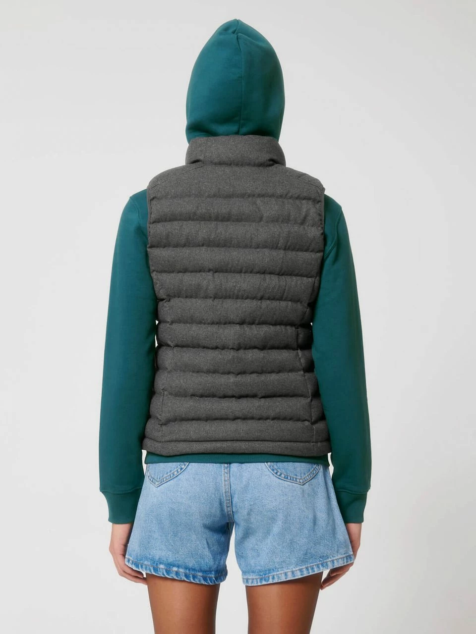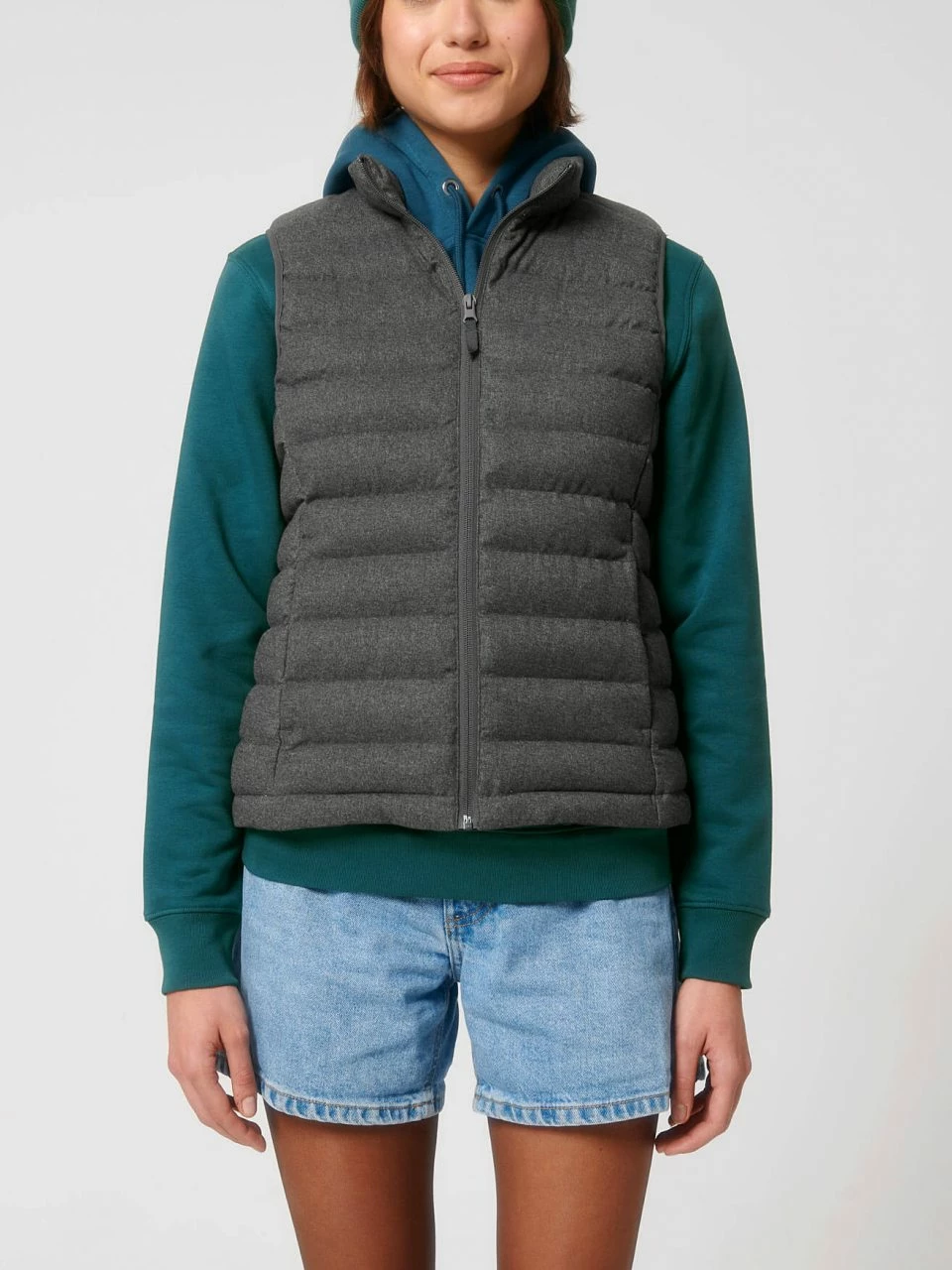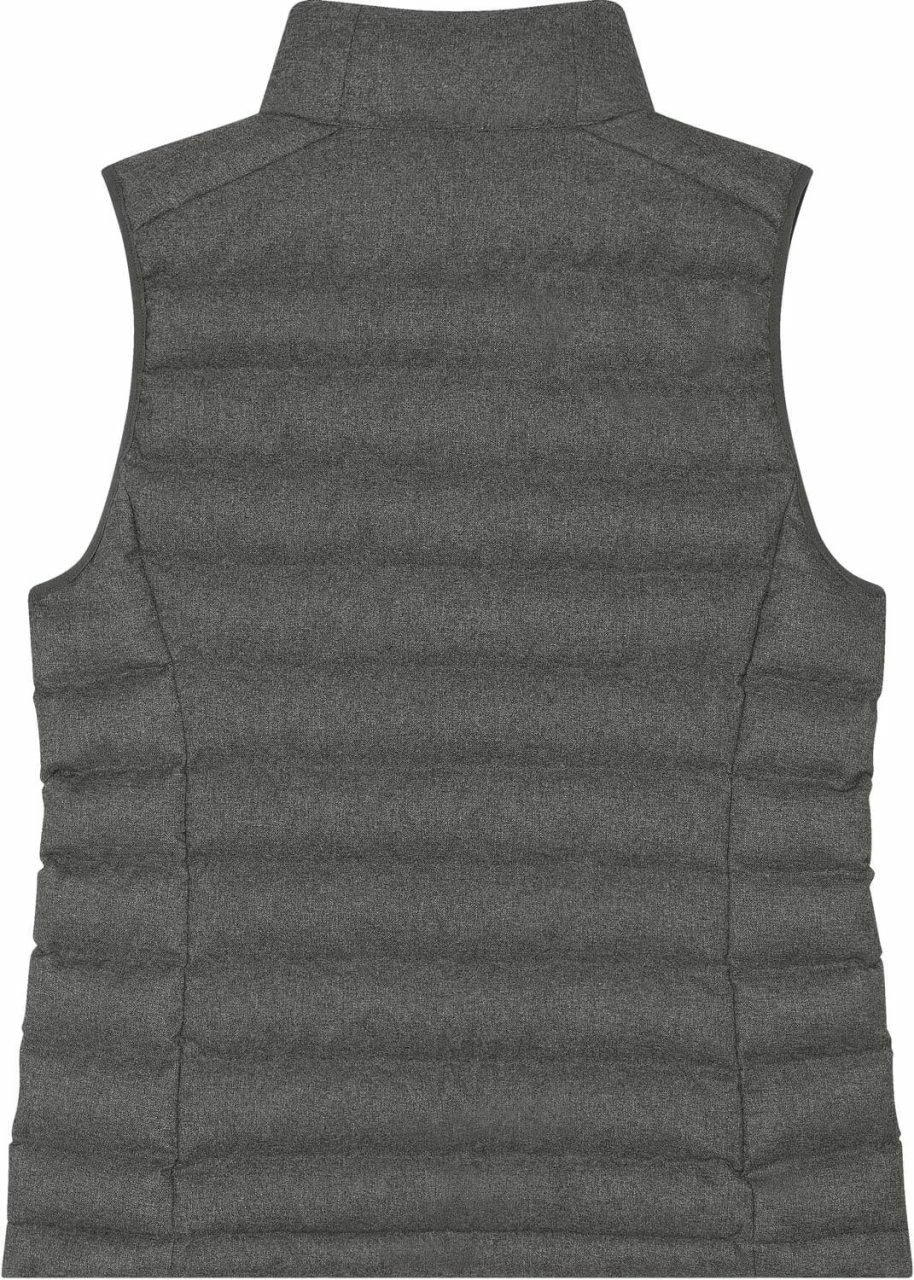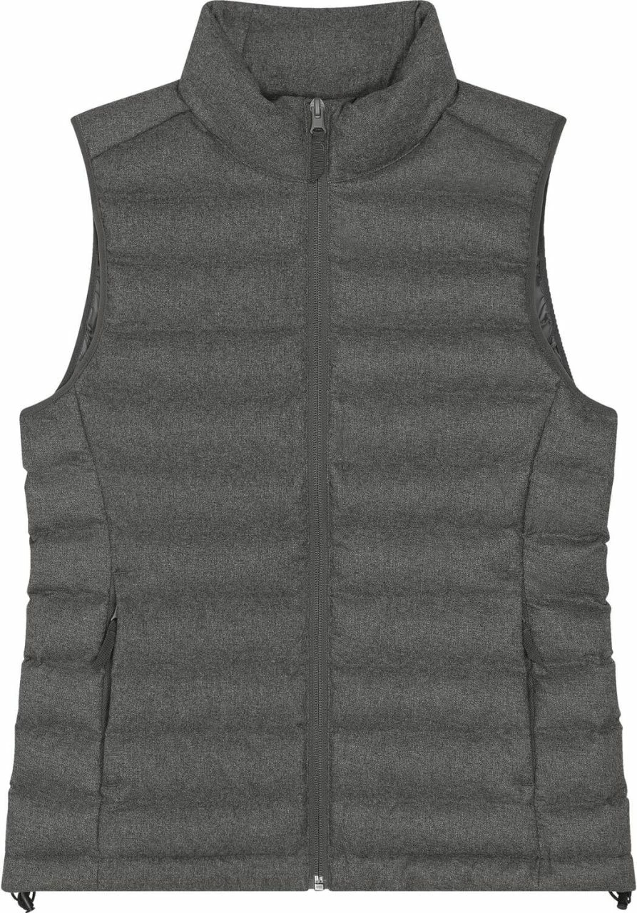 Hochwertige Damen Steppweste aus recyceltem Polyester. Die vegane Weste ist leicht tailliert geschnitten und hat seitliche Einsätze für eine verbesserte Passform. Der äußere Stoff ist aufgeraut und erinnert an Wollfilz. Der Nylon-Reißverschluss reicht bis zum hoch abschließenden Kragen, sodass der Hals vor Wind geschützt ist. Die Weste bietet außen zwei Eingrifftaschen mit Reißverschluss. Auf der Innenseite befinden sich zwei zusätzliche Taschen. Der Hüftsaum ist mit einem Gummizug versehen, der mit einem Stopper angepasst werden kann. Die leichte Wattierung aus recyceltem Polyester und die fluorfreie, wasserabweisende Beschichtung machen diese Weste zur ersten Wahl für die ungemütliche Übergangszeit.