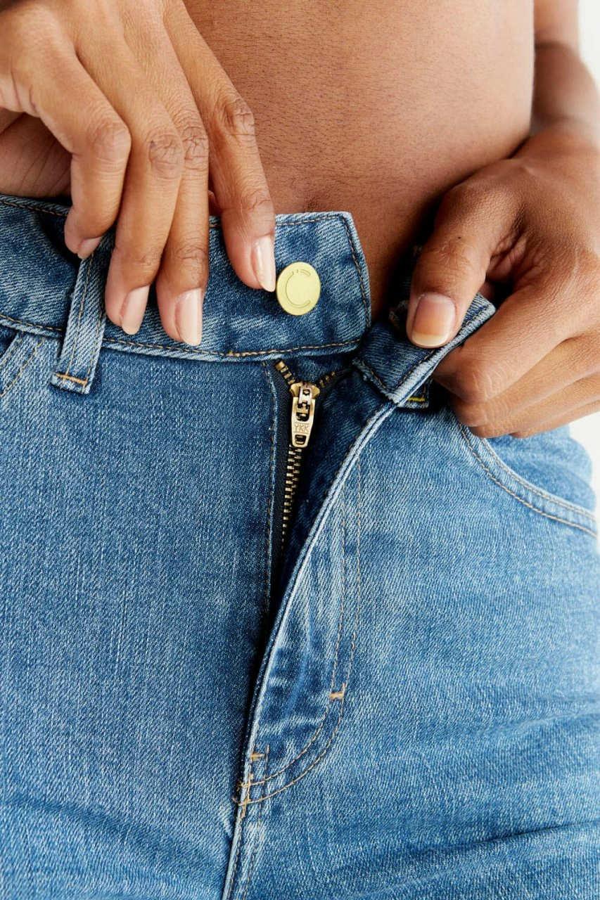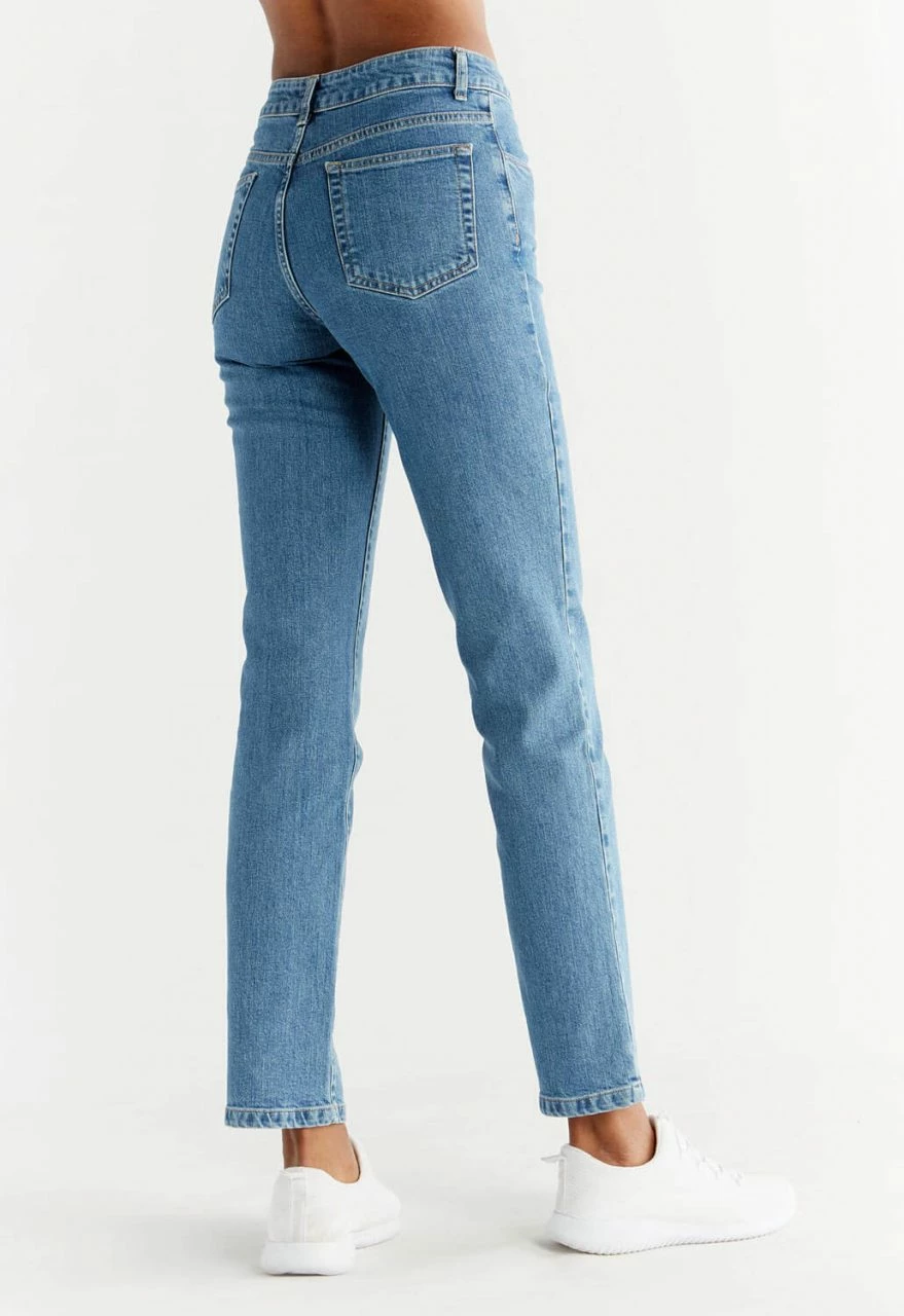 Gerade geschnittene Damen Jeans aus nachhaltigen Materialien. Das Hosenbein sitzt etwas lockerer und bietet so hohen Tragekomfort und viel Bewegungsfreiheit. Die Straight Fit Jeans präsentiert sich in einem cleanen Look komplett ohne Nieten oder Patches. Geschlossen wird die Hose mit einem matt schimmernden, gelben Knopf und YKK NATULON® Zipper aus recyceltem Polyester. Das Nähgarn in Kontrastfarbe besteht ebenfalls aus wiederverwertetem Polyester (Coats Epic EcoVerde).