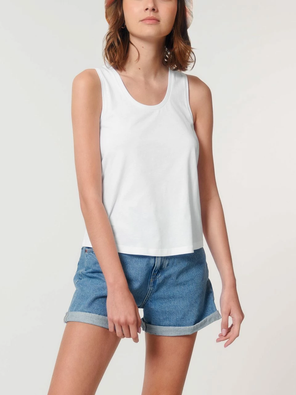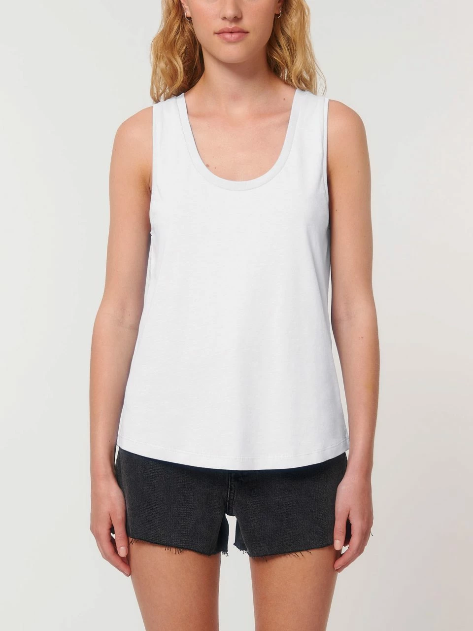 Tanktop aus reiner Bio-Baumwolle. Der Rundhalsausschnitt und die breiten Träger sind mit einem feinen Rippbündchen eingefasst. Der abgerundete Saum ist leicht ausgestellt. Der weiche Single-Jersey Stoff liegt angenehm auf der Haut.