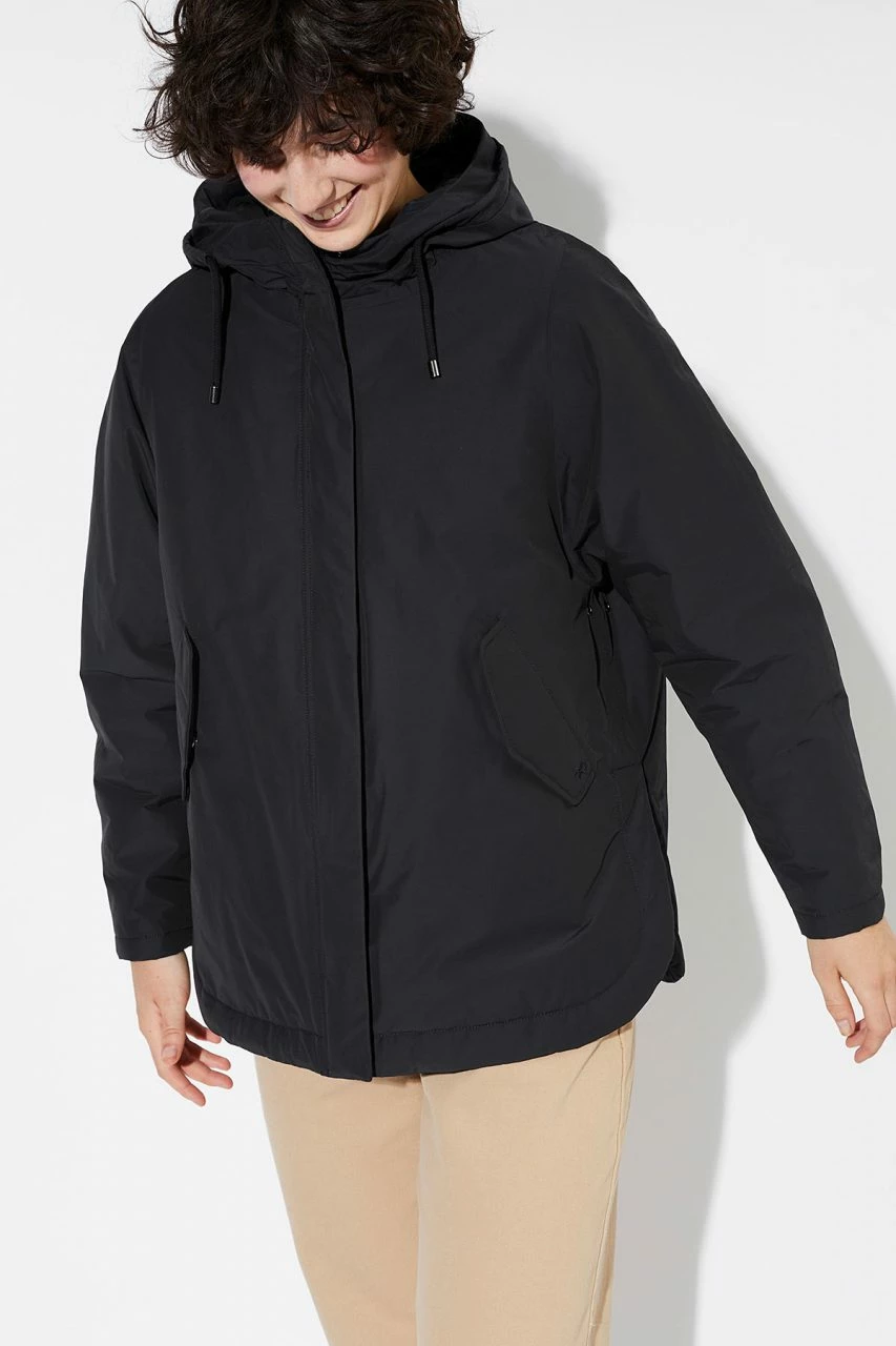Theba Padded ist eine stilsichere, urbane Winterjacke aus langlebigem Materialmix aus Bio-Baumwolle und recyceltem Nylon mit wetterfester Polyurethan-Membran. Die wasserabweisende Jacke mit großer Kapuze ist locker geschnitten. Die seitlichen, abgerundeten Schlitze am Saum können mit einem Druckknopf geschlossen werden. Eine Wattierung aus recyceltem Polyester hält bei kalten Temperaturen warm, das Jersey-Futter aus TENCEL™ Lyocell ist angenehm weich. Dank der zwei seitlichen Eingrifftaschen sind die nötigsten Dinge immer schnell zur Hand. Zwei große Druckknopf-Taschen an der Innenseite bieten zusätzlichen Stauraum. Der hoch schließende Kragen sorgt für zuverlässigen Schutz vor Wind und Kälte.