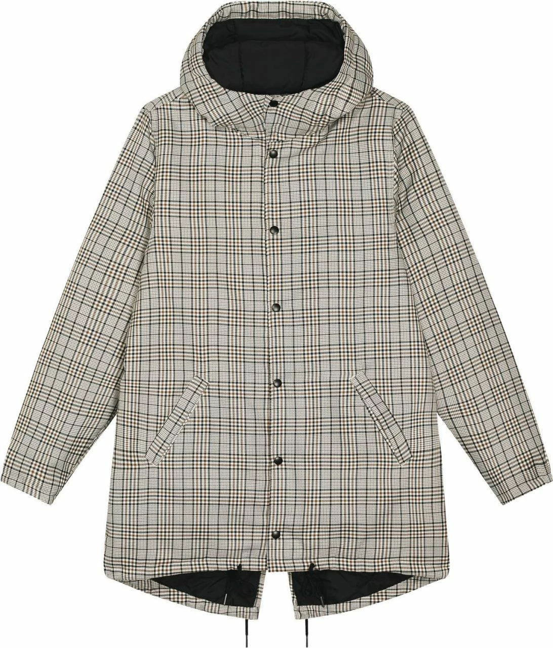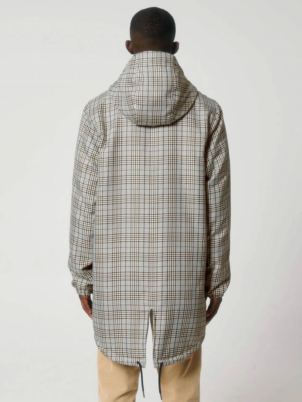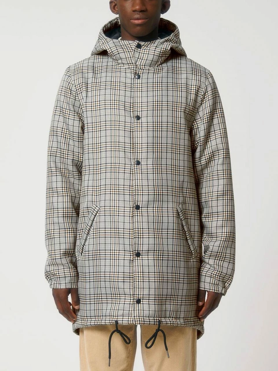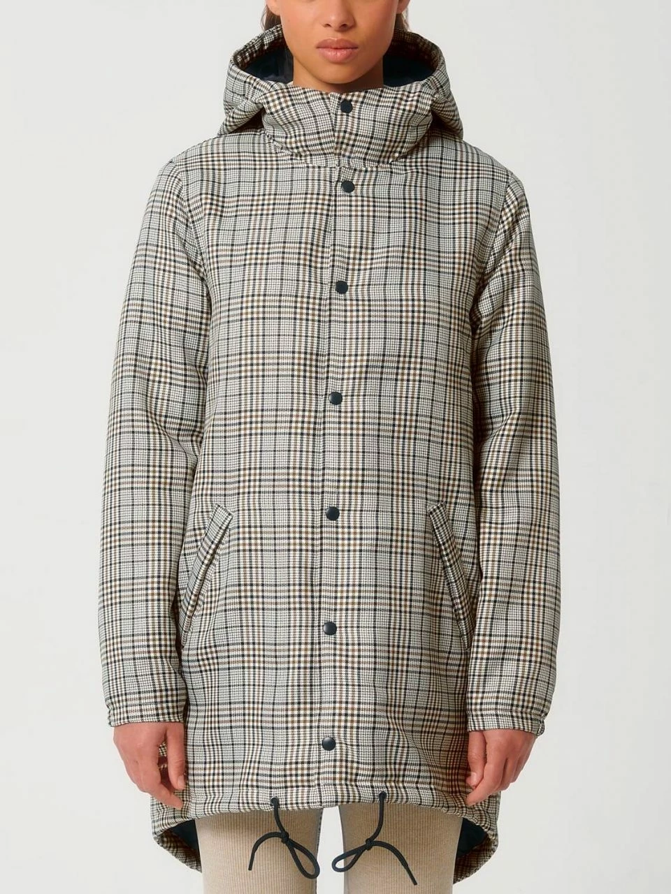 Leicht wattierter Unisex Parka aus recyceltem Polyester. Die Außenseite besteht aus griffigem Twill mit Karo-Muster. Die vegane Jacke ist lang und bequem geschnitten, sodass sie ohne Probleme in Kombination mit dicken Pullovern getragen werden kann. Die leichte Wattierung, mit der die gesamte Jacke ausgestattet ist, und die fluorfreie, wasserabweisende Beschichtung sind die ideale Voraussetzungen, um dem ungemütlichen Herbstwetter zu trotzen. Geschlossen wird die Jacke bis zum hochabschließenden Kragen mit einer Metallknopf-Leiste. Einen zusätzlichen Reißverschluss hat sie nicht. Die Ärmeln schließen mit halb-elastischen Bündchen ab. Der Saum kann mit Kordeln und die Kapuze mit einem Gummizug und Stoppern verstellt werden. Die Übergangs-Jacke bietet außen zwei Paspeltaschen.