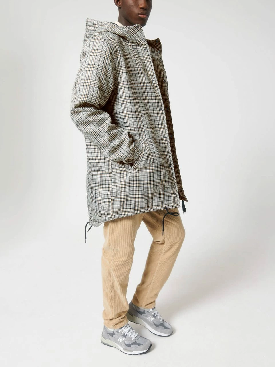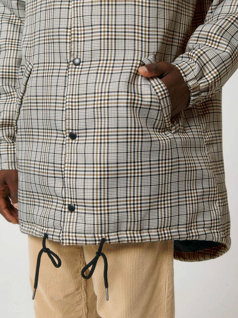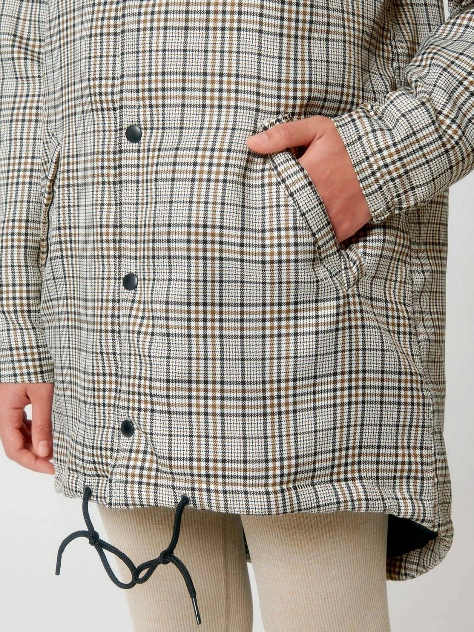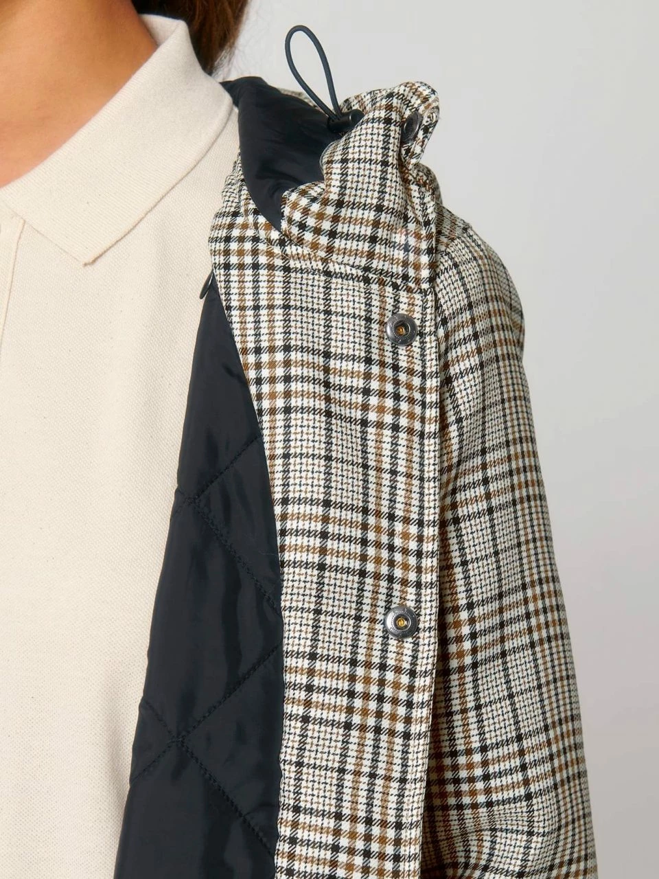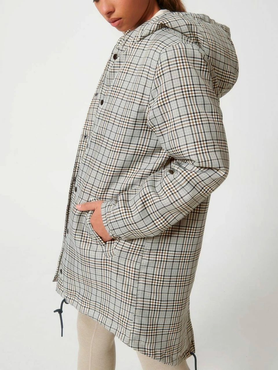 Leicht wattierter Unisex Parka aus recyceltem Polyester. Die Außenseite besteht aus griffigem Twill mit Karo-Muster. Die vegane Jacke ist lang und bequem geschnitten, sodass sie ohne Probleme in Kombination mit dicken Pullovern getragen werden kann. Die leichte Wattierung, mit der die gesamte Jacke ausgestattet ist, und die fluorfreie, wasserabweisende Beschichtung sind die ideale Voraussetzungen, um dem ungemütlichen Herbstwetter zu trotzen. Geschlossen wird die Jacke bis zum hochabschließenden Kragen mit einer Metallknopf-Leiste. Einen zusätzlichen Reißverschluss hat sie nicht. Die Ärmeln schließen mit halb-elastischen Bündchen ab. Der Saum kann mit Kordeln und die Kapuze mit einem Gummizug und Stoppern verstellt werden. Die Übergangs-Jacke bietet außen zwei Paspeltaschen.
