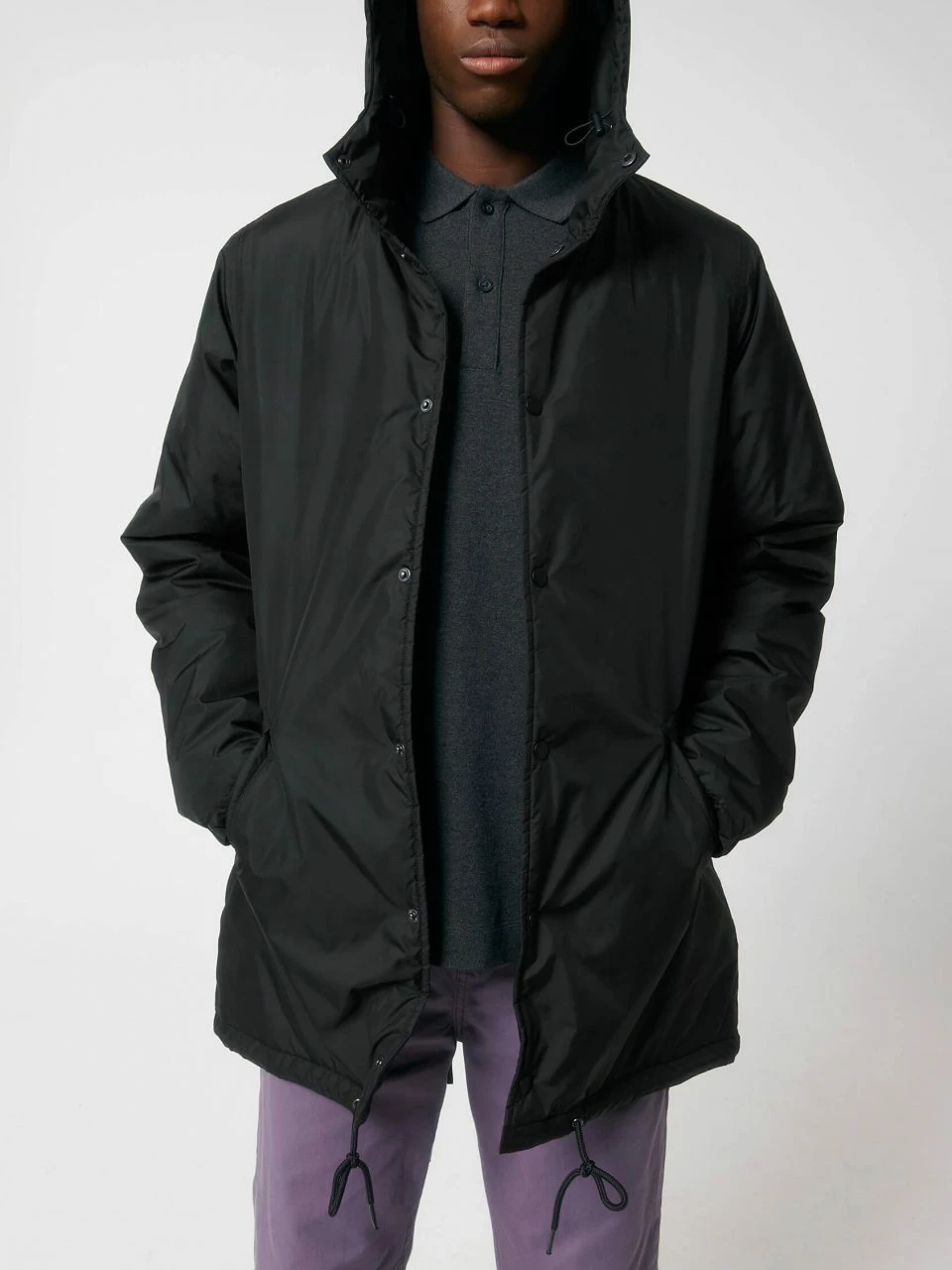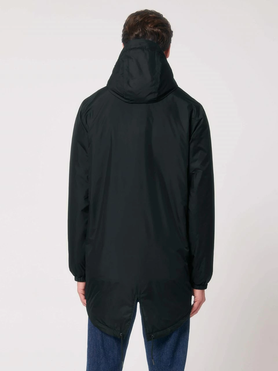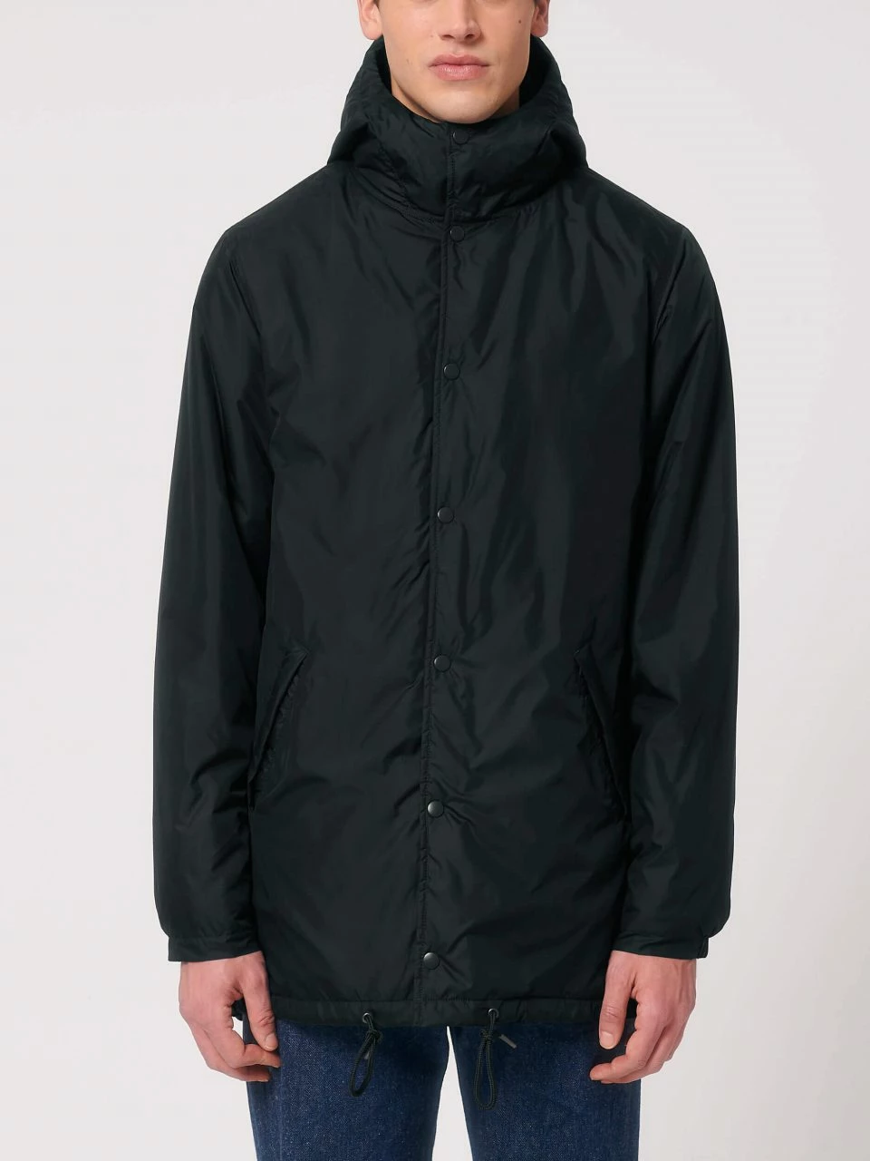 Leicht wattierter Unisex Parka aus recyceltem Polyester. Die Außenseite besteht aus glattem Taftgewebe. Die Jacke ist lang und bequem geschnitten, sodass sie ohne Probleme in Kombination mit dicken Pullovern getragen werden kann. Die leichte Wattierung, mit der die gesamte Jacke ausgestattet ist, und die fluorfreie, wasserabweisende Beschichtung sind die ideale Voraussetzungen, um dem ungemütlichen Herbstwetter zu trotzen. Geschlossen wird die Jacke bis zum hochabschließenden Kragen mit einer Metallknopf-Leiste. Einen zusätzlichen Reißverschluss hat sie nicht. Die Ärmeln schließen mit halb-elastischen Bündchen ab. Der Saum kann mit Kordeln und die Kapuze mit einem Gummizug und Stoppern verstellt werden. Die Übergangs-Jacke bietet außen zwei Paspeltaschen.