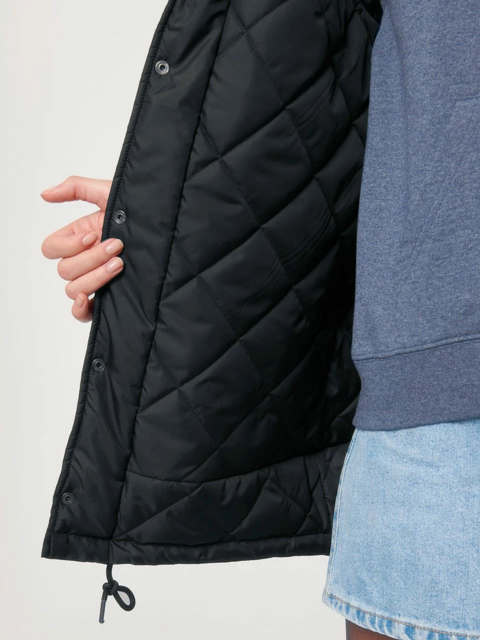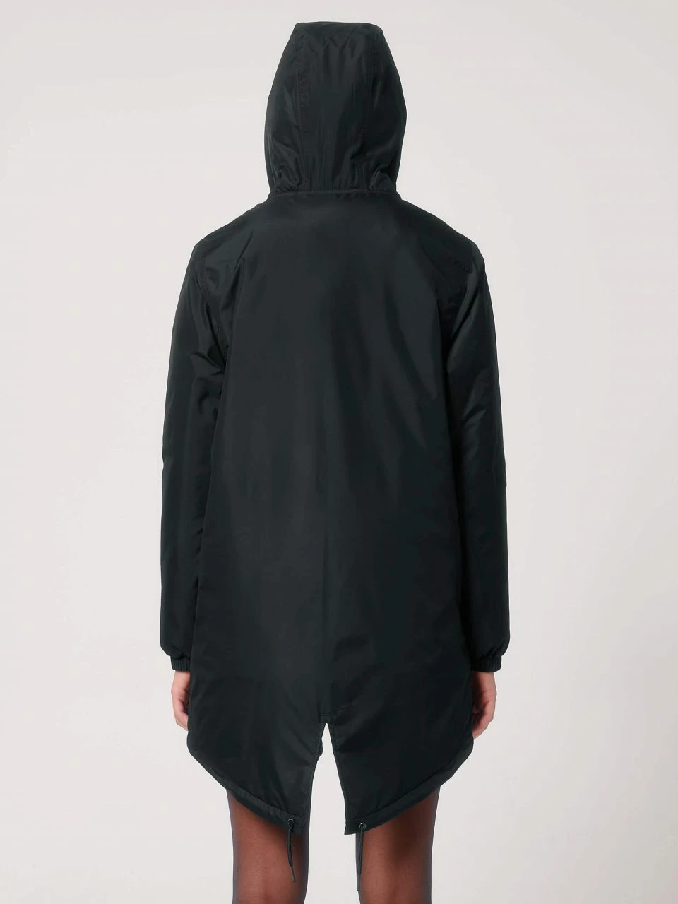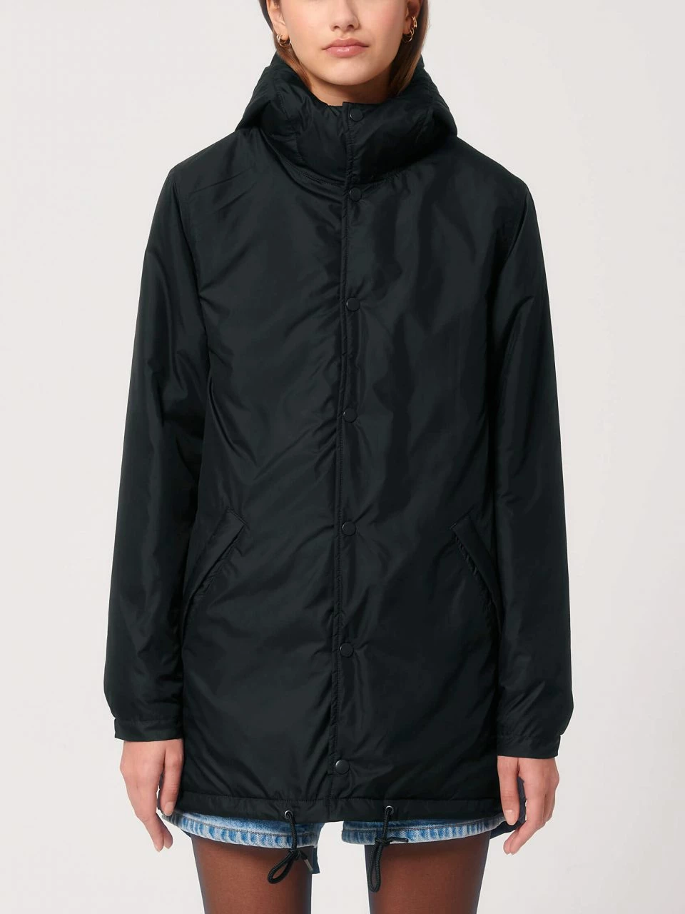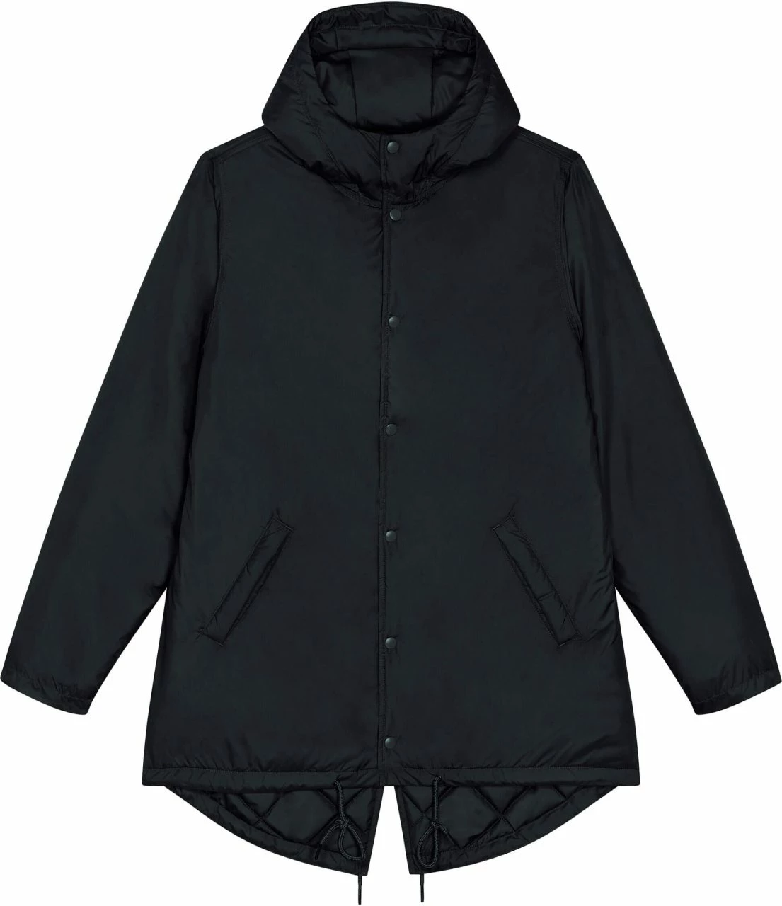 Leicht wattierter Unisex Parka aus recyceltem Polyester. Die Außenseite besteht aus glattem Taftgewebe. Die Jacke ist lang und bequem geschnitten, sodass sie ohne Probleme in Kombination mit dicken Pullovern getragen werden kann. Die leichte Wattierung, mit der die gesamte Jacke ausgestattet ist, und die fluorfreie, wasserabweisende Beschichtung sind die ideale Voraussetzungen, um dem ungemütlichen Herbstwetter zu trotzen. Geschlossen wird die Jacke bis zum hochabschließenden Kragen mit einer Metallknopf-Leiste. Einen zusätzlichen Reißverschluss hat sie nicht. Die Ärmeln schließen mit halb-elastischen Bündchen ab. Der Saum kann mit Kordeln und die Kapuze mit einem Gummizug und Stoppern verstellt werden. Die Übergangs-Jacke bietet außen zwei Paspeltaschen.