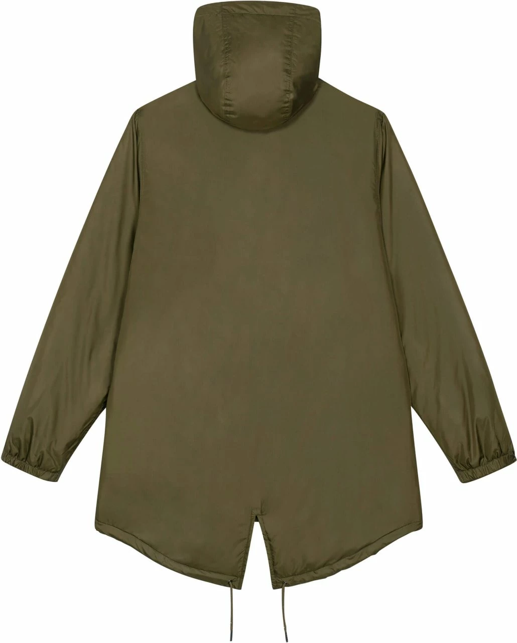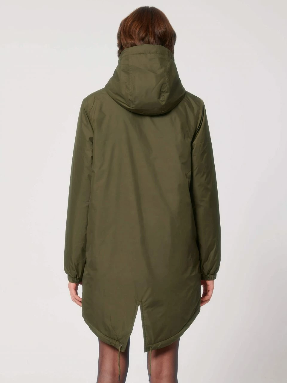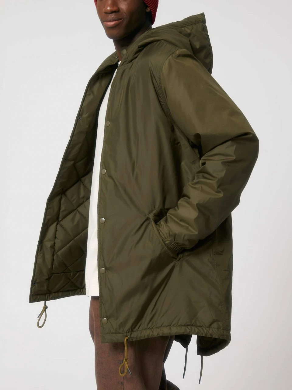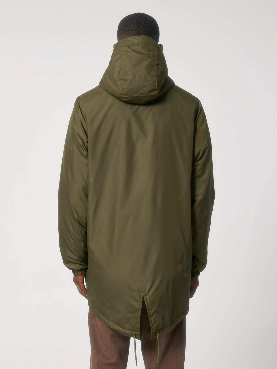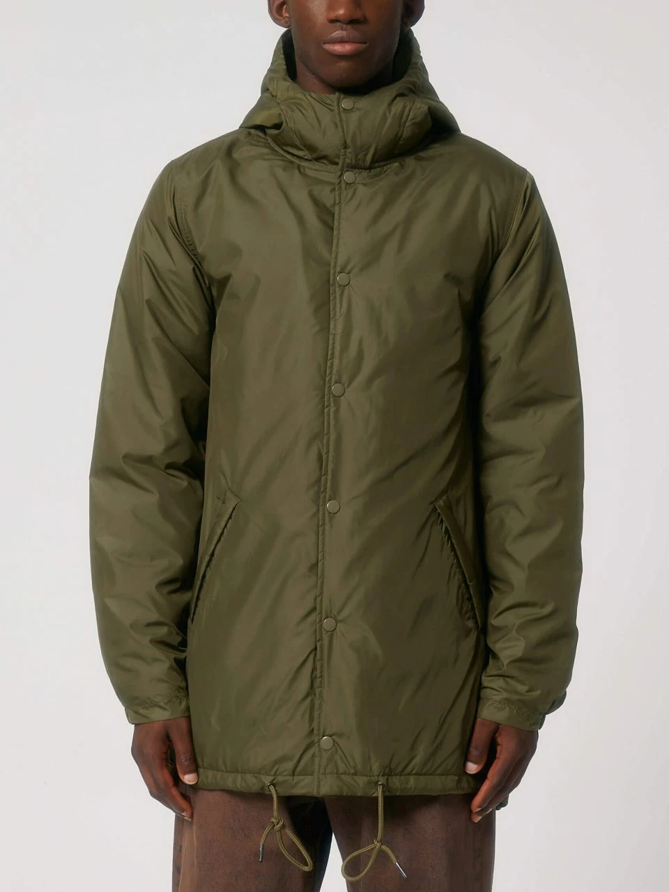 Leicht wattierter Unisex Parka aus recyceltem Polyester. Die Außenseite besteht aus glattem Taftgewebe. Die Jacke ist lang und bequem geschnitten, sodass sie ohne Probleme in Kombination mit dicken Pullovern getragen werden kann. Die leichte Wattierung, mit der die gesamte Jacke ausgestattet ist, und die fluorfreie, wasserabweisende Beschichtung sind die ideale Voraussetzungen, um dem ungemütlichen Herbstwetter zu trotzen. Geschlossen wird die Jacke bis zum hochabschließenden Kragen mit einer Metallknopf-Leiste. Einen zusätzlichen Reißverschluss hat sie nicht. Die Ärmeln schließen mit halb-elastischen Bündchen ab. Der Saum kann mit Kordeln und die Kapuze mit einem Gummizug und Stoppern verstellt werden. Die Übergangs-Jacke bietet außen zwei Paspeltaschen.