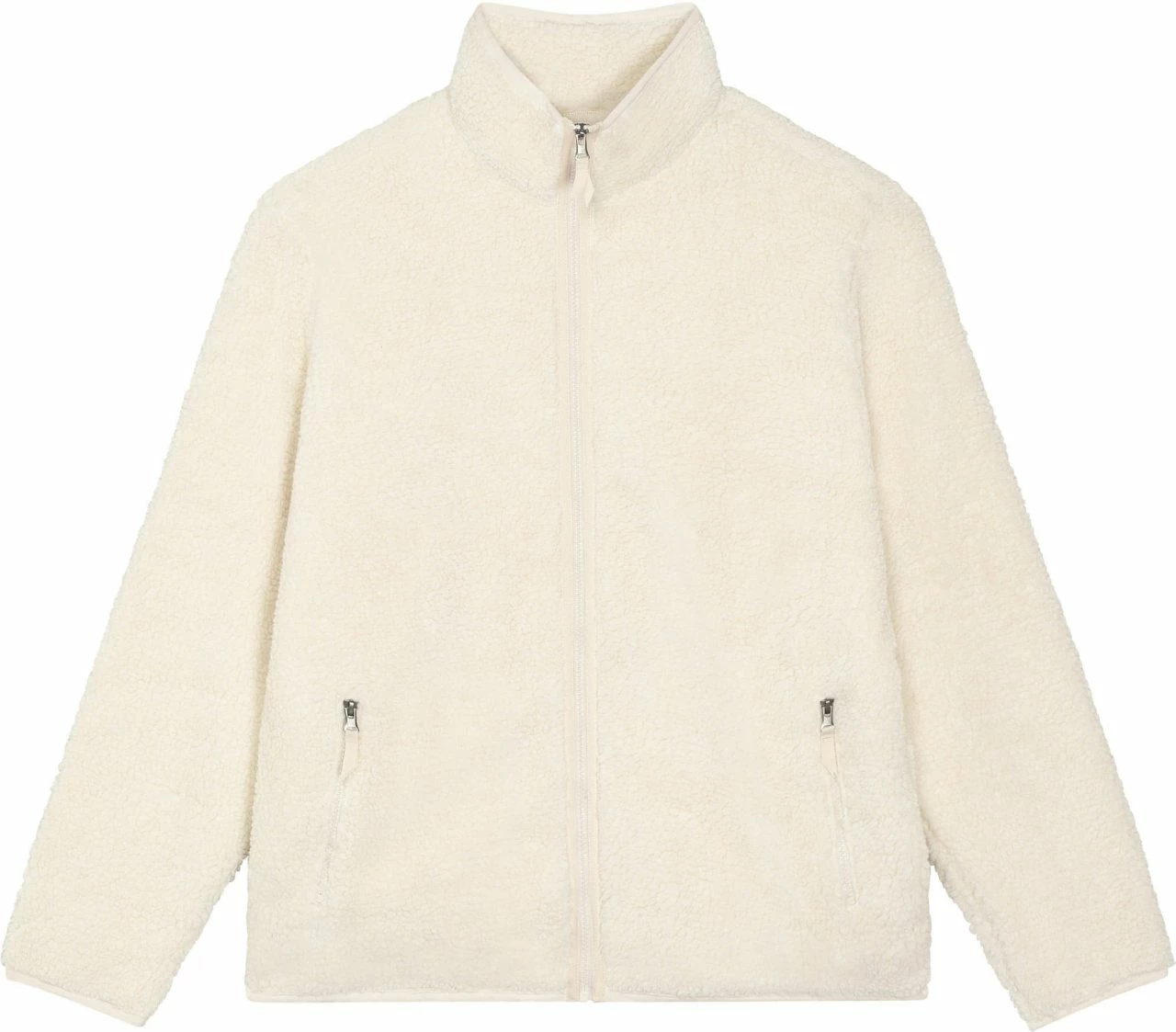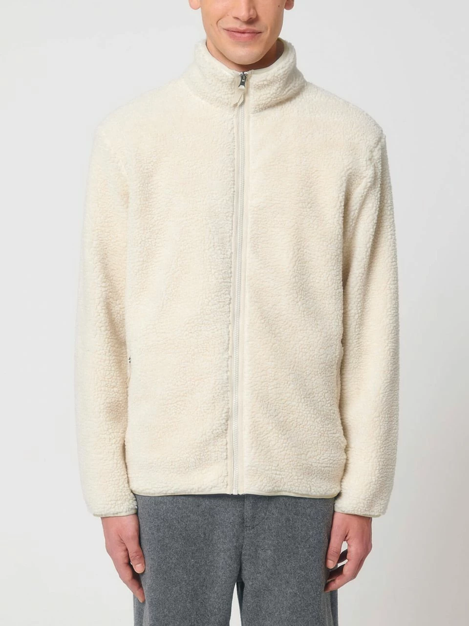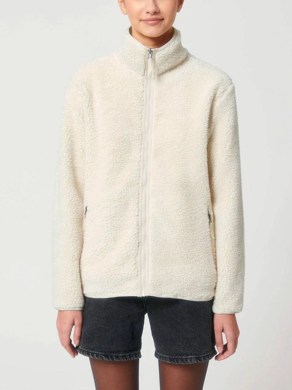 Unisex Sherpa-Jacke aus recyceltem Polyester. Die vegane Jacke ist gerade geschnitten und hat eine kuschlige Außenseite im Schaffell-Look. Der Nylon-Reißverschluss reicht bis zum hoch abschließenden Kragen, sodass der Hals vor Wind geschützt ist. Die Jacke bietet außen zwei Eingrifftaschen mit Reißverschluss. Die Ärmel schließen mit schmalen Bündchen ab. Das Futter besteht am Körper aus atmungsaktivem Mesh, in den Ärmeln aus glattem Taft.