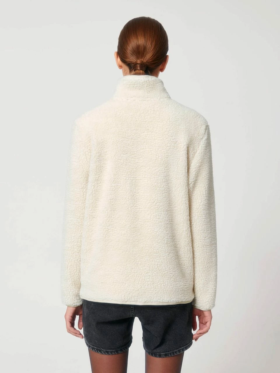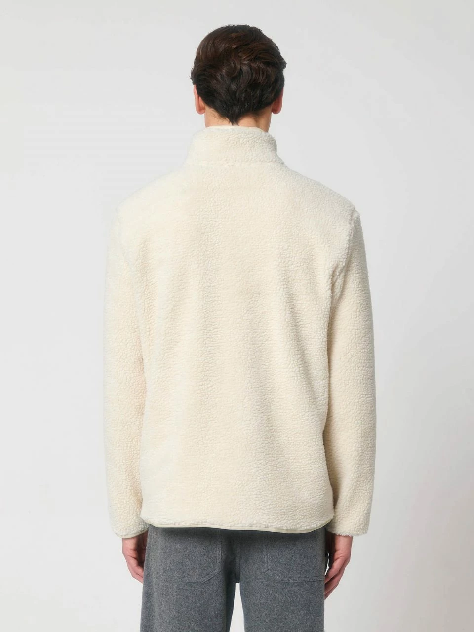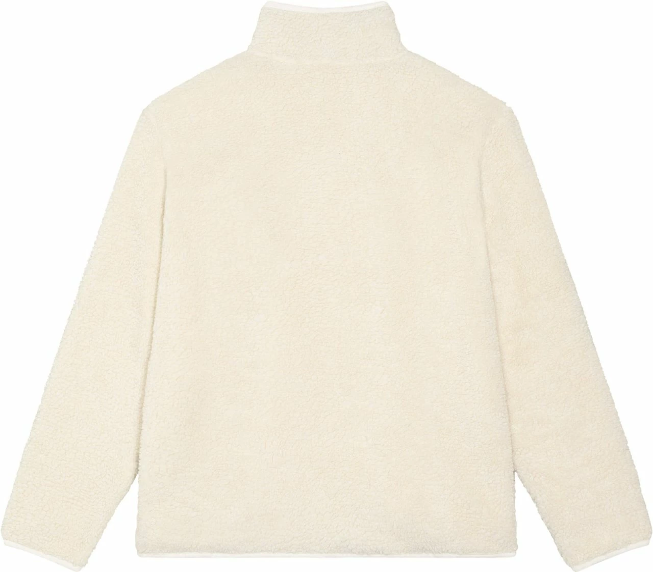Unisex Sherpa-Jacke aus recyceltem Polyester. Die vegane Jacke ist gerade geschnitten und hat eine kuschlige Außenseite im Schaffell-Look. Der Nylon-Reißverschluss reicht bis zum hoch abschließenden Kragen, sodass der Hals vor Wind geschützt ist. Die Jacke bietet außen zwei Eingrifftaschen mit Reißverschluss. Die Ärmel schließen mit schmalen Bündchen ab. Das Futter besteht am Körper aus atmungsaktivem Mesh, in den Ärmeln aus glattem Taft.