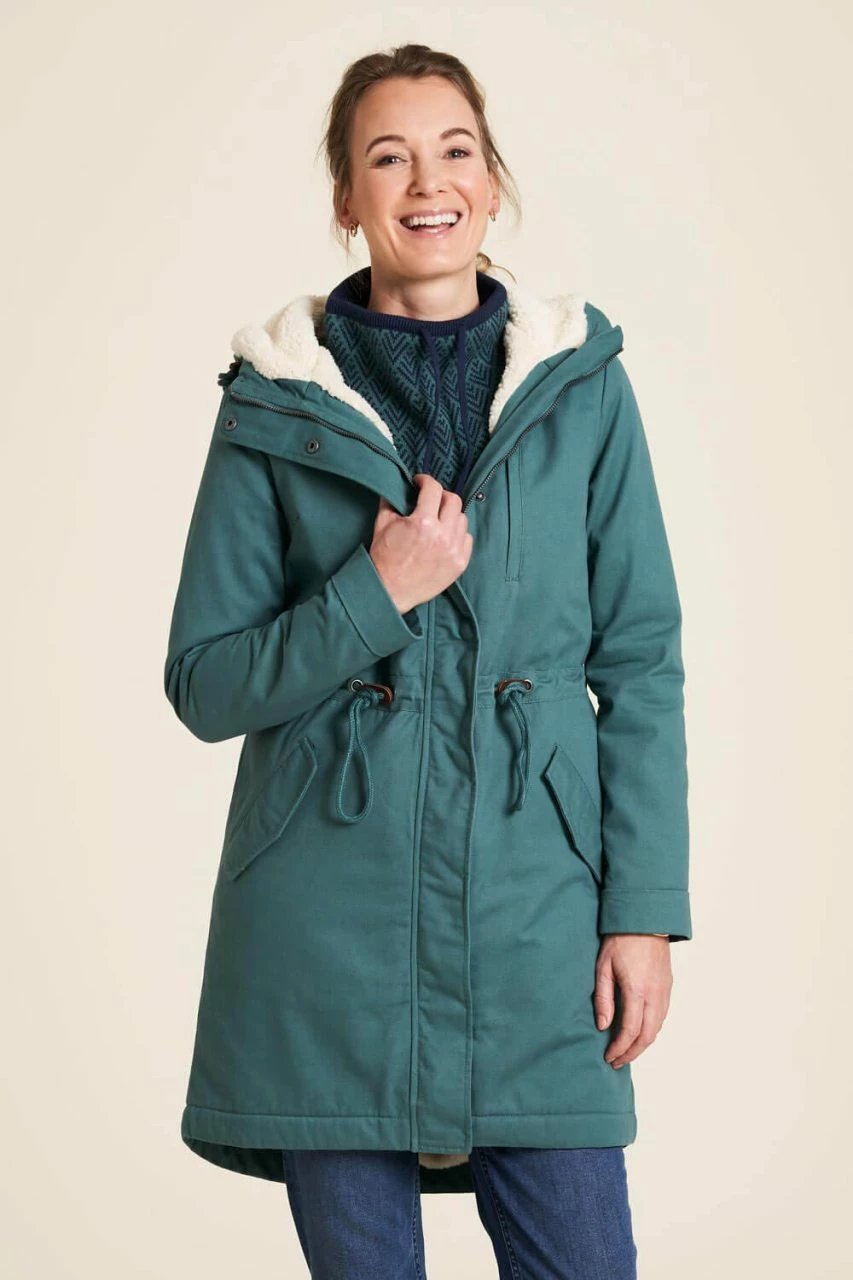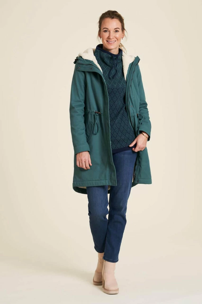 Der schöne Wintermantel mit Sherpa-Futter wird unter fairen Bedingungen hergestellt. Entlang der gesamten textilen Produktionskette werden Sicherheits- und Hygienebedingungen, faire Löhne und schadstoffarme Herstellung konsequent sichergestellt.