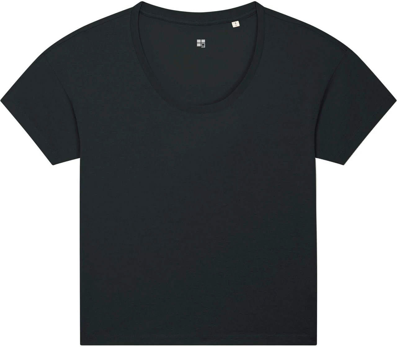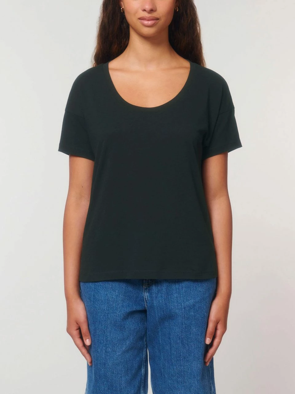 Locker sitzendes T-Shirt aus reiner Bio-Baumwolle. Das Shirt hat einen weiten und geraden Schnitt mit überschnittenen Ärmelansätzen. Der runde, etwas tiefer geschnittene Halsausschnitt ist mit einem feinen Rippbündchen eingefasst. Der Single-Jersey Stoff ist angenehm weich und leicht.